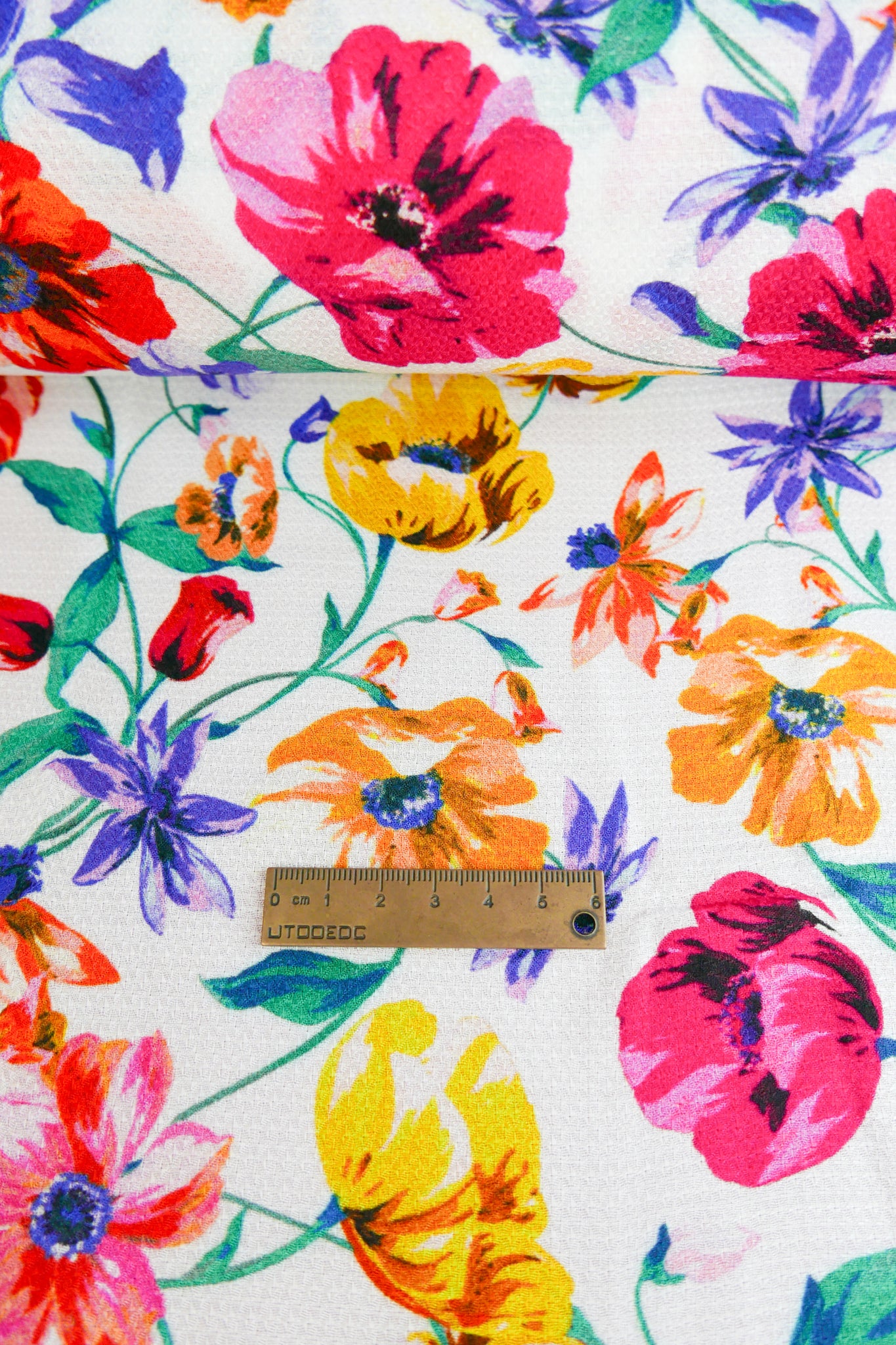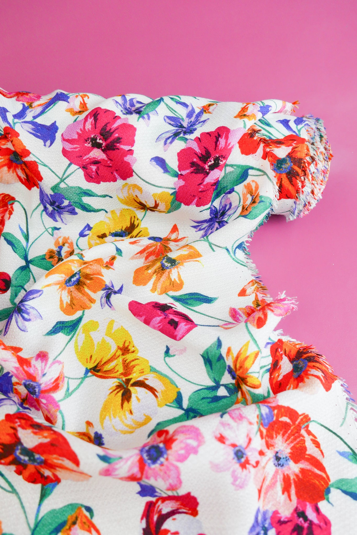 Aura is a vibrant viscose print featuring a colourful floral design on a pearly-white base cloth. Lightweight and mostly opaque, it has a beautiful, soft, textured handfeel and won't crease easily. Aura drapes beautifully, making for perfect statement tops, dresses, flowy pants or skirts.