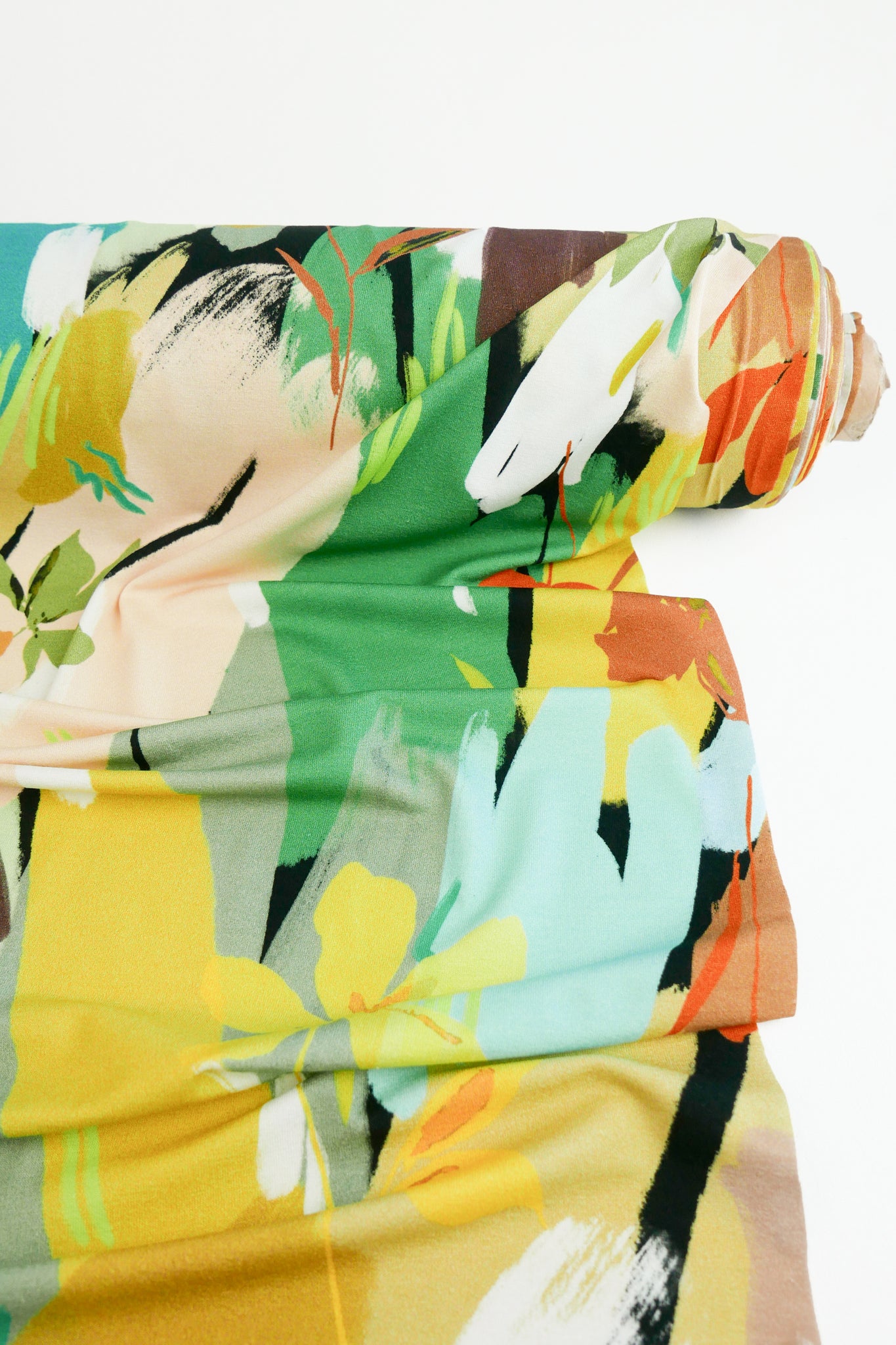 Paloma is an extravagant printed viscose knit in a turquoise colourway. Lightweight and full of drape, it's perfect to recreate those vintage DVF pieces. It features a vibrant print in various shades of yellow, green, blue and brown on an off-white base cloth. Anti-pill and anti-curl, Paloma is completely opaque with four-way stretch. It would make the perfect form-fitting dress, a colourful turtleneck layering piece, a show-stopping bias-cut piece or the cutest lounge set.