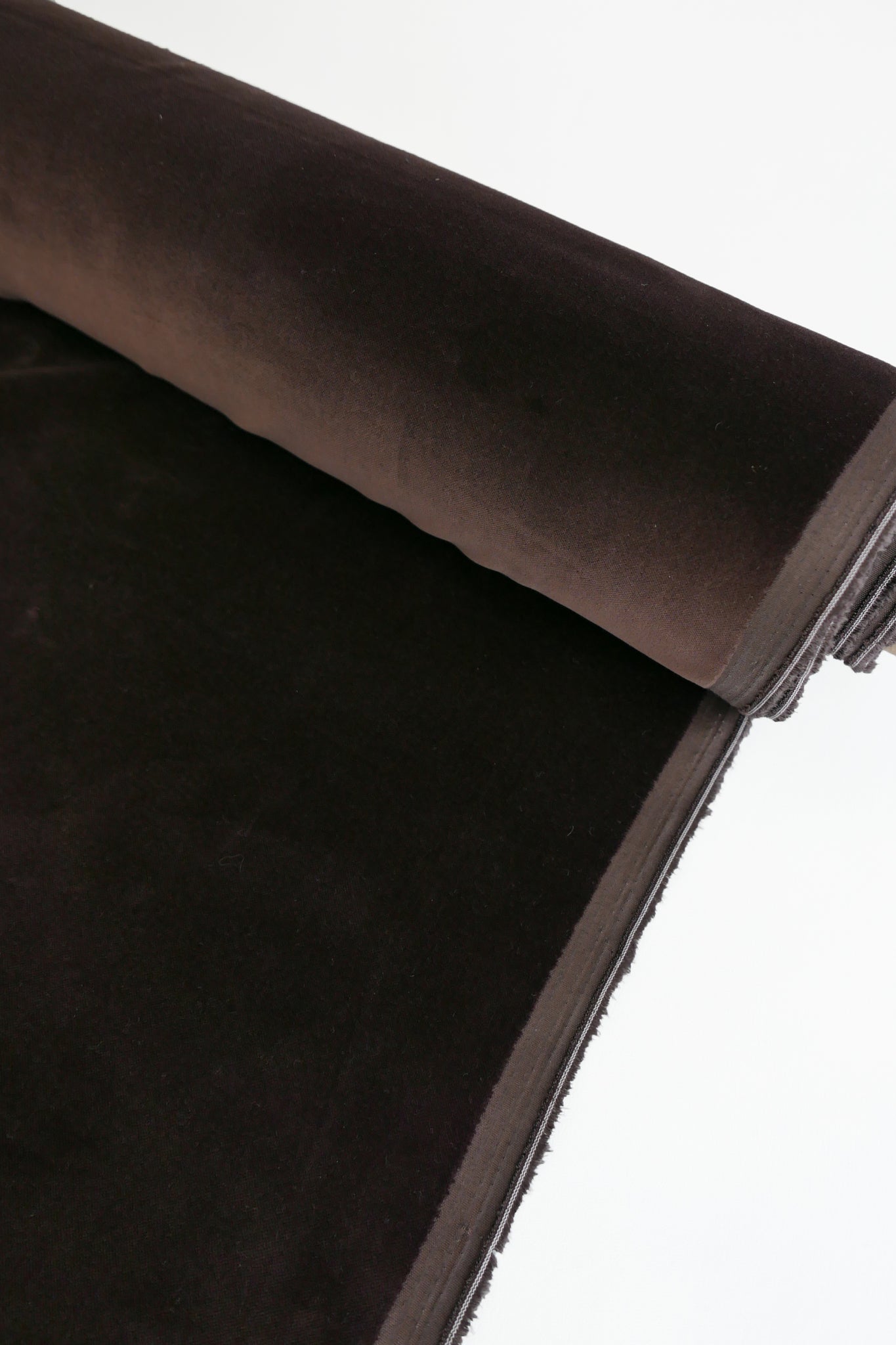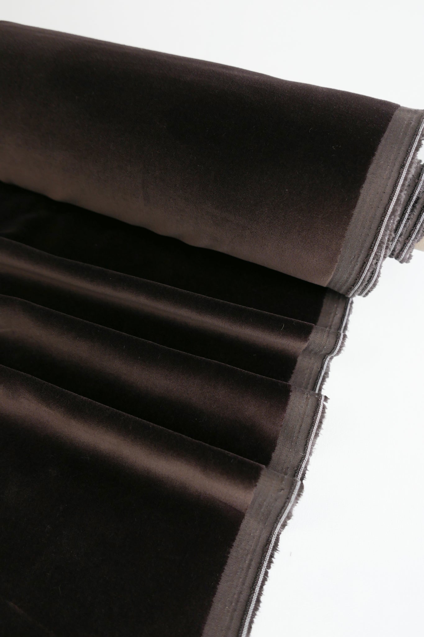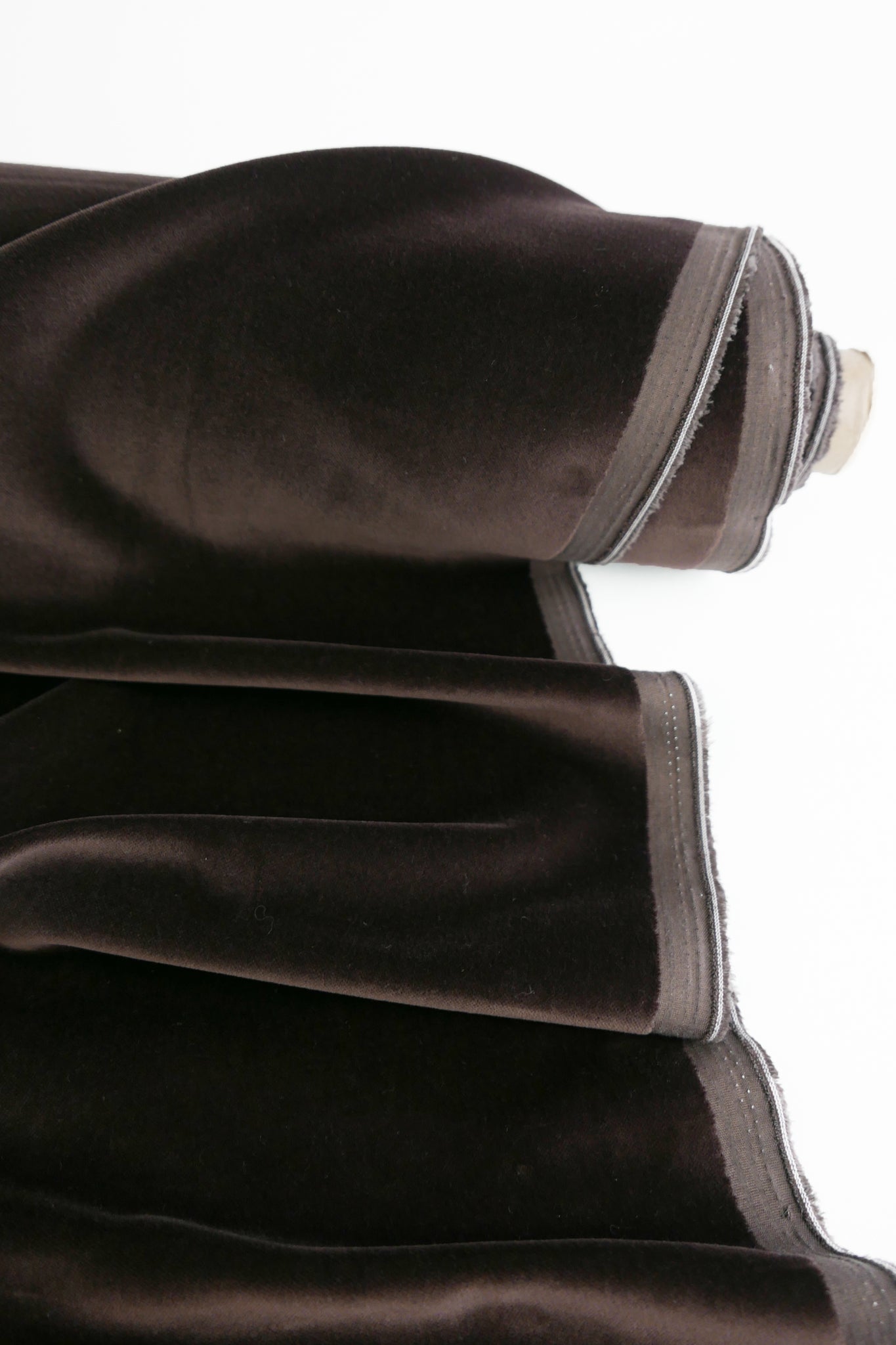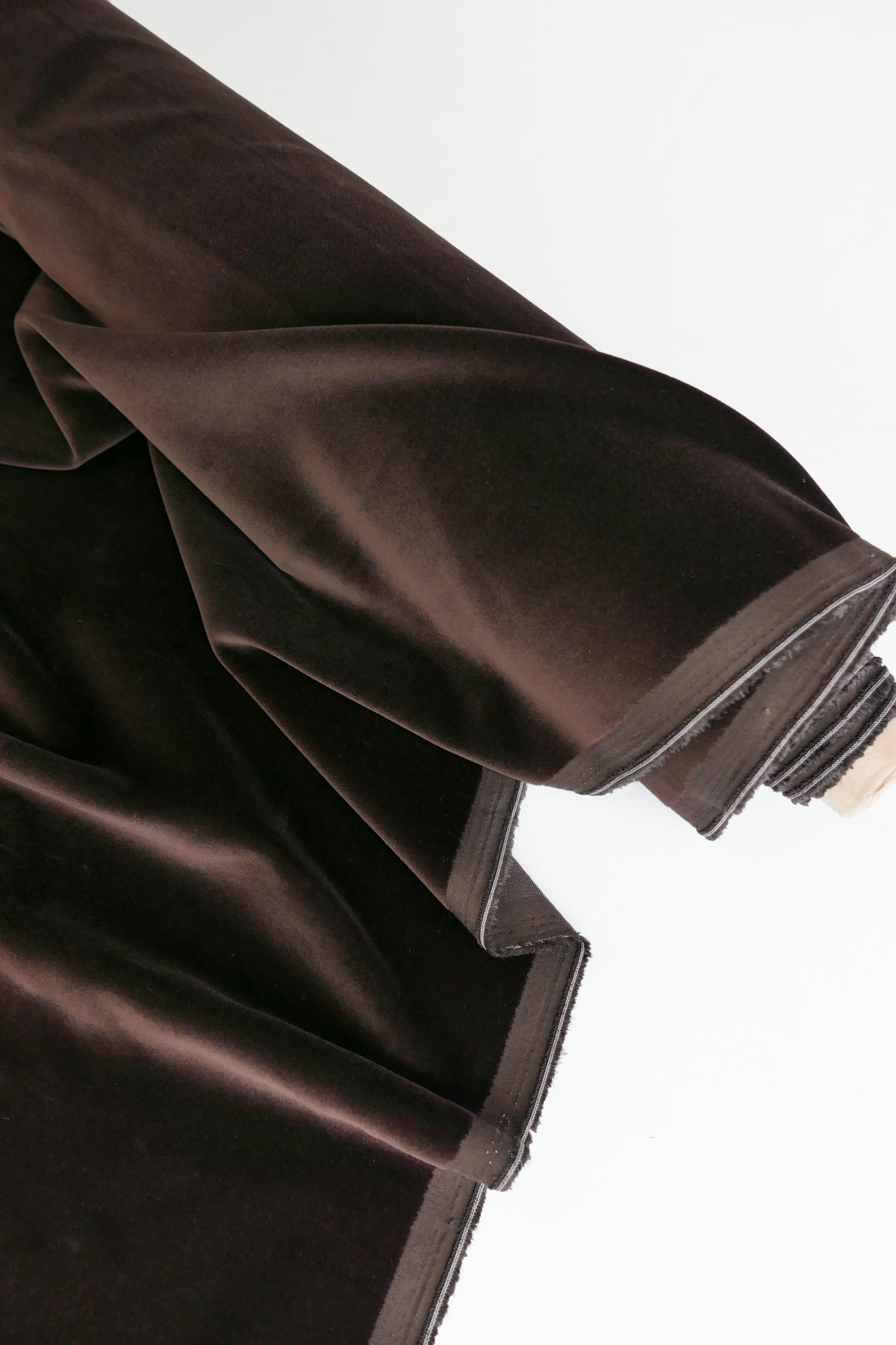 This incredibly soft velvet comes in a lush chocolate with a good balance of structure and drape. It's perfect for garments such as dresses, tops, luxurious pants, or lightweight jackets. It has a short yet noticeable pile and is woven on a matte base.