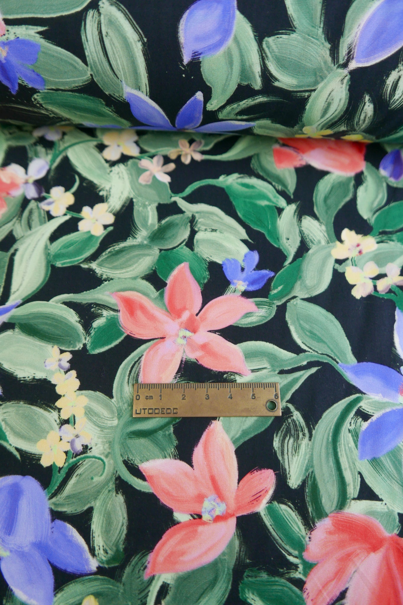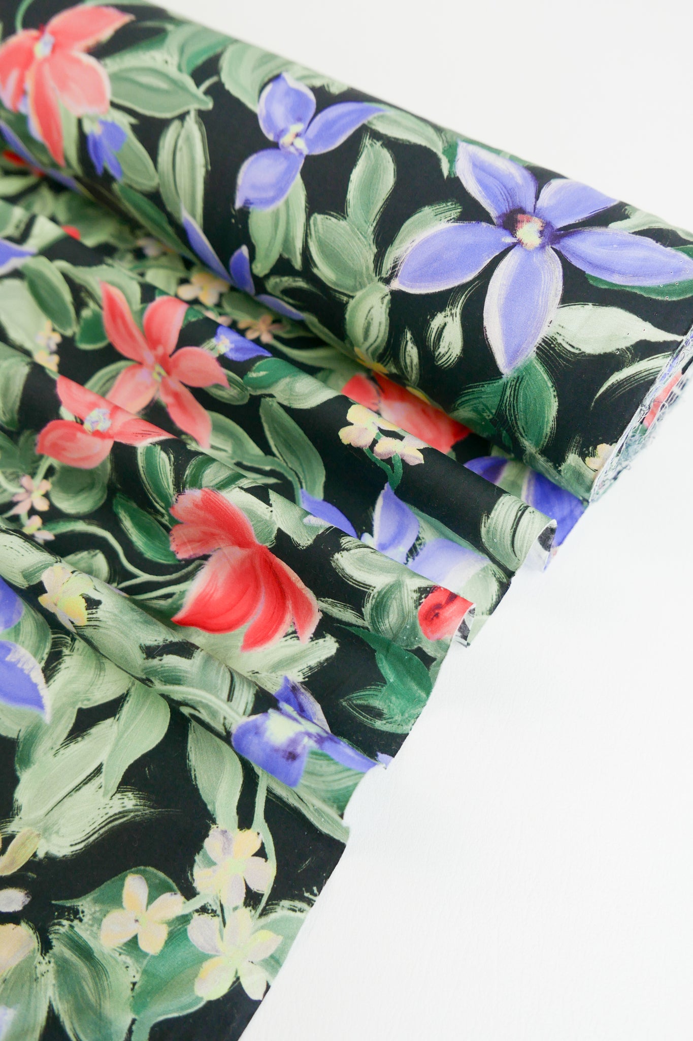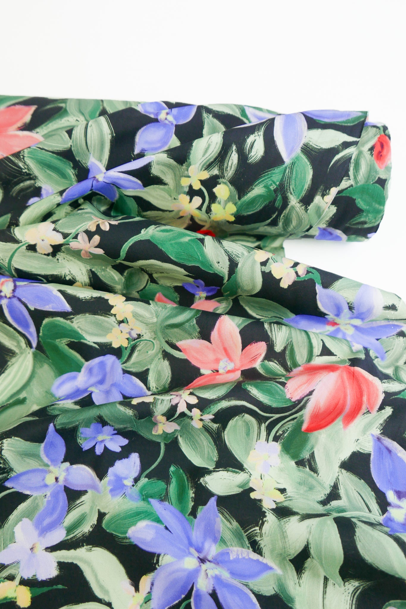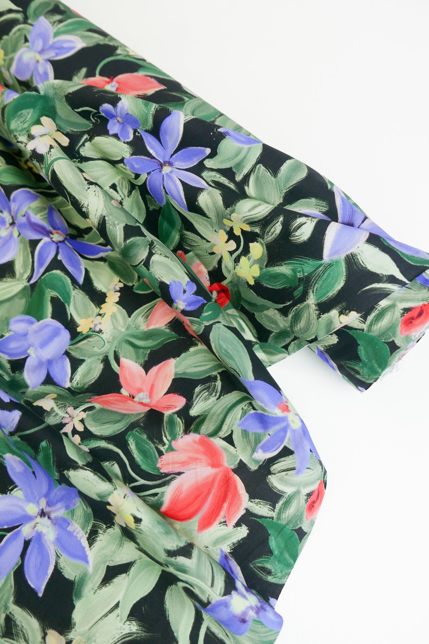 This is a beautiful, versatile cotton, featuring a floral print on a black base cloth. 100% cotton, it is lightweight and has a crisp hand feel. Completely opaque and holding soft structure, it would make into the perfect dress, shirt, skirt, or luxurious lining.