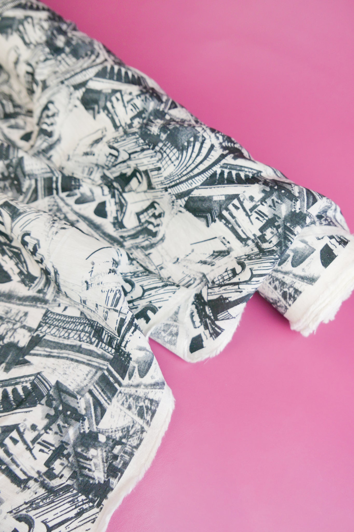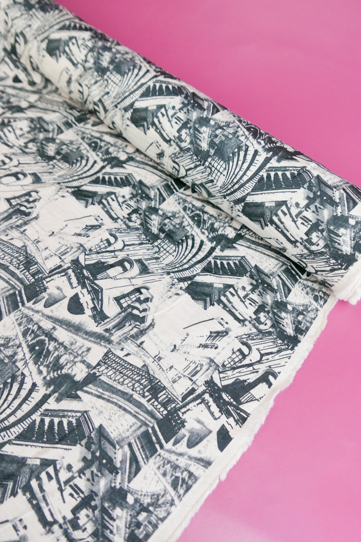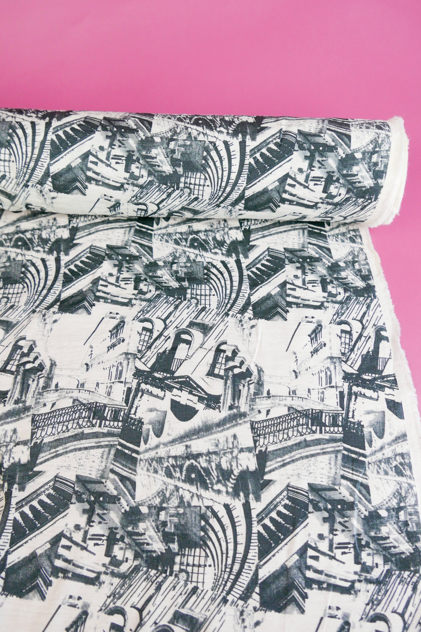 Amsterdam is a soft, viscose print featuring an abstract print of an old town in Europe. Lightweight and mostly opaque, Amsterdam is supremely soft, has excellent drape and is perfect for gathered blouses or dresses and skirts