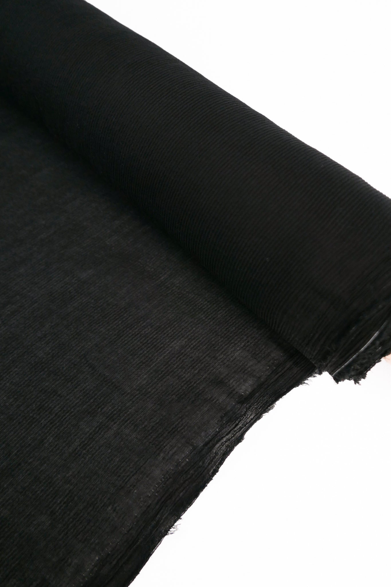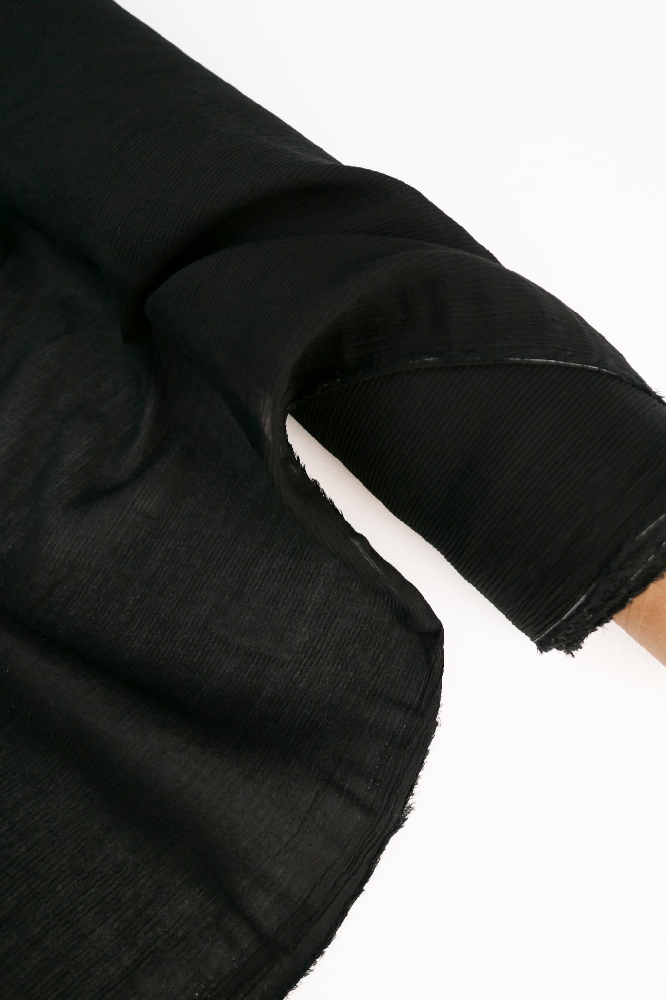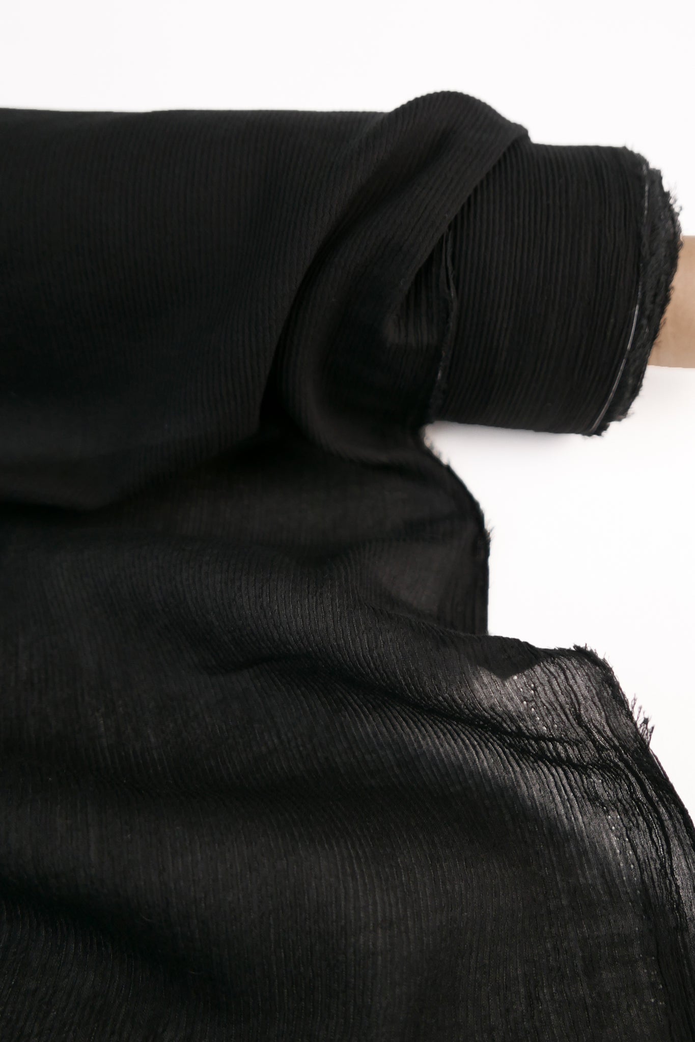 Nara is a beautifully textured rayon yoryu coming in black. A one-way knit, it has give along the crossgrain giving it added flexibility. Extremely lightweight and semi-sheer, it has excellent drape, and loads of texture and is perfect for gathered blouses or lined as a dress or skirt.