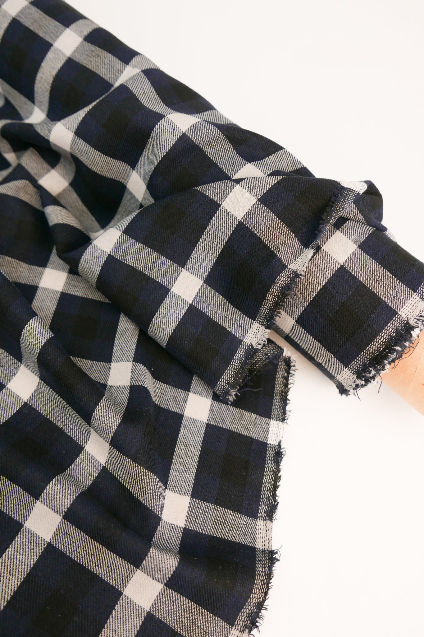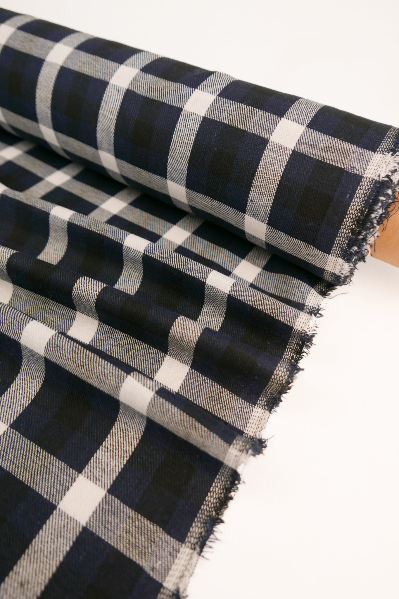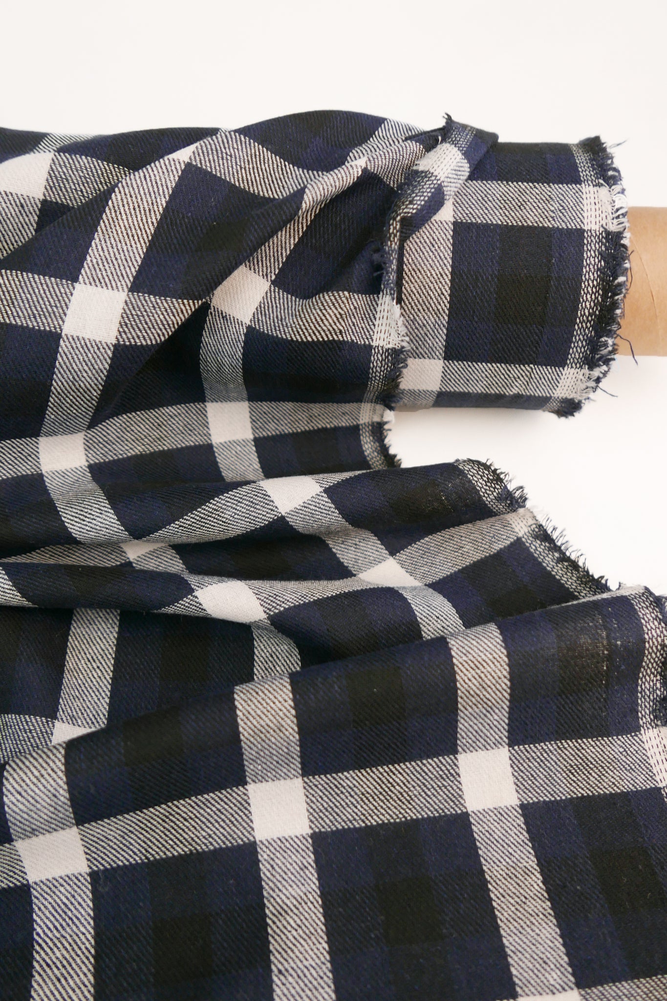 Ziggy is a lightweight flannel fabric with a check pattern in off-white, deep blue and black. The face side is brushed, enhancing softness and emphasising the twill weave. Constructed with a loose weave and gauze-like hand, it offers excellent drape and breathability. Ideal for cold-weather garments, Ziggy is well-suited for winter blouses, as well as lined skirts and dresses where softness and drape are desired.