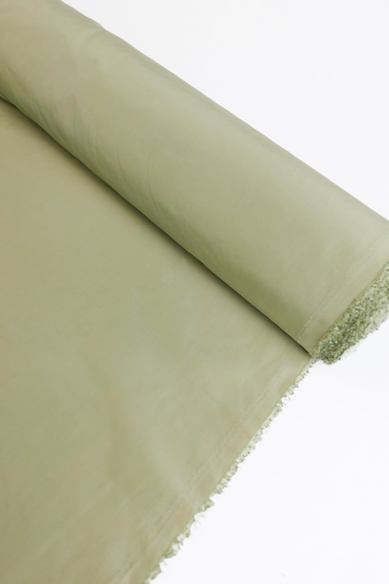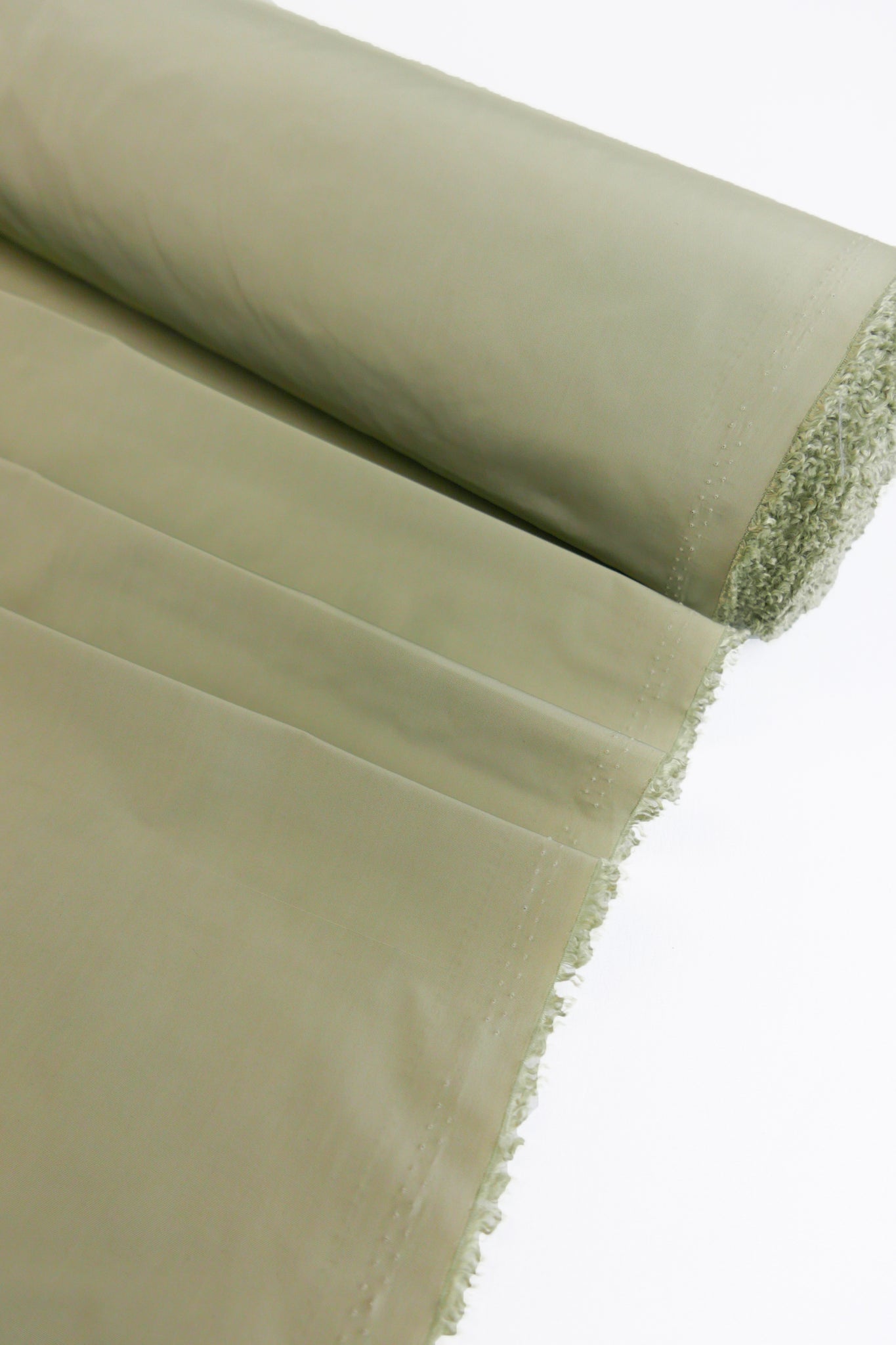 Aqua is a unique showerproof taffeta in a sage colourway. Woven with a memory yarn, this fabric holds plenty of structure, folds and scrunches well, and is completely opaque. Take advantage of this matte memory yarn by creating structured pieces such as trench coats, pleated skirts, corsets or couture styles.
