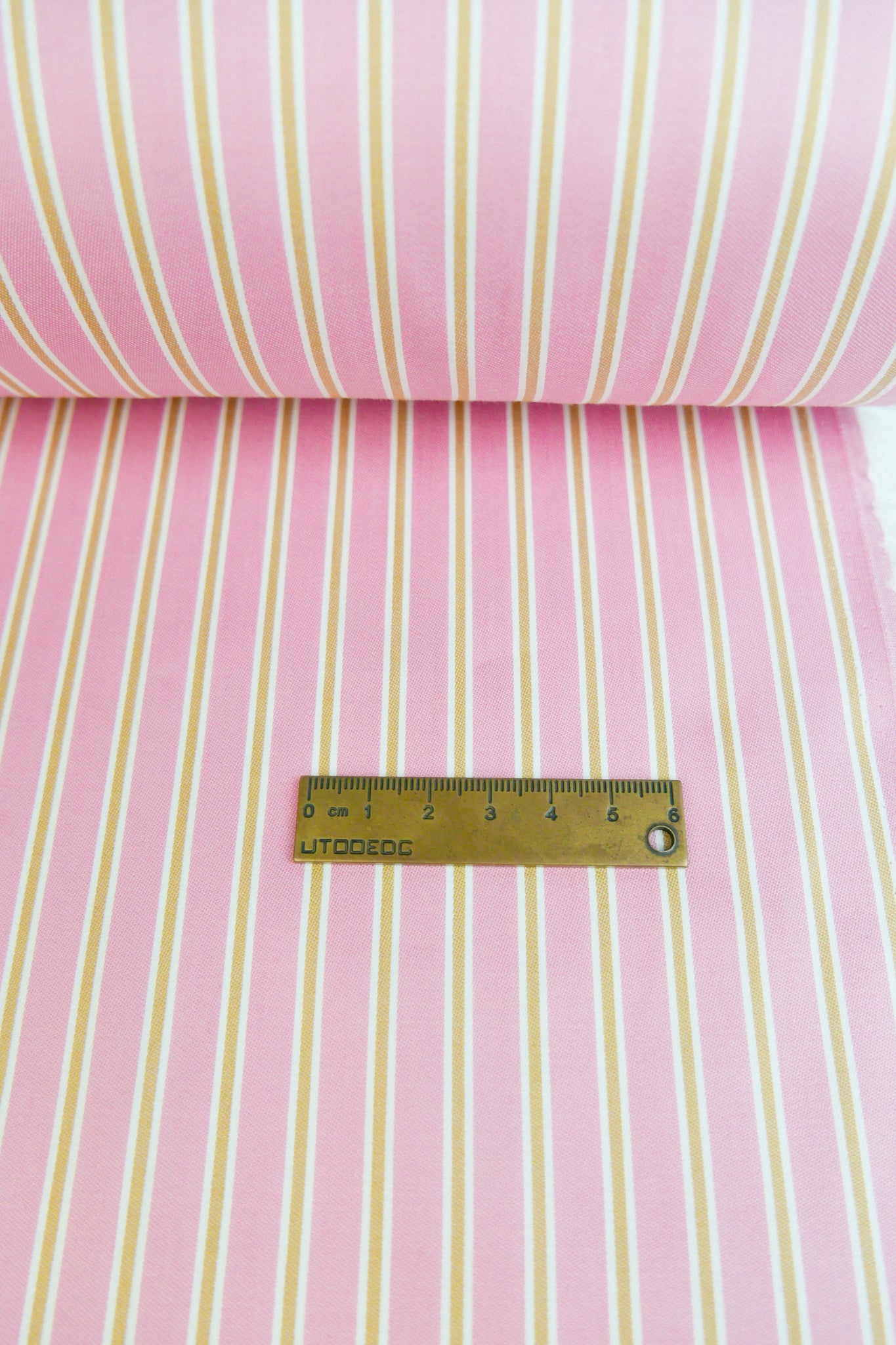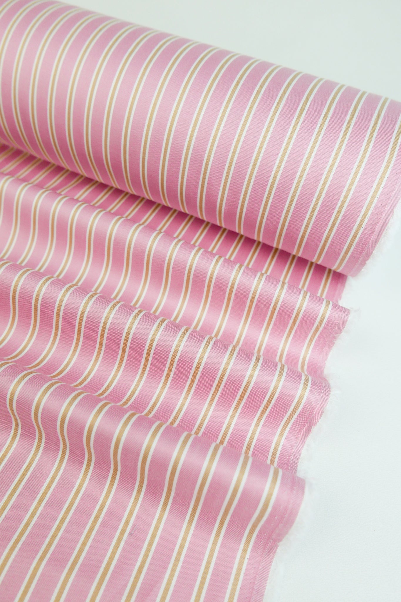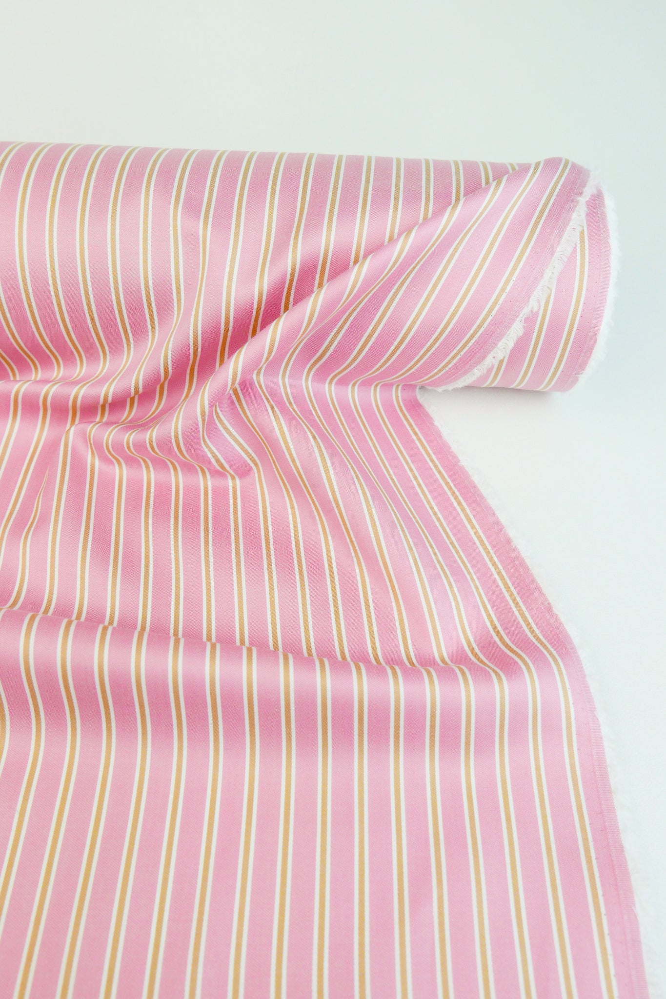 Asami is 100% cotton sateen from the finest shirting manufacturers in Japan. It comes in a classic yarn-dyed stripe design in pink, off-white and tan. Lightweight and completely opaque, Asami holds beautiful, structured drape, and will make into beautiful silhouettes with gathers, puffs and volume. This yarn-dyed cotton would make a beautiful shirt, summer-weight pant, skirt, dress or even striking bedwear.