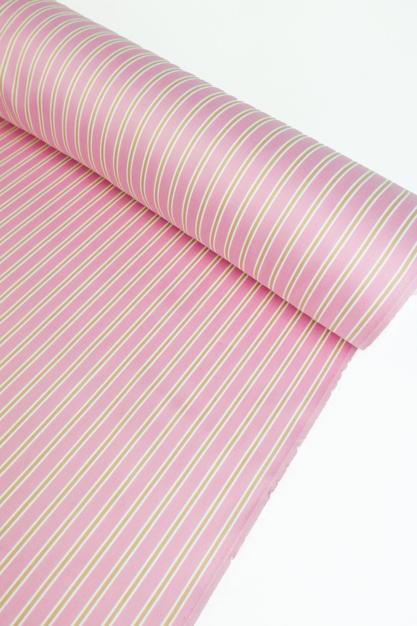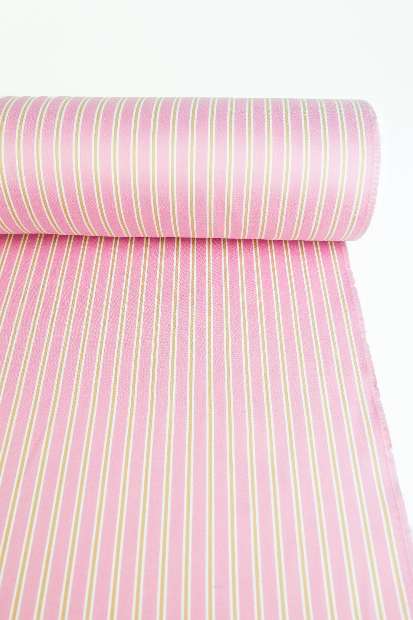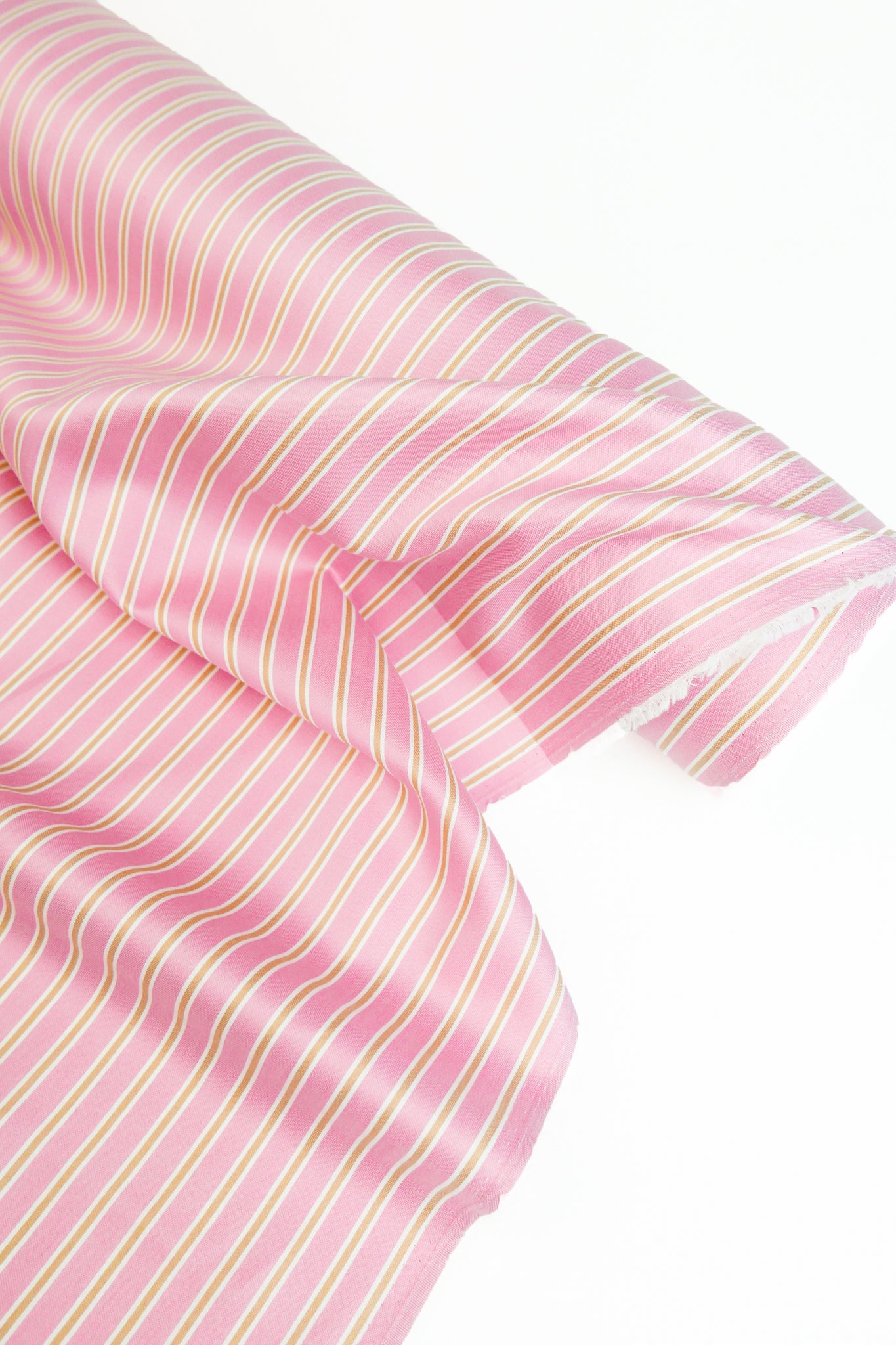 Asami is 100% cotton sateen from the finest shirting manufacturers in Japan. It comes in a classic yarn-dyed stripe design in pink, off-white and tan. Lightweight and completely opaque, Asami holds beautiful, structured drape, and will make into beautiful silhouettes with gathers, puffs and volume. This yarn-dyed cotton would make a beautiful shirt, summer-weight pant, skirt, dress or even striking bedwear.