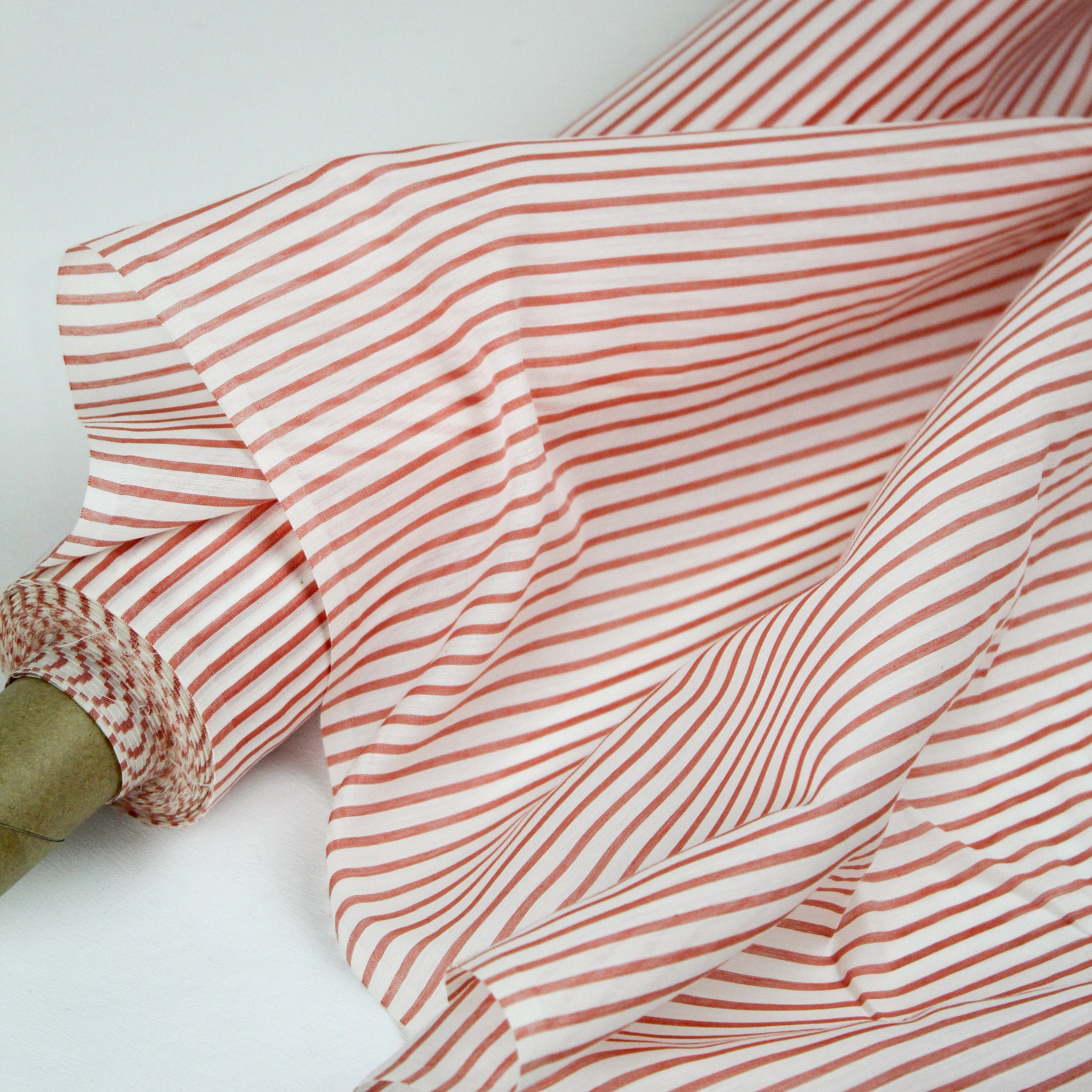 Ramiro is a delightful silk cotton with a yarn dyed stripe in strawberry pink and off white. It's light and airy with a gentle structure and is semi sheer. It would gather beautifully, and make a stunning blouse or lined skirt.