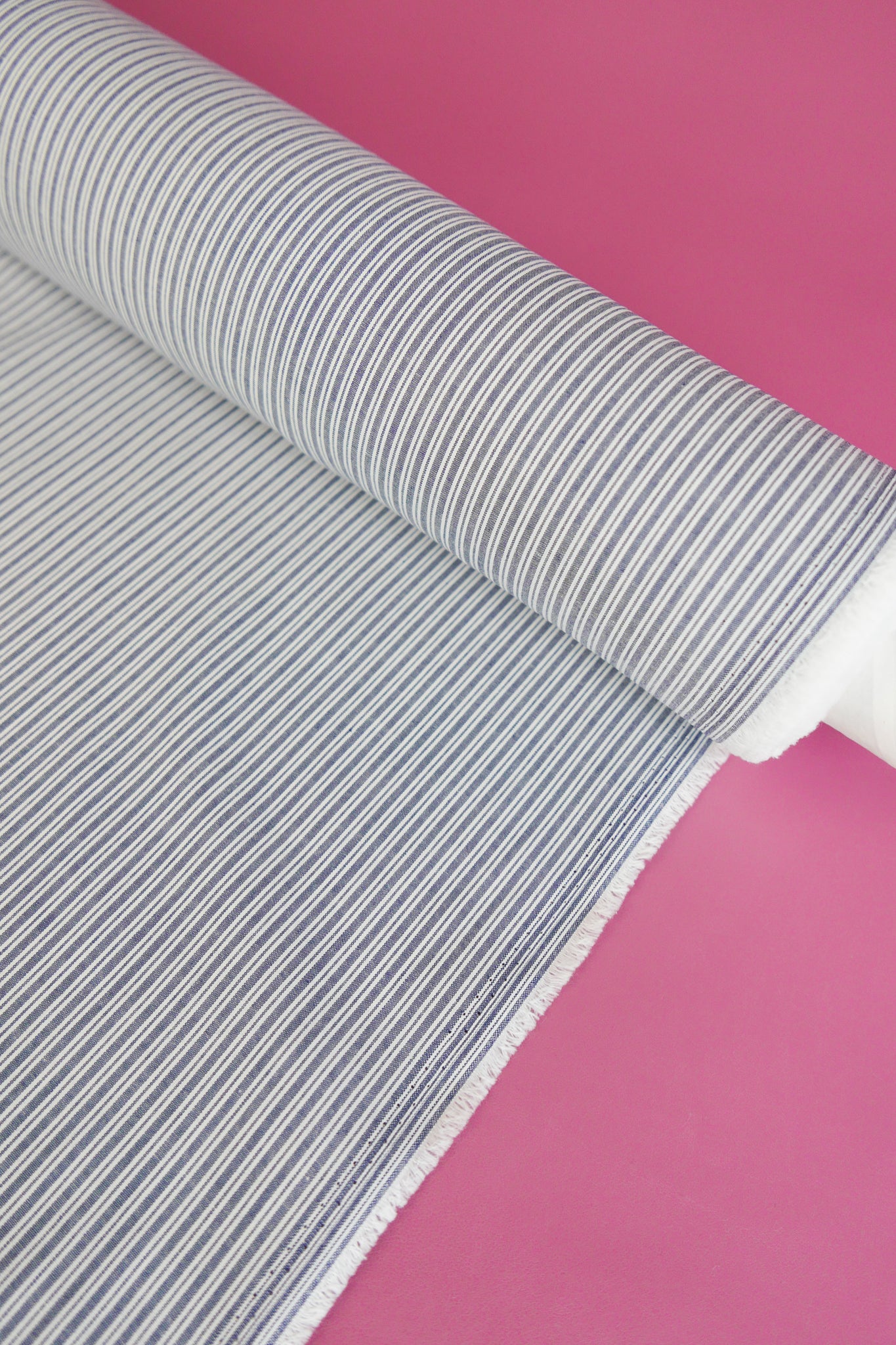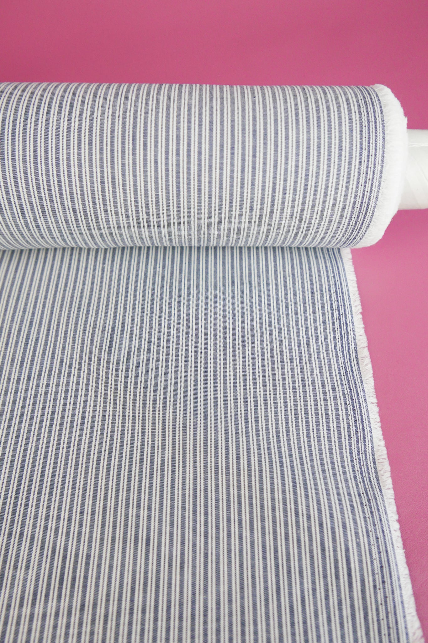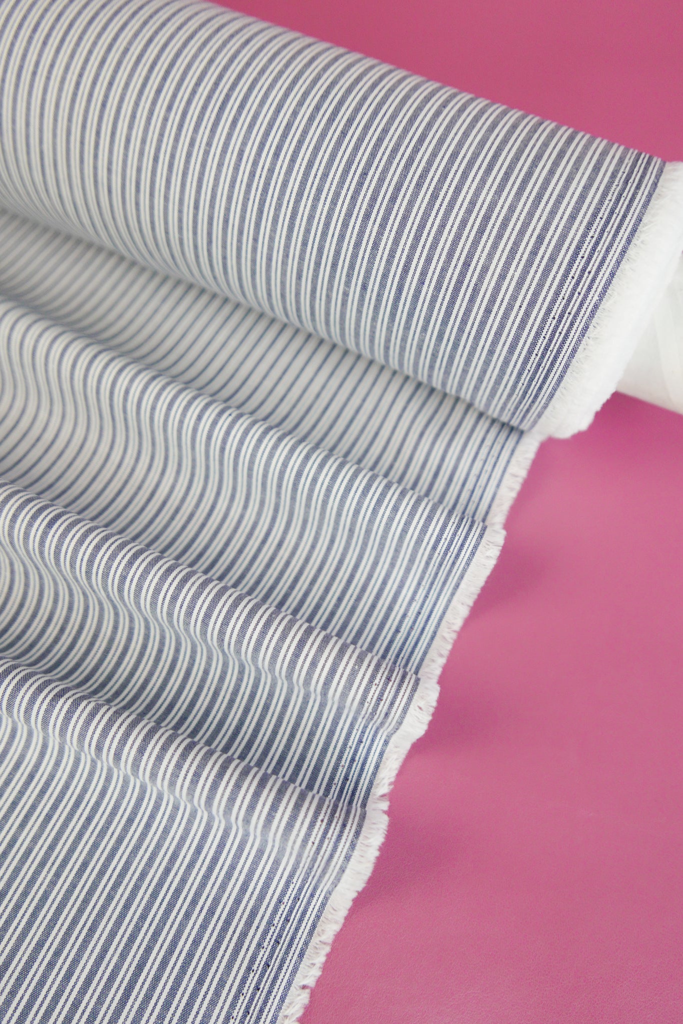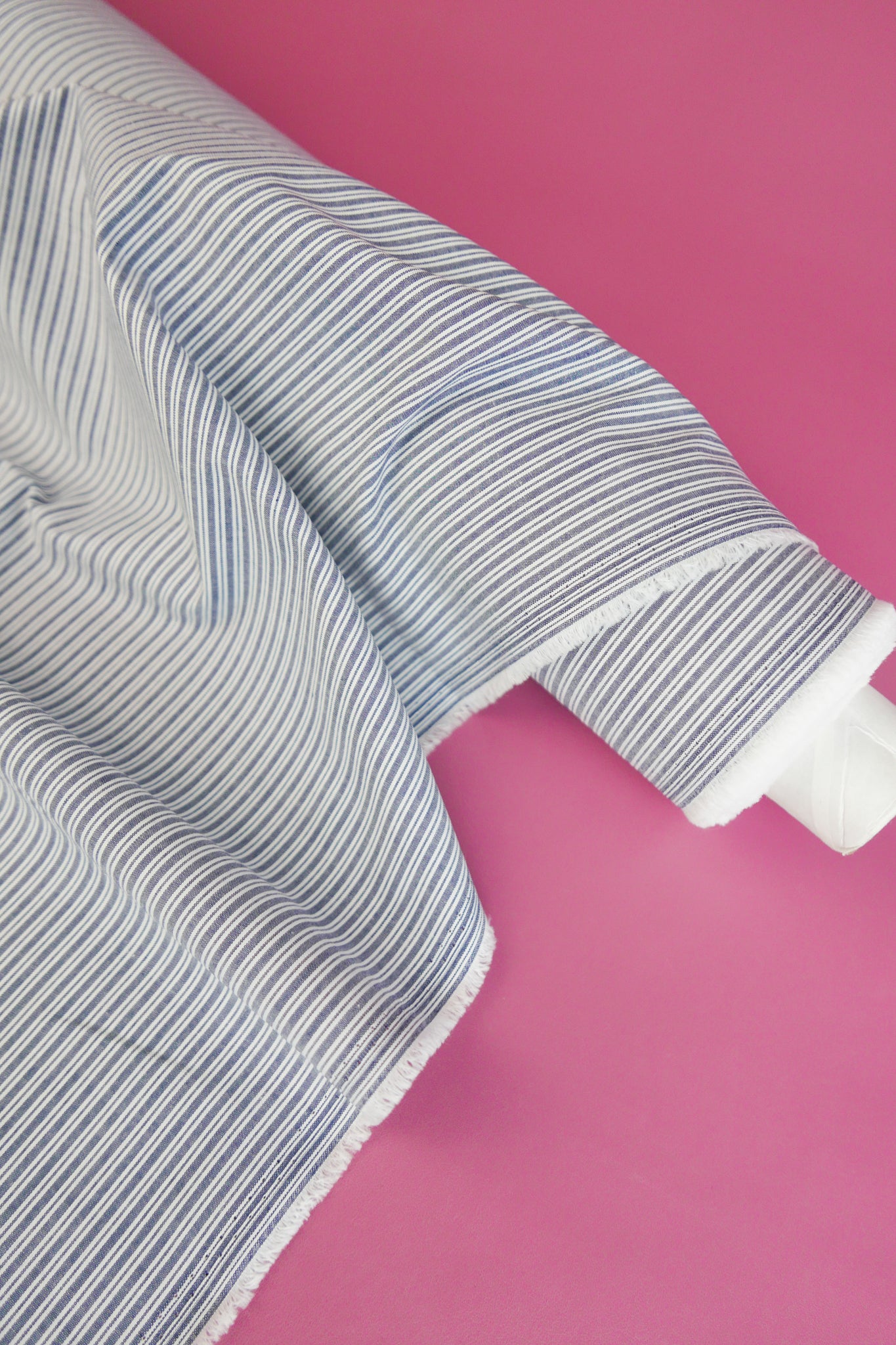 Aidan is a pure cotton shirting coming in a classic yarn-dyed stripe design in navy on an off-white cloth. Lightweight and completely opaque, Aidan holds good structure and will make into beautiful silhouettes with gathers, puffs and volume. This yarn-dyed cotton would make a beautiful shirt, summer-weight pant, skirt or dress.