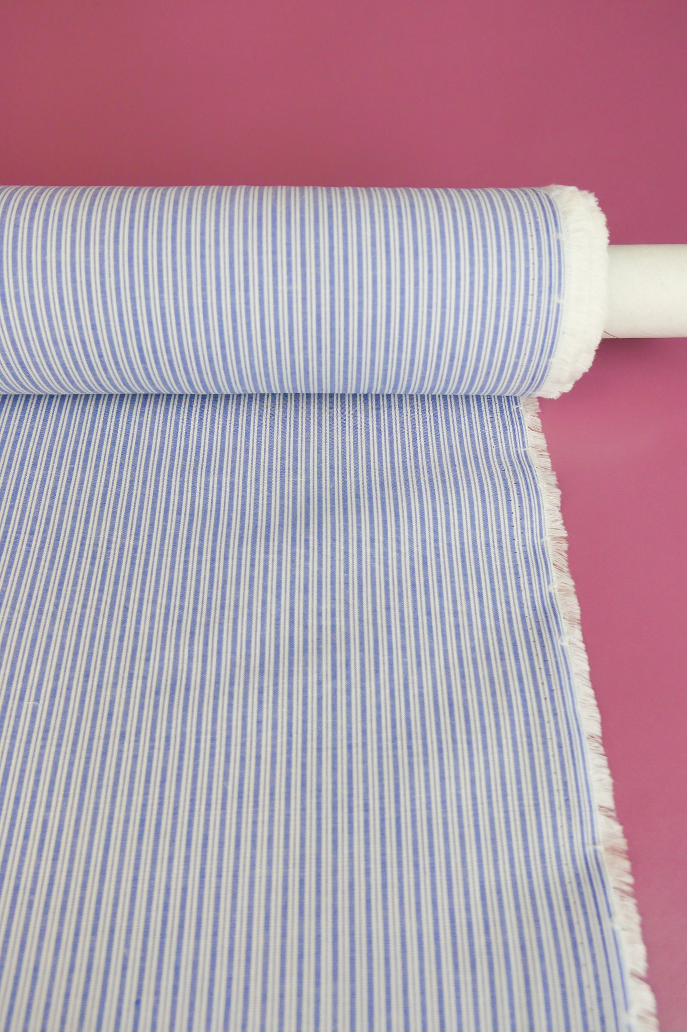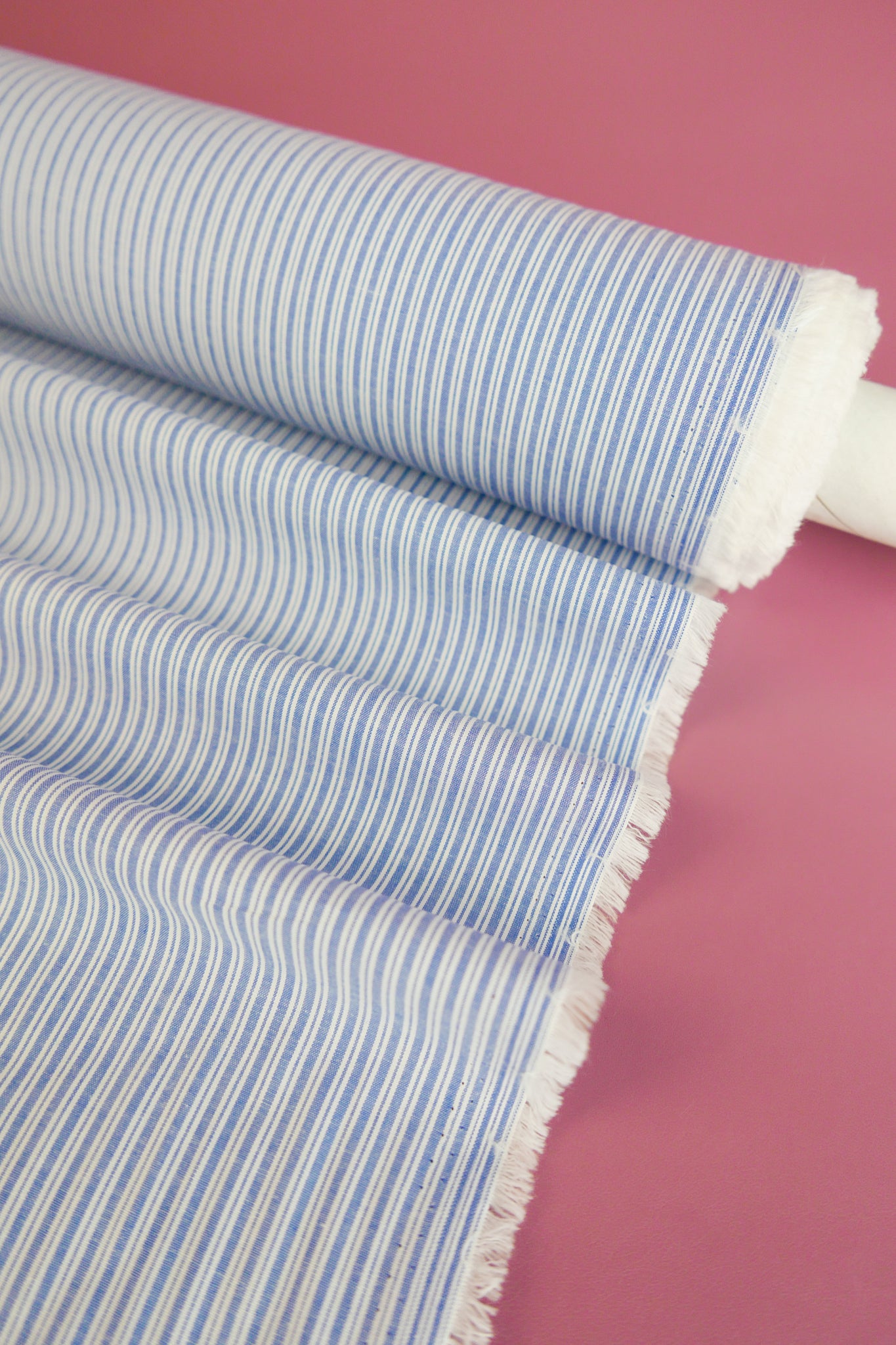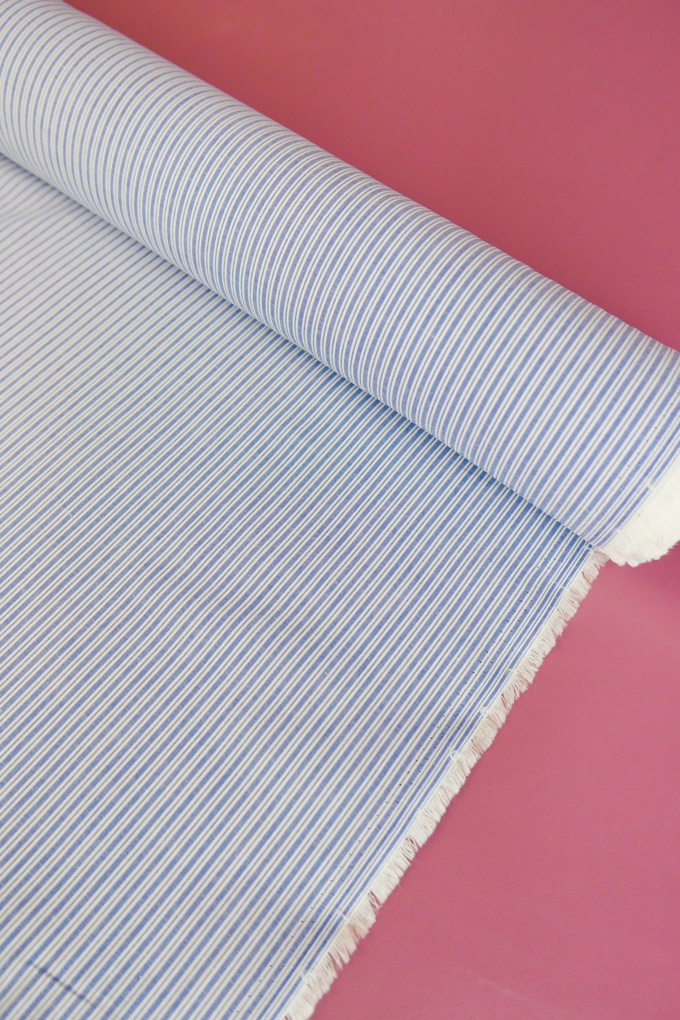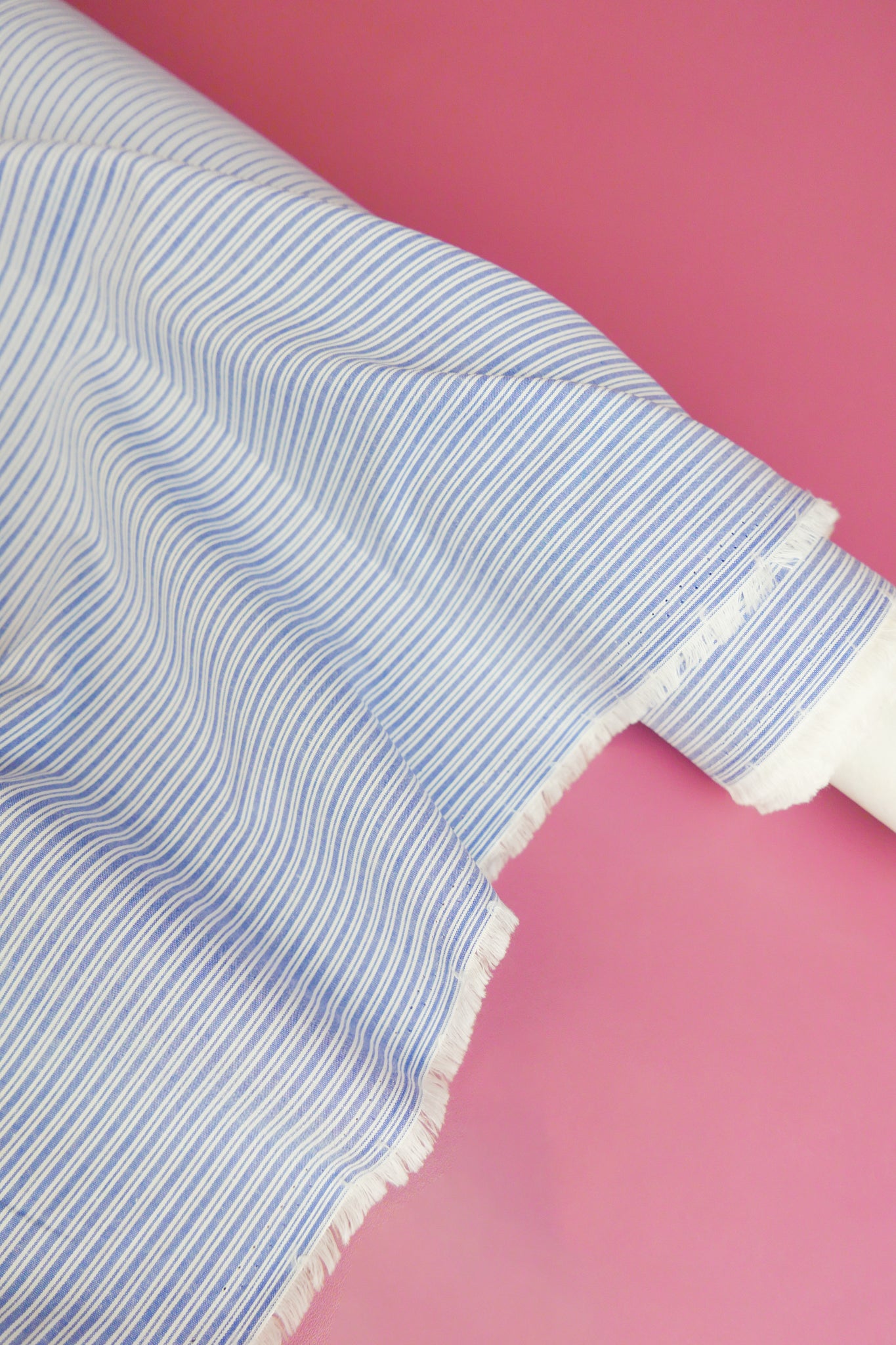 Aidan is a pure cotton shirting coming in a classic yarn-dyed stripe design in sky blue on an off-white cloth. Lightweight and completely opaque, Aidan holds good structure and will make into beautiful silhouettes with gathers, puffs and volume. This yarn-dyed cotton would make a beautiful shirt, summer-weight pant, skirt or dress.