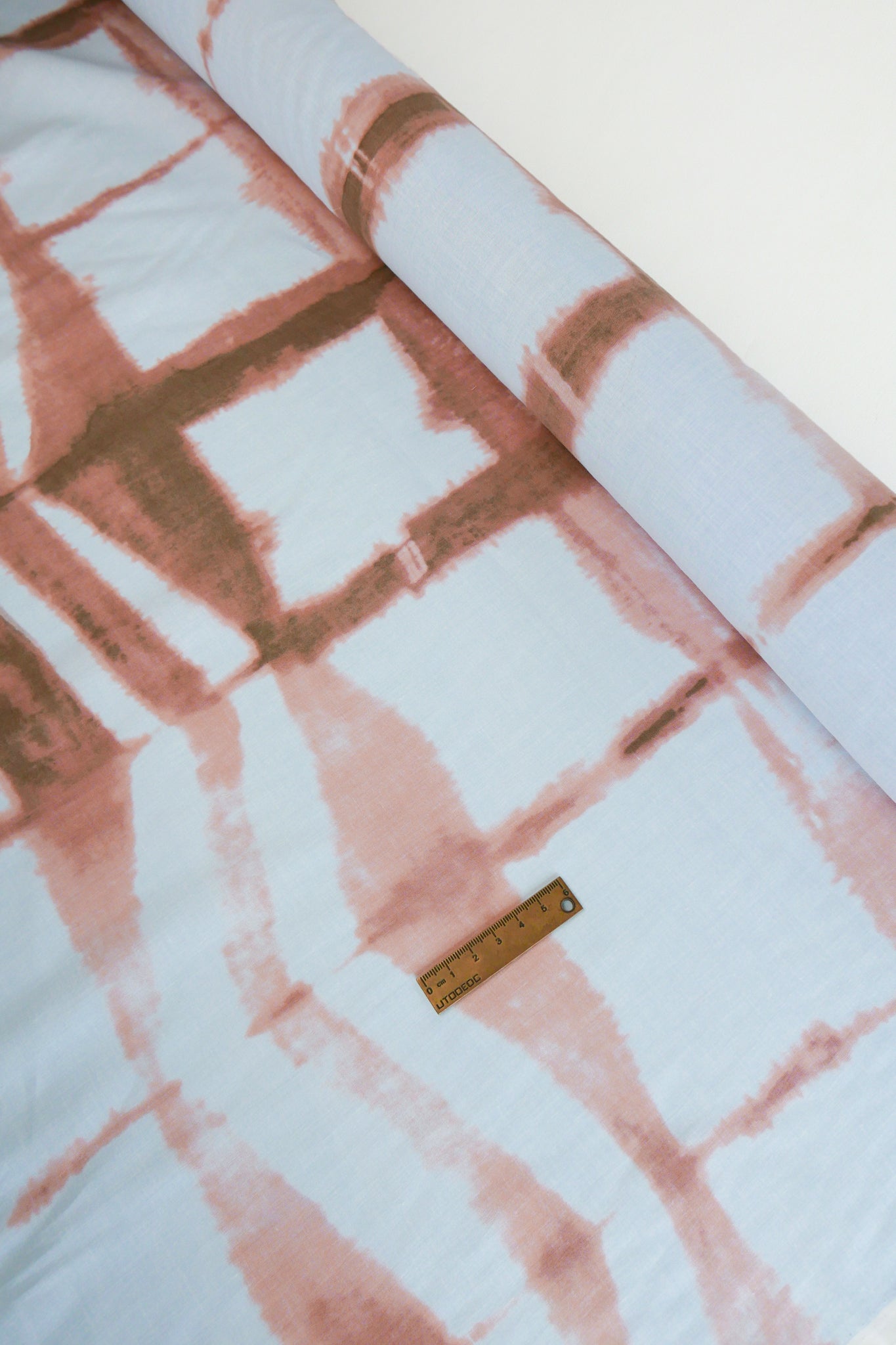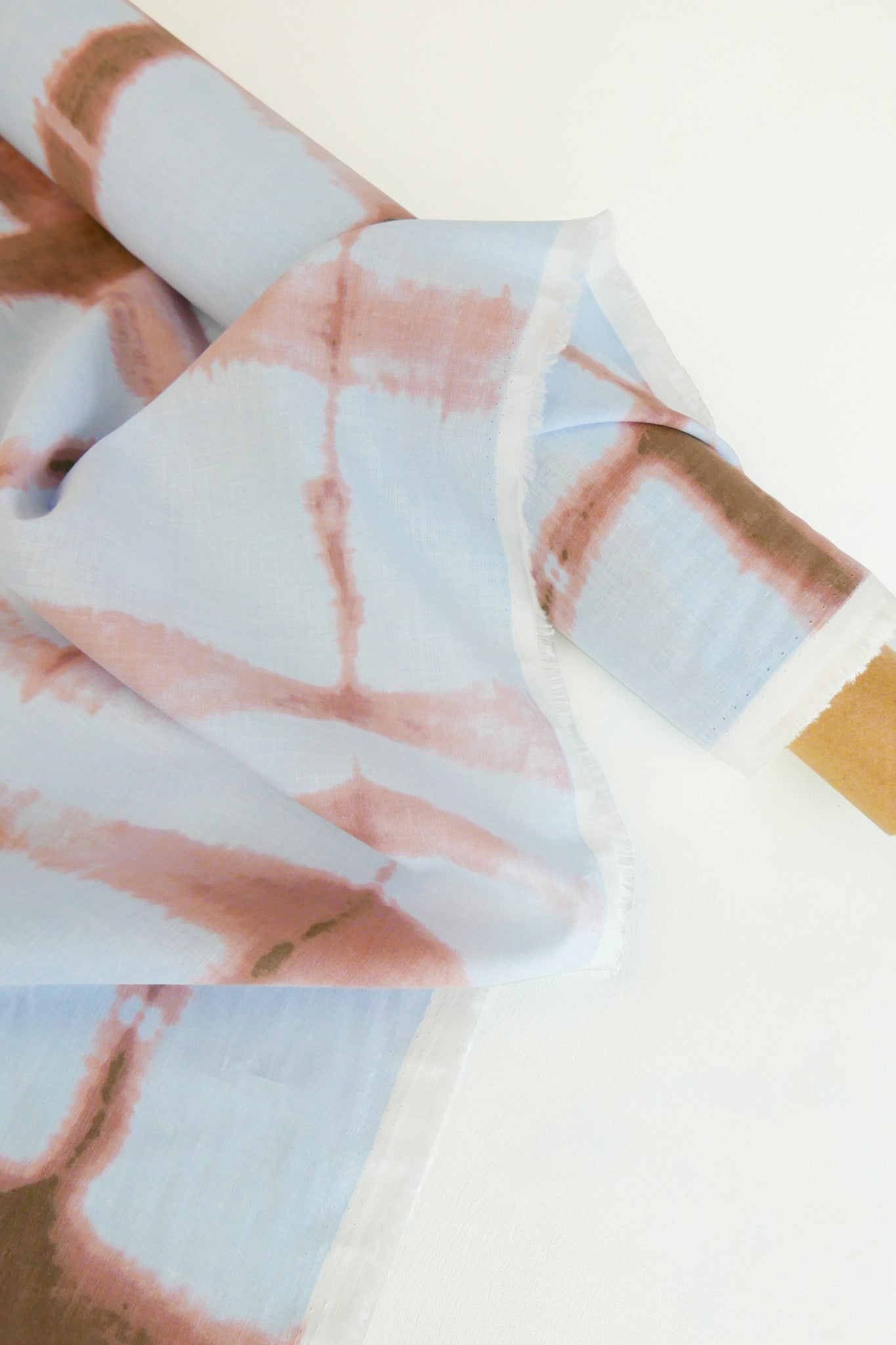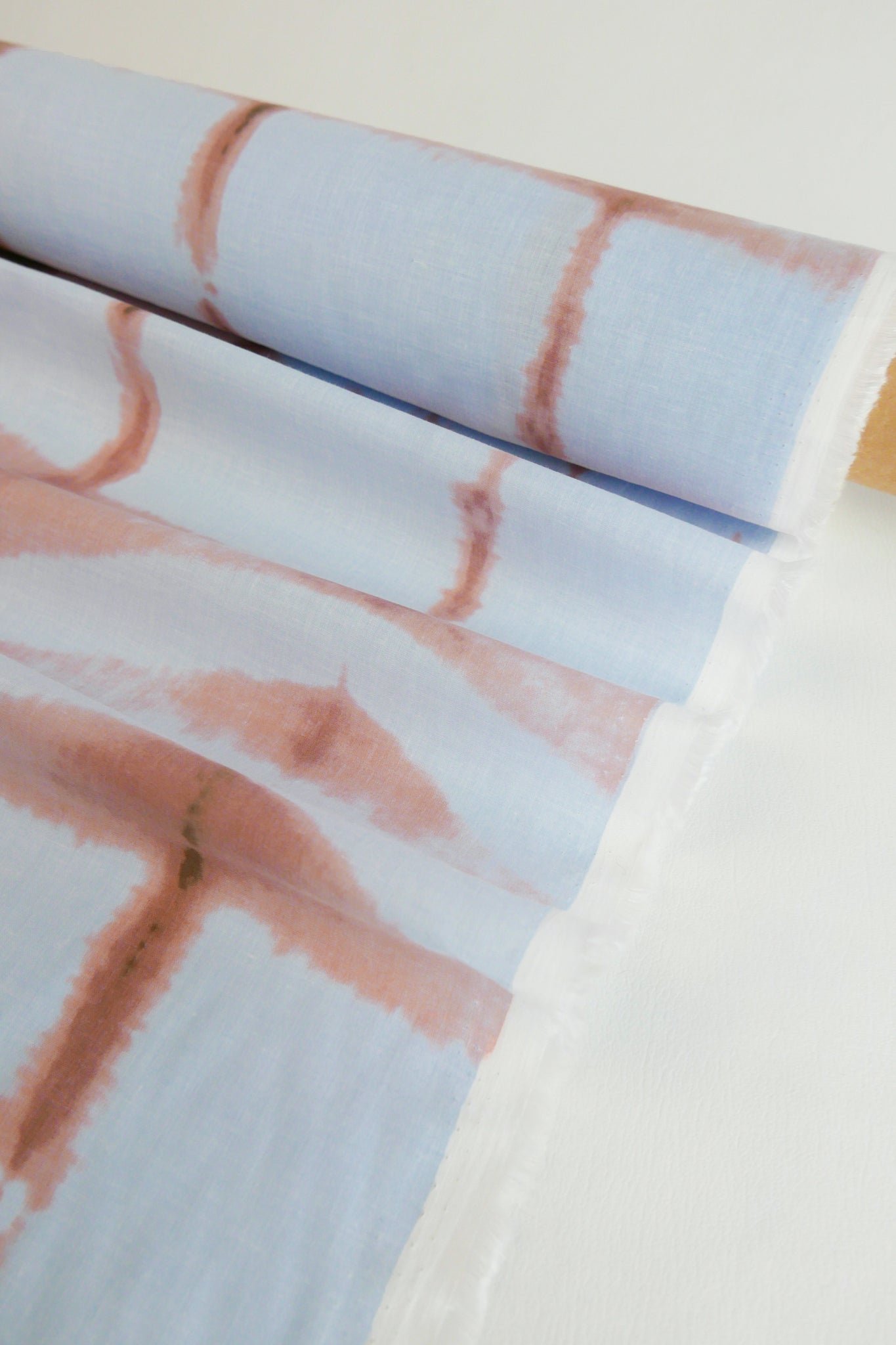 Aurora is the cotton alternative to our popular tie-dyed linen, Leopold. Aurora is a lightweight cotton voile with a beautifully soft hand feel, featuring a tie-dye-like design in a refreshing colour palette of peach against a sky blue cloth. Lovely and lightweight, it has a soft silhouette while still retaining body and is mostly opaque. Aurora would make a perfect skirt, dress or shirt.