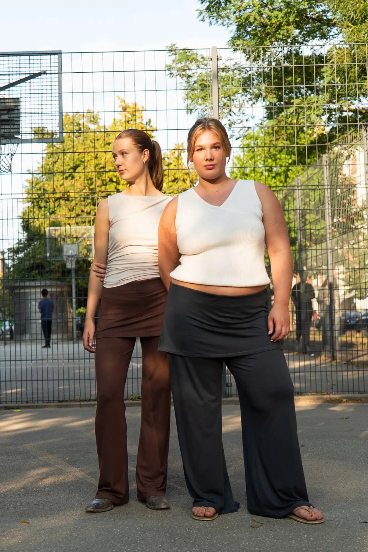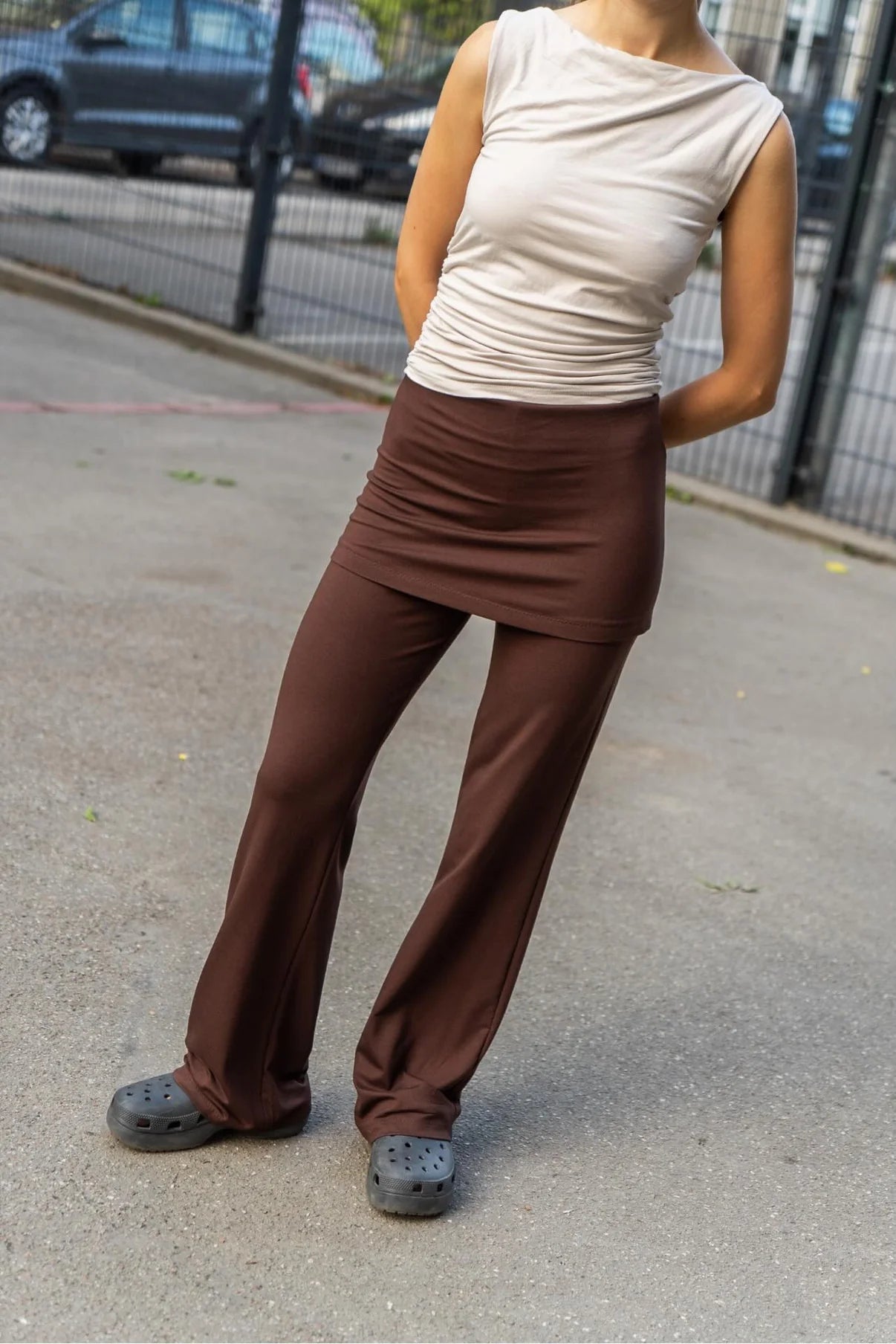 The SKIRTY pants are a pair of loose-fitting trousers made from jersey fabric. They feature an elastic waistband, designed to also accommodate an optional skirt attachment - creating the appearance of a skirt worn over the pants. The pants are fitted at the waist and gently flare out at the ankles.
