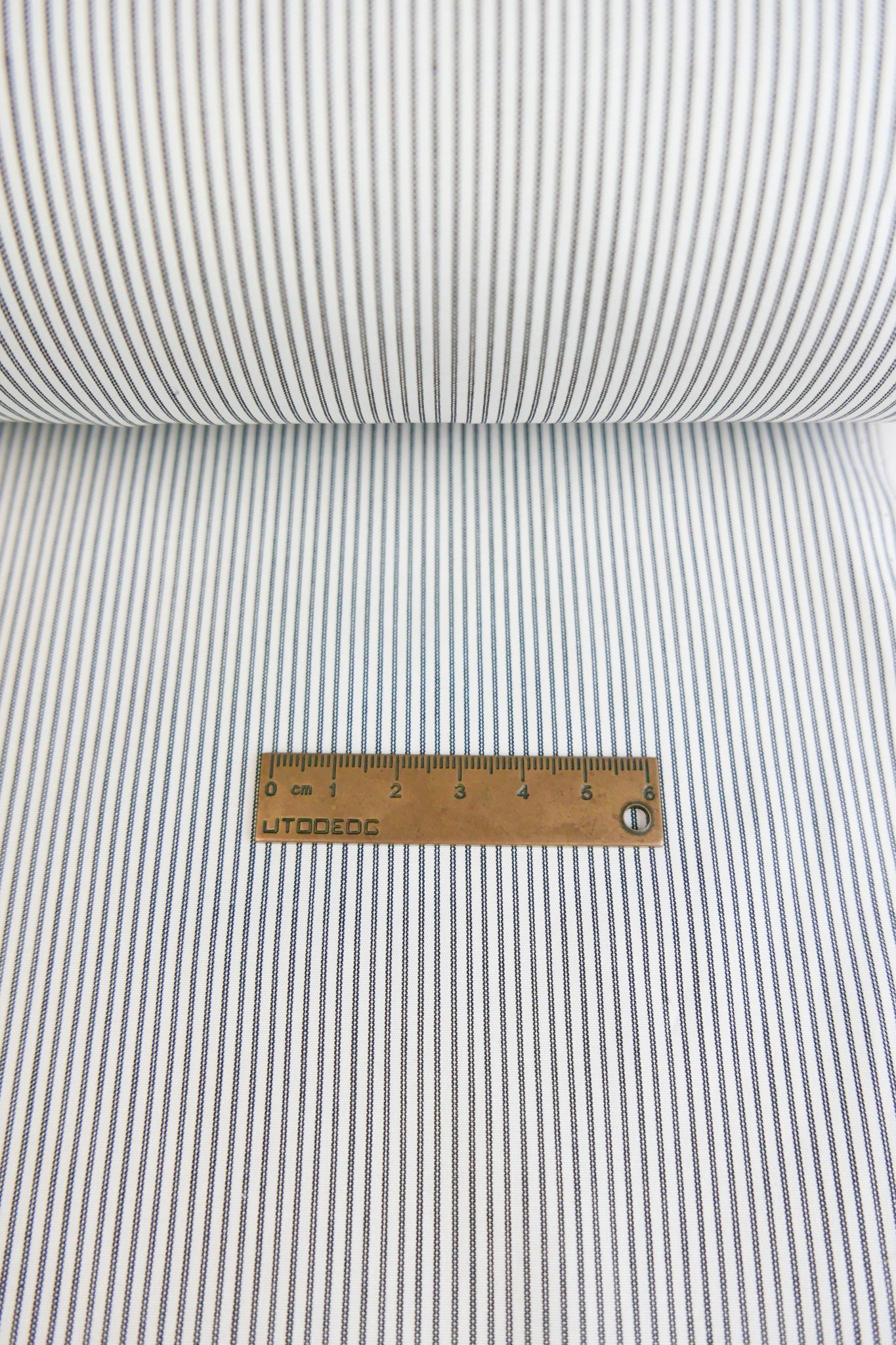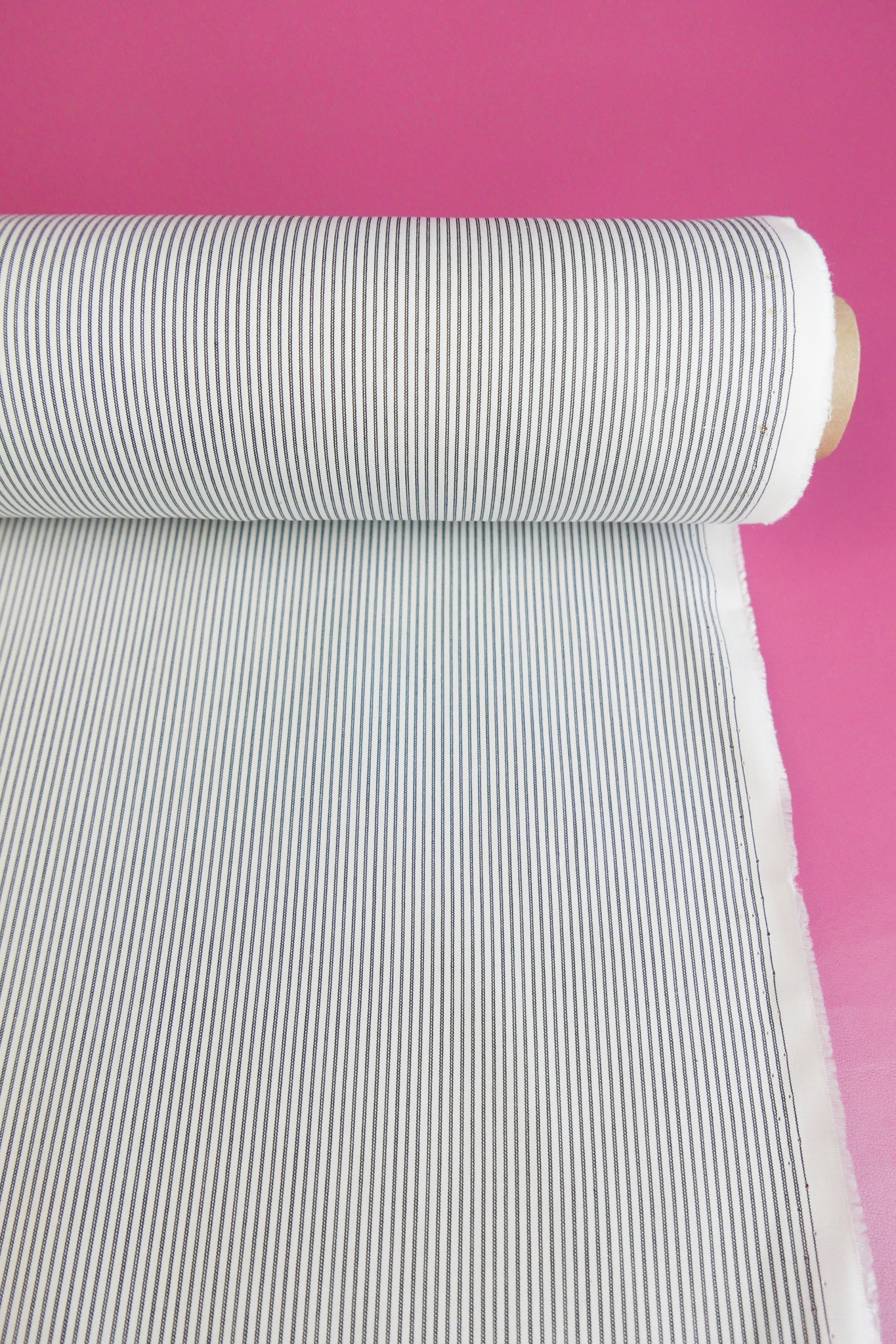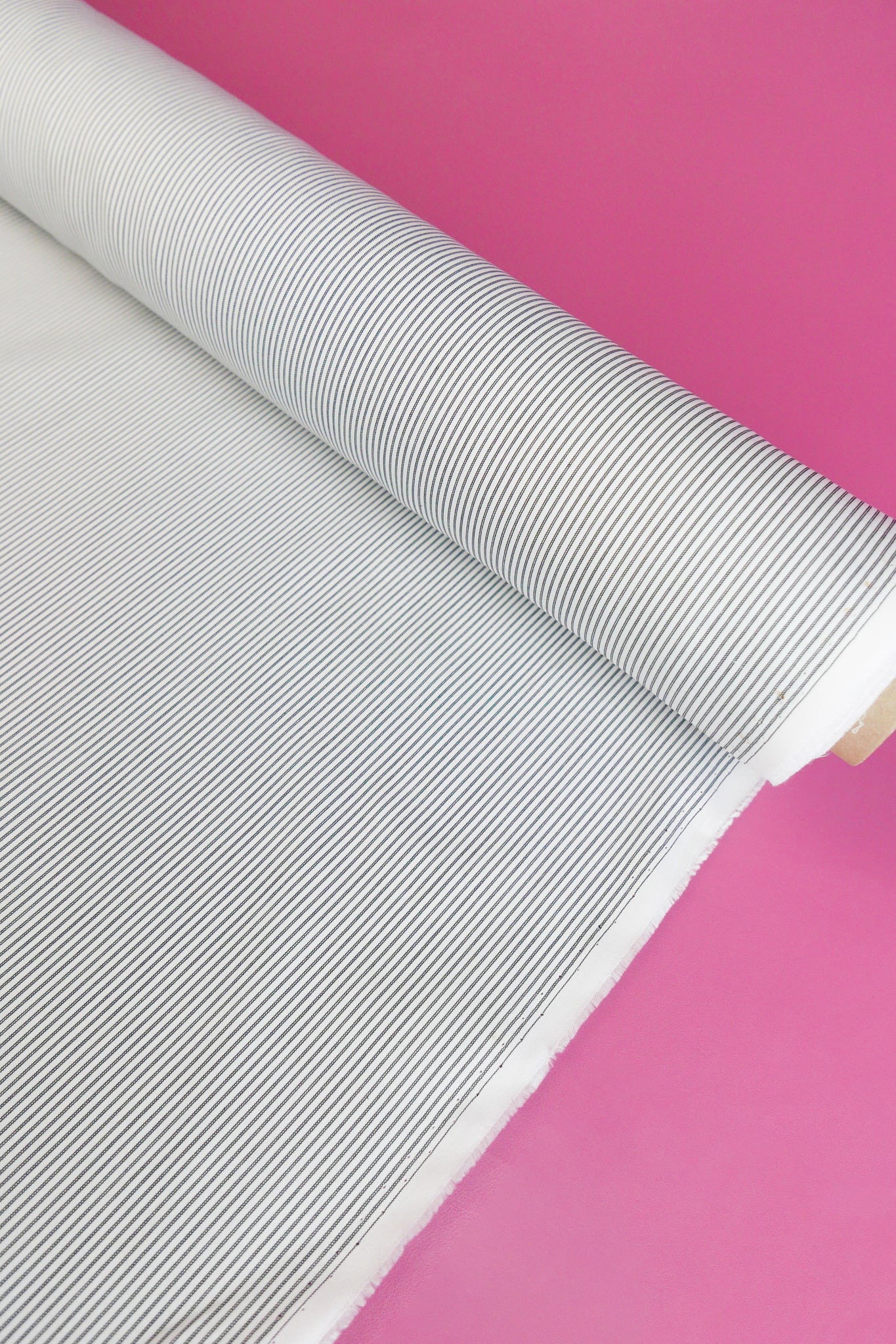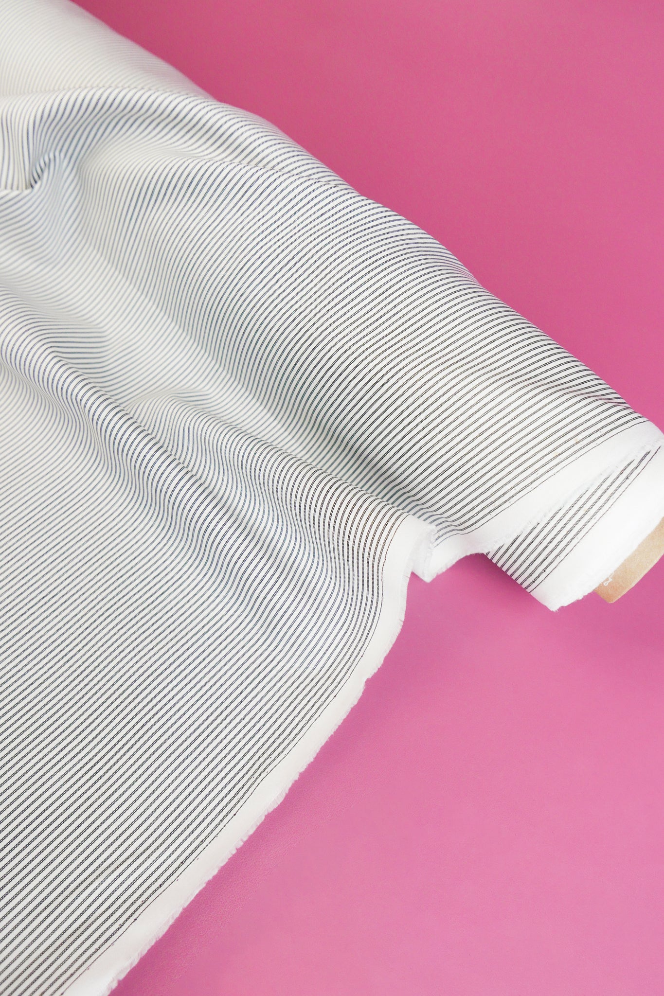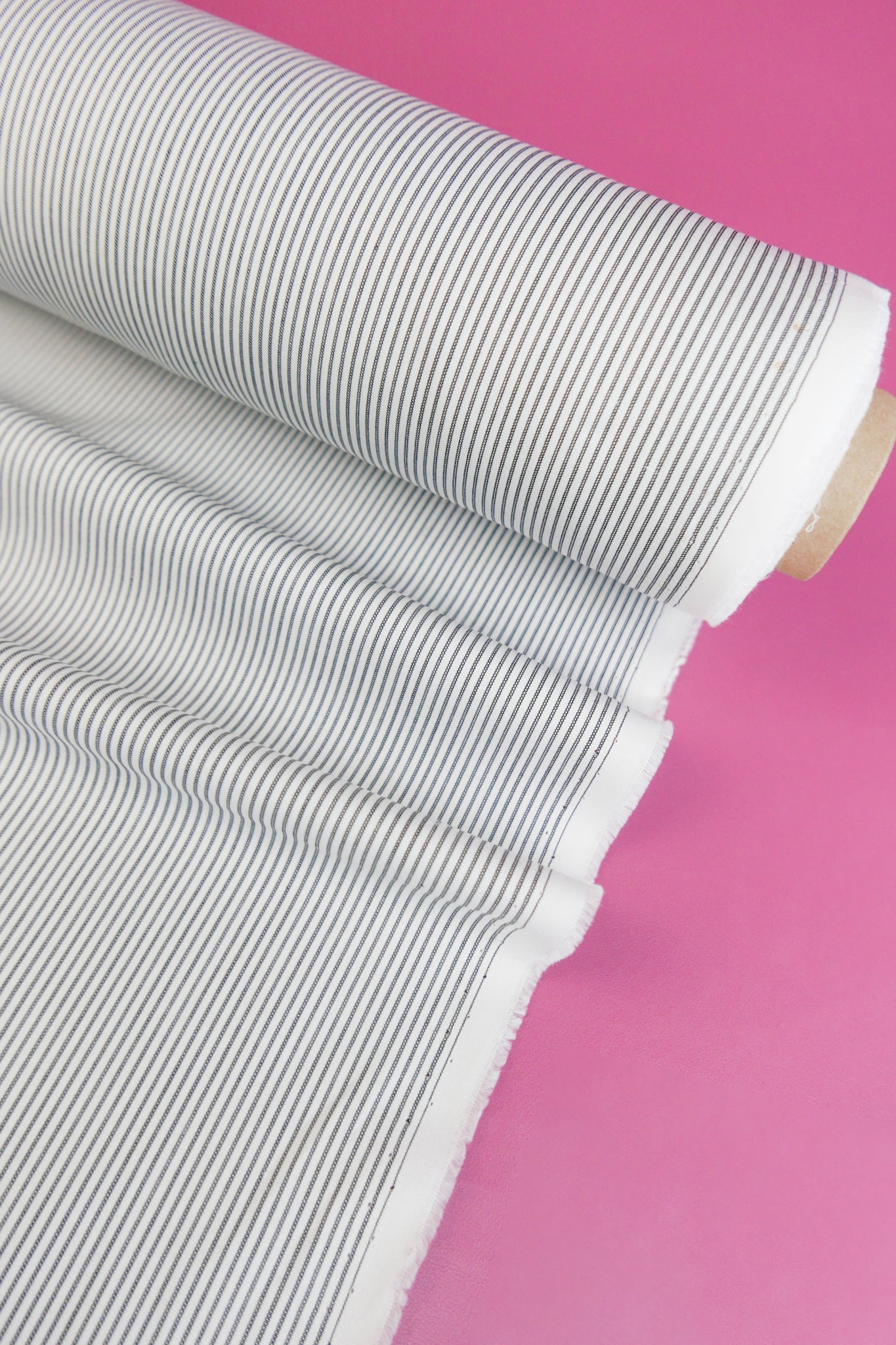 Canclini is a premium pure cotton shirting from a world-renowned Italian mill of the same name. It comes in a classic yarn-dyed pinstripe design in black on an off-white cloth. Lightweight and completely opaque, Canclini holds good structure, and will make into beautiful silhouettes with gathers, puffs and volume. This yarn-dyed cotton would make a beautiful shirt, summer-weight pant, skirt or dress.