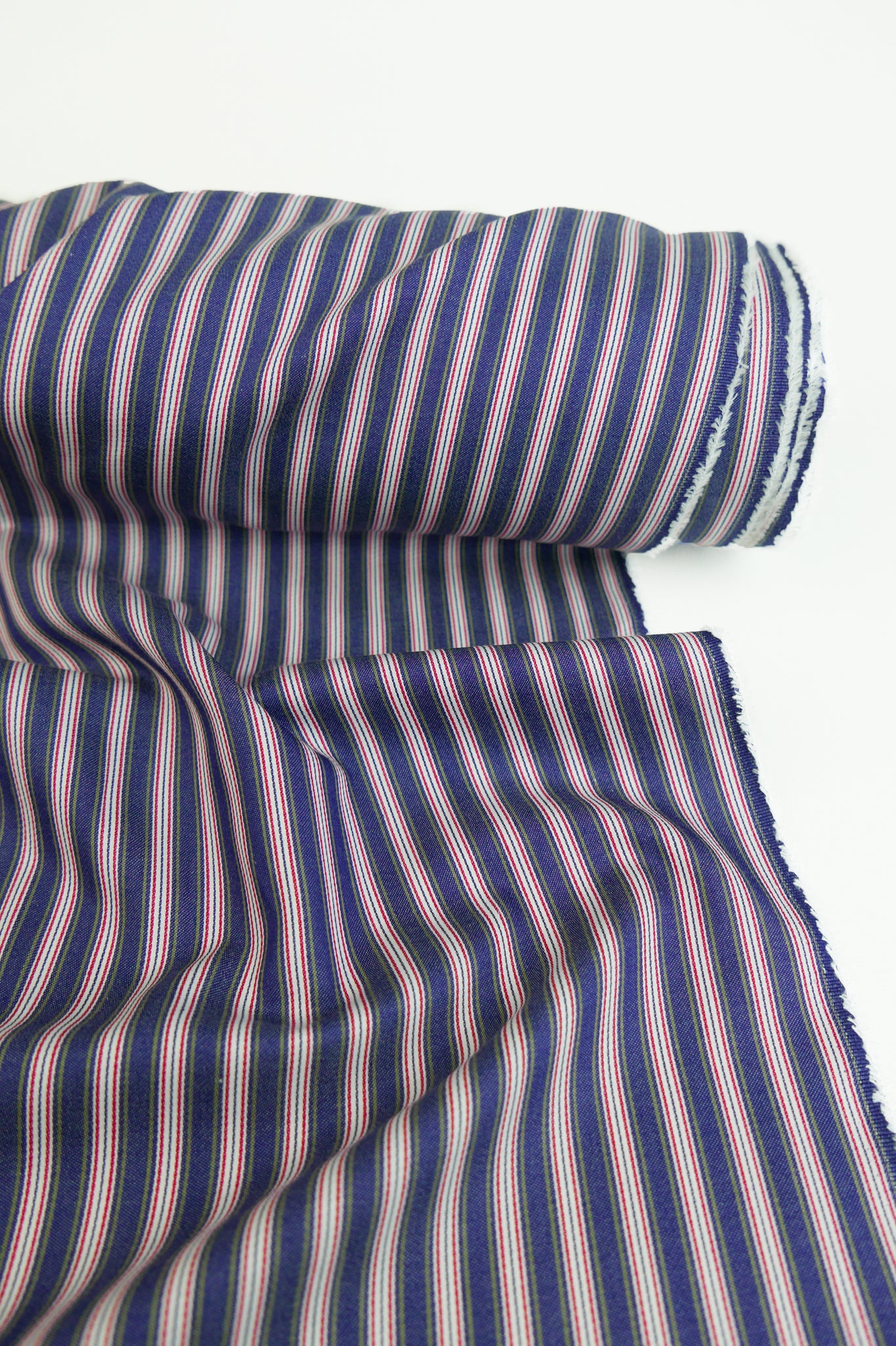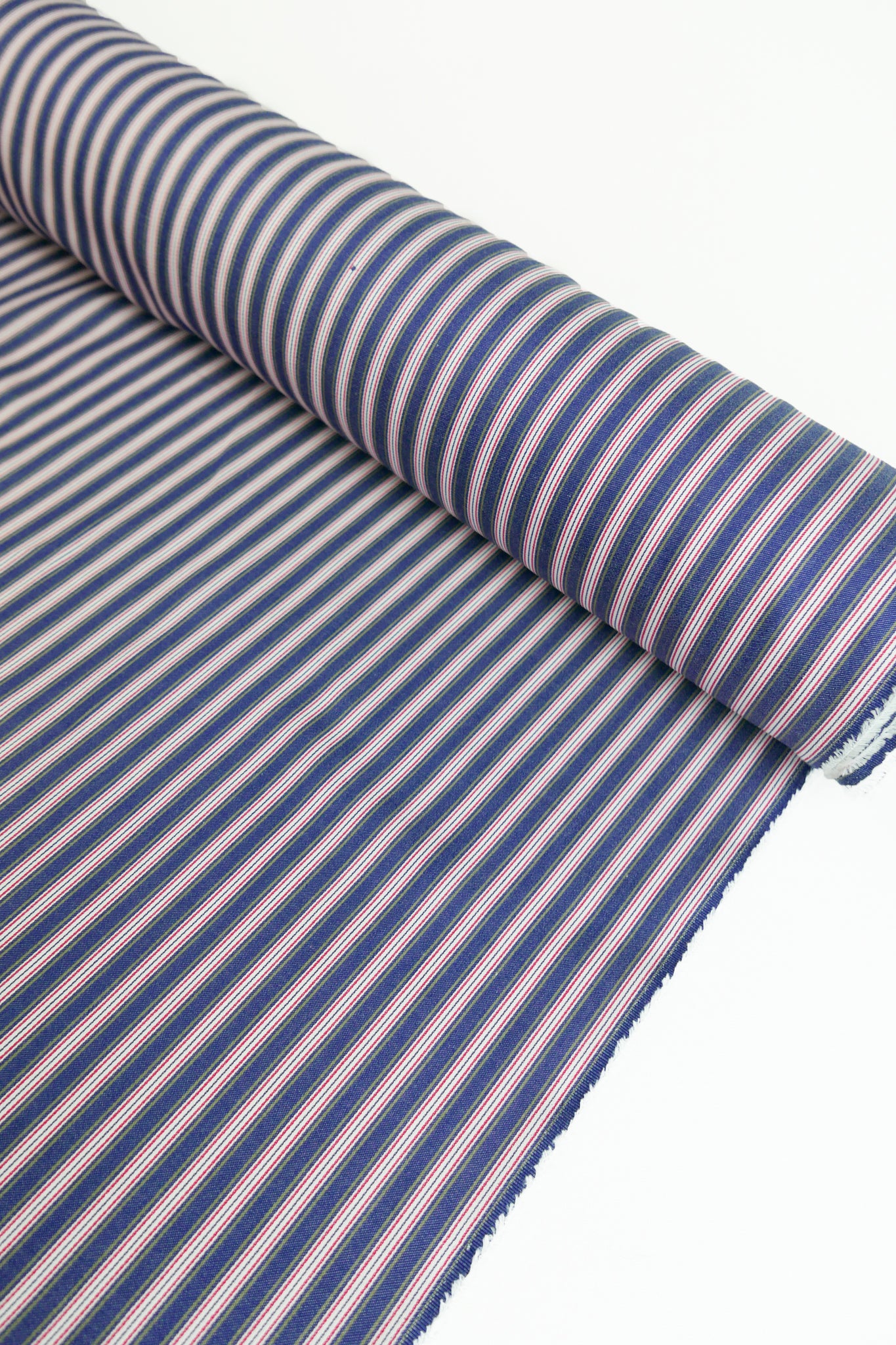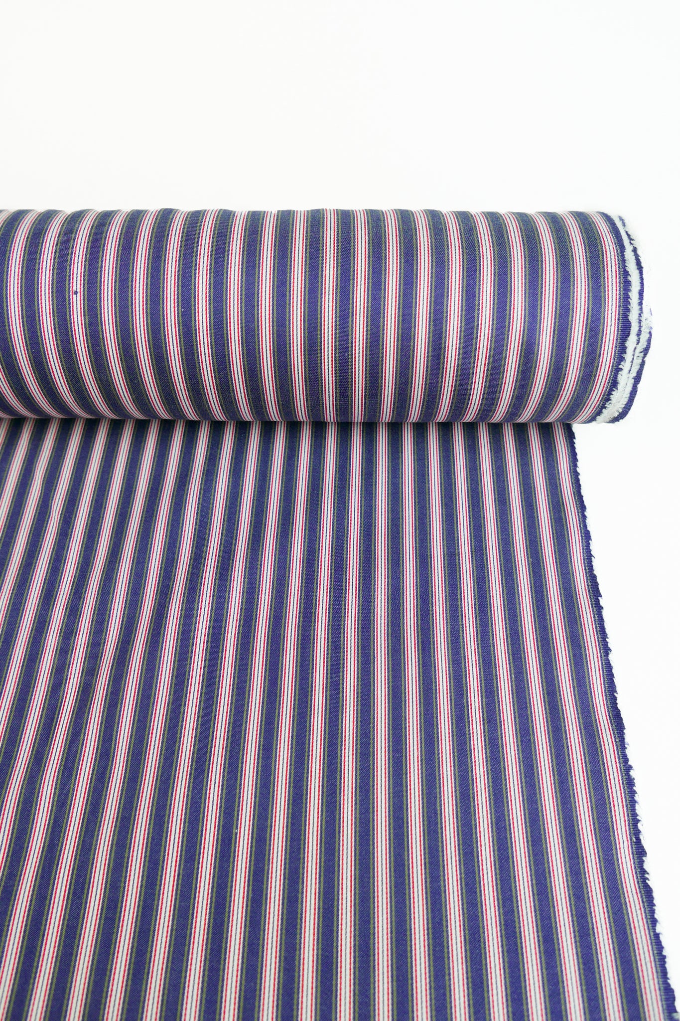 Ralph is 100% American Supima cotton yarn, woven together by the finest shirting manufacturers in Japan. It comes in a classic yarn-dyed stripe design in navy and red on an off-white cloth. Lightweight and completely opaque, Ralph holds good structure, and will make into beautiful silhouettes with gathers, puffs and volume. This yarn-dyed cotton would make a beautiful shirt, summer-weight pant, skirt or dress.
