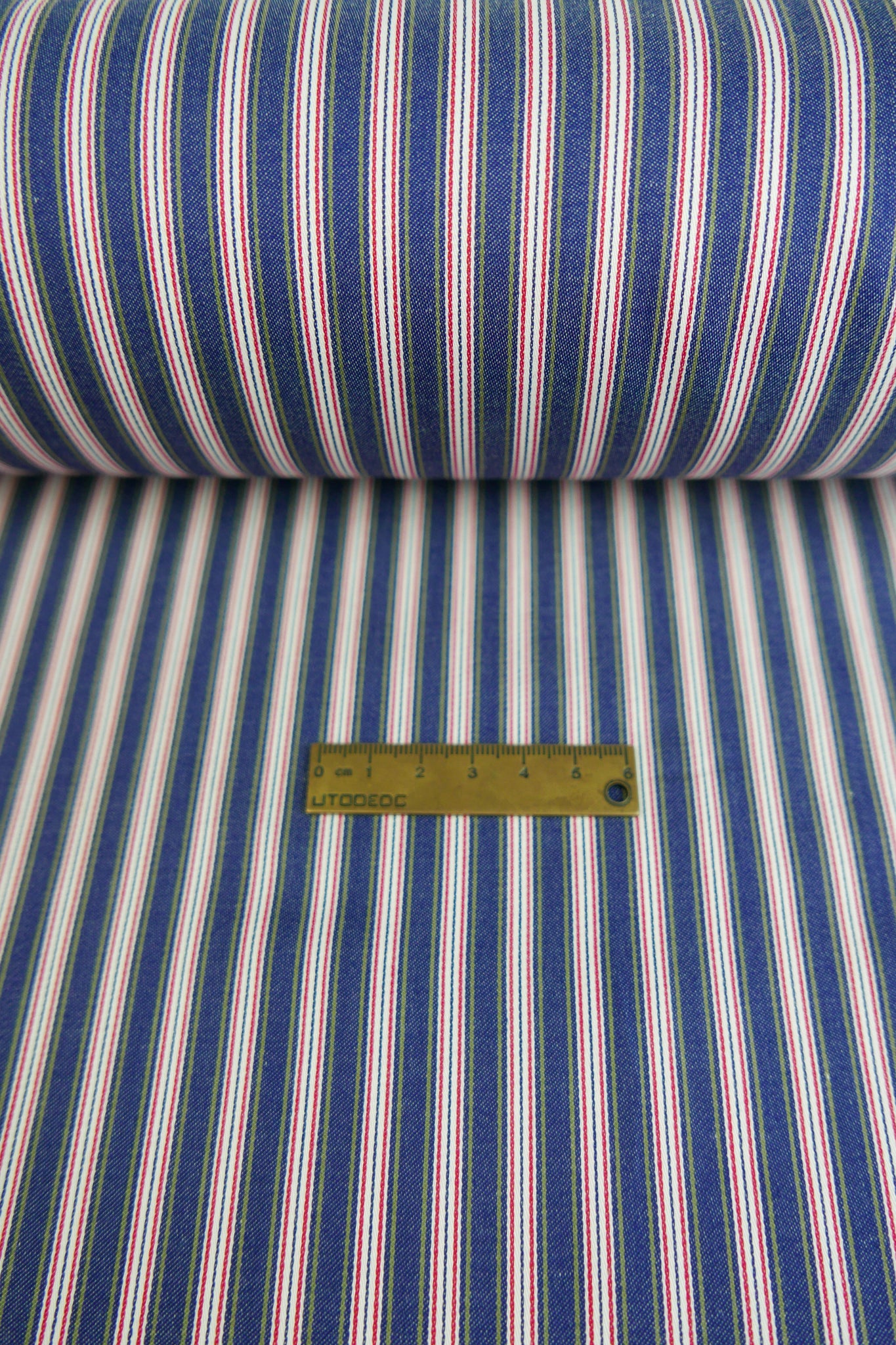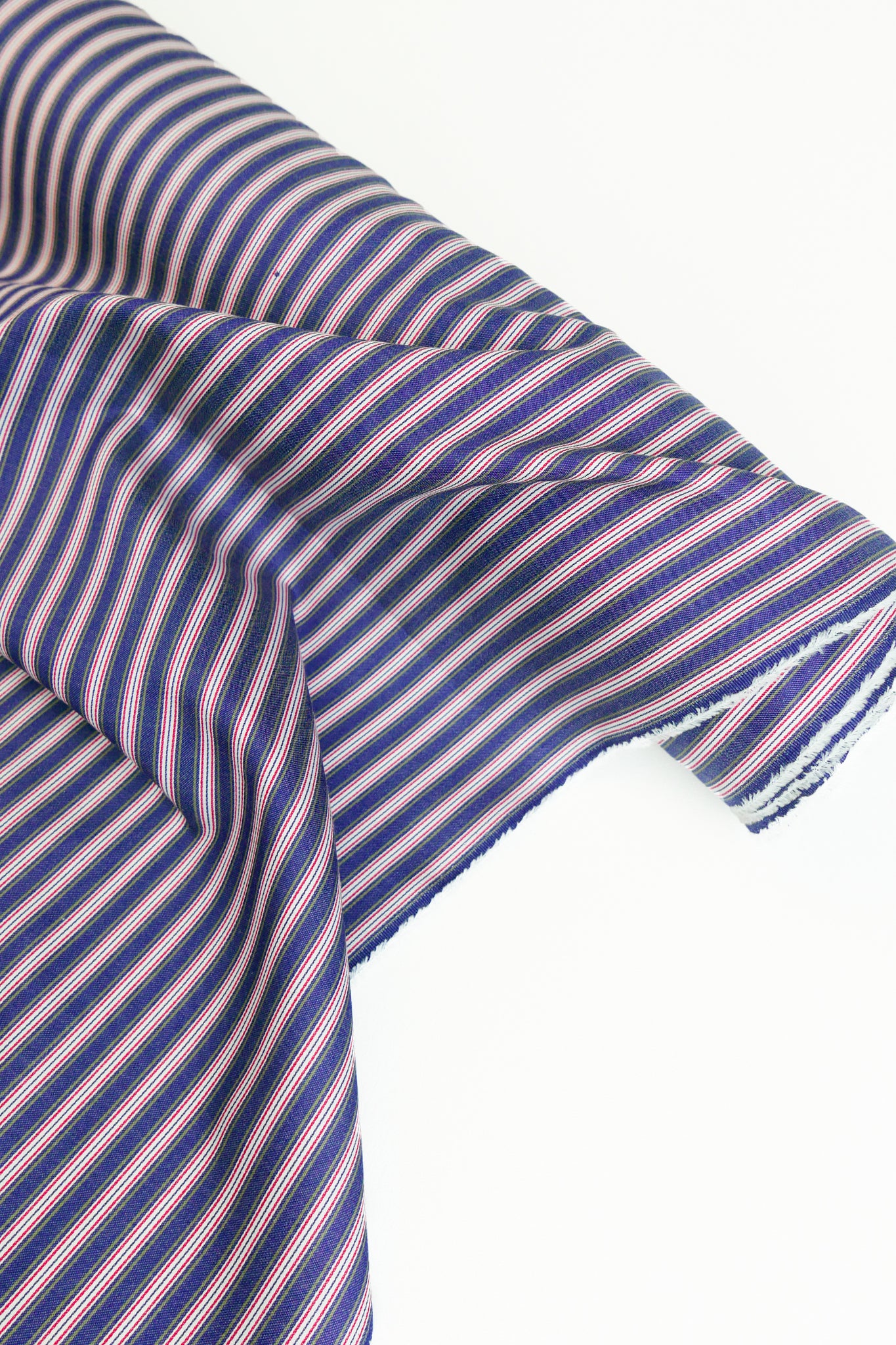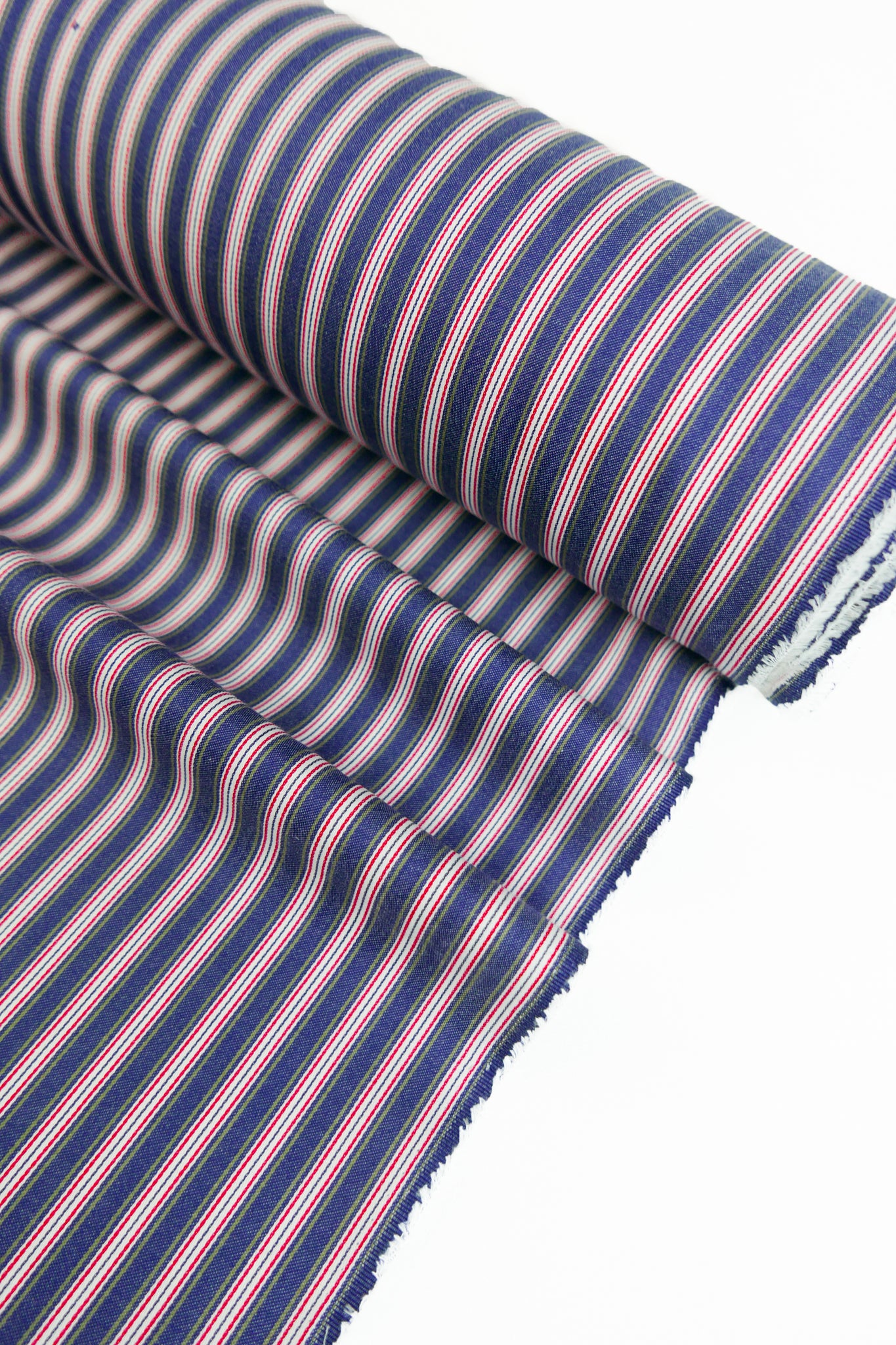 Ralph is 100% American Supima cotton yarn, woven together by the finest shirting manufacturers in Japan. It comes in a classic yarn-dyed stripe design in navy and red on an off-white cloth. Lightweight and completely opaque, Ralph holds good structure, and will make into beautiful silhouettes with gathers, puffs and volume. This yarn-dyed cotton would make a beautiful shirt, summer-weight pant, skirt or dress.