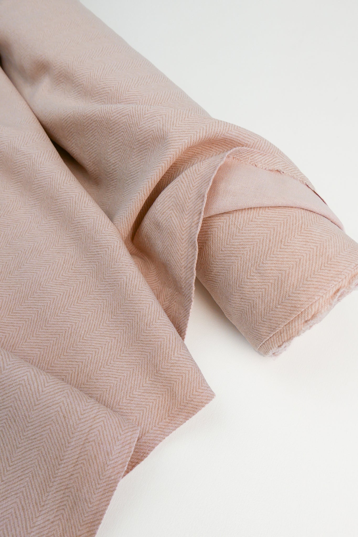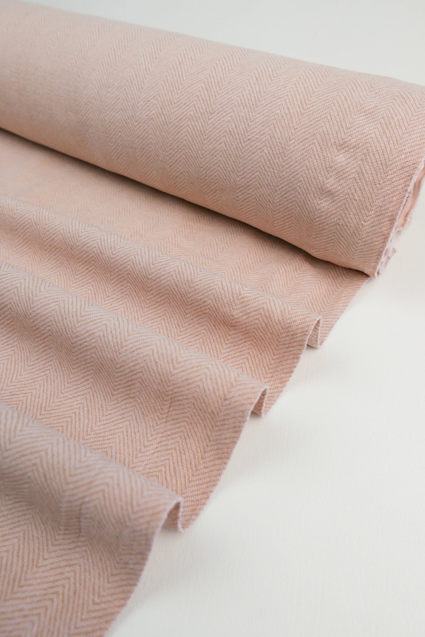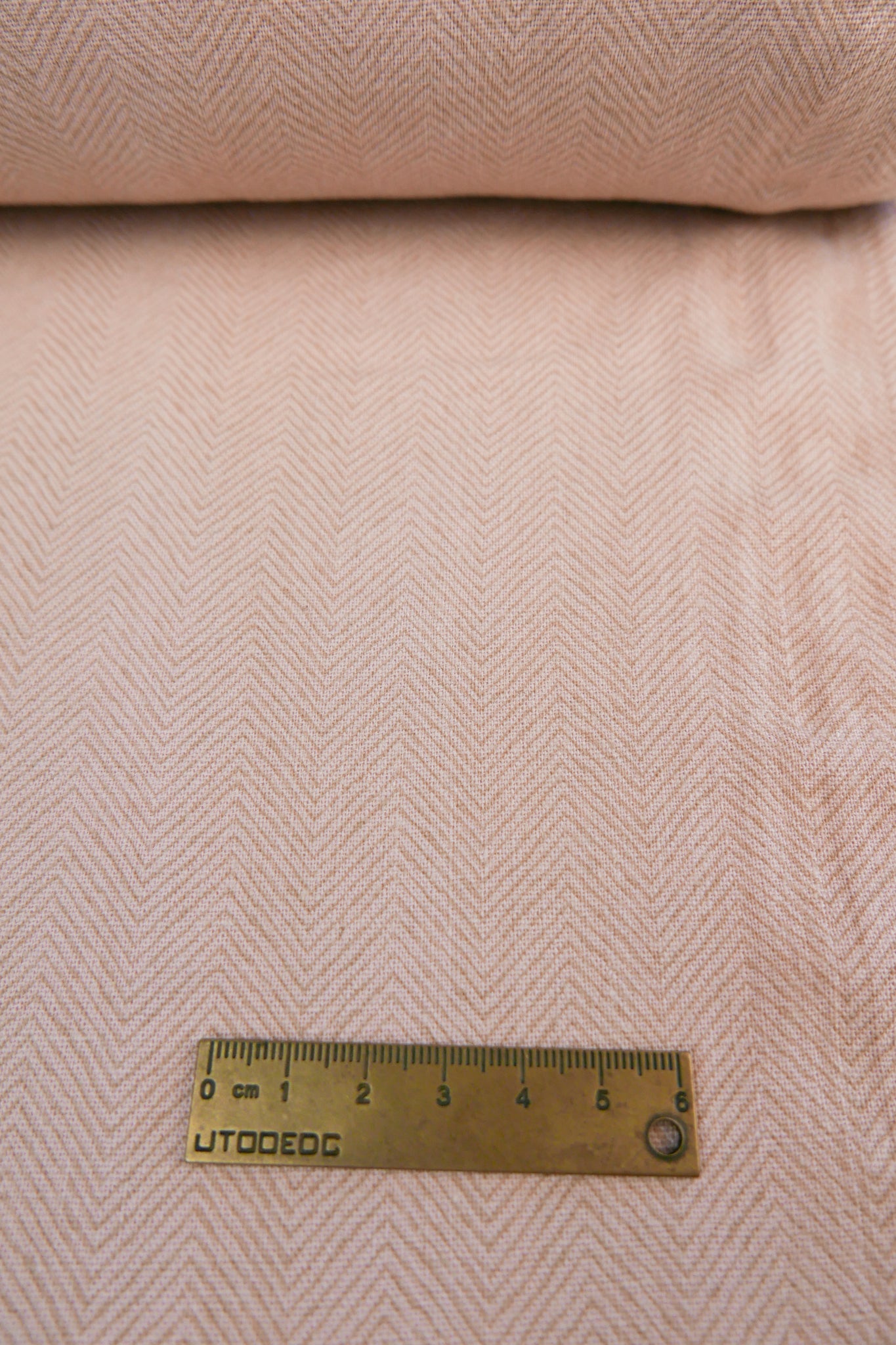 Lucia is an interesting linen in a classic and versatile midweight. Double-faced, one face has a unique printed chevron design in beige on a soft pink cloth, and the reverse offers a simple soft pink linen with a subtle grain finish. Completely opaque and with good structured drape, Lucia is perfect for striking linen suits, dresses, or trousers.