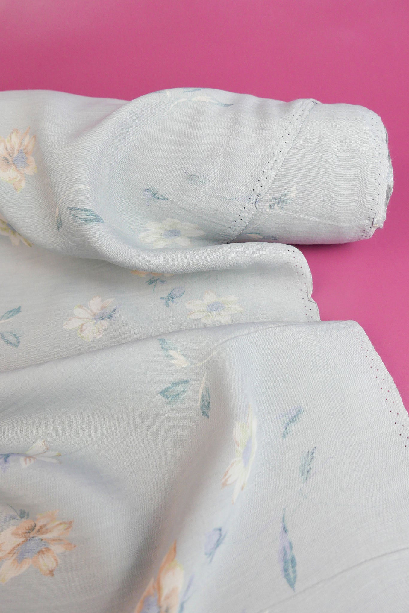 Margaret is a soft, Italian viscose print featuring a lovely floral print on a duck egg blue cloth. Lightweight and mostly opaque, Margaret has excellent drape and is perfect for gathered blouses or lined as a dress or skirt.