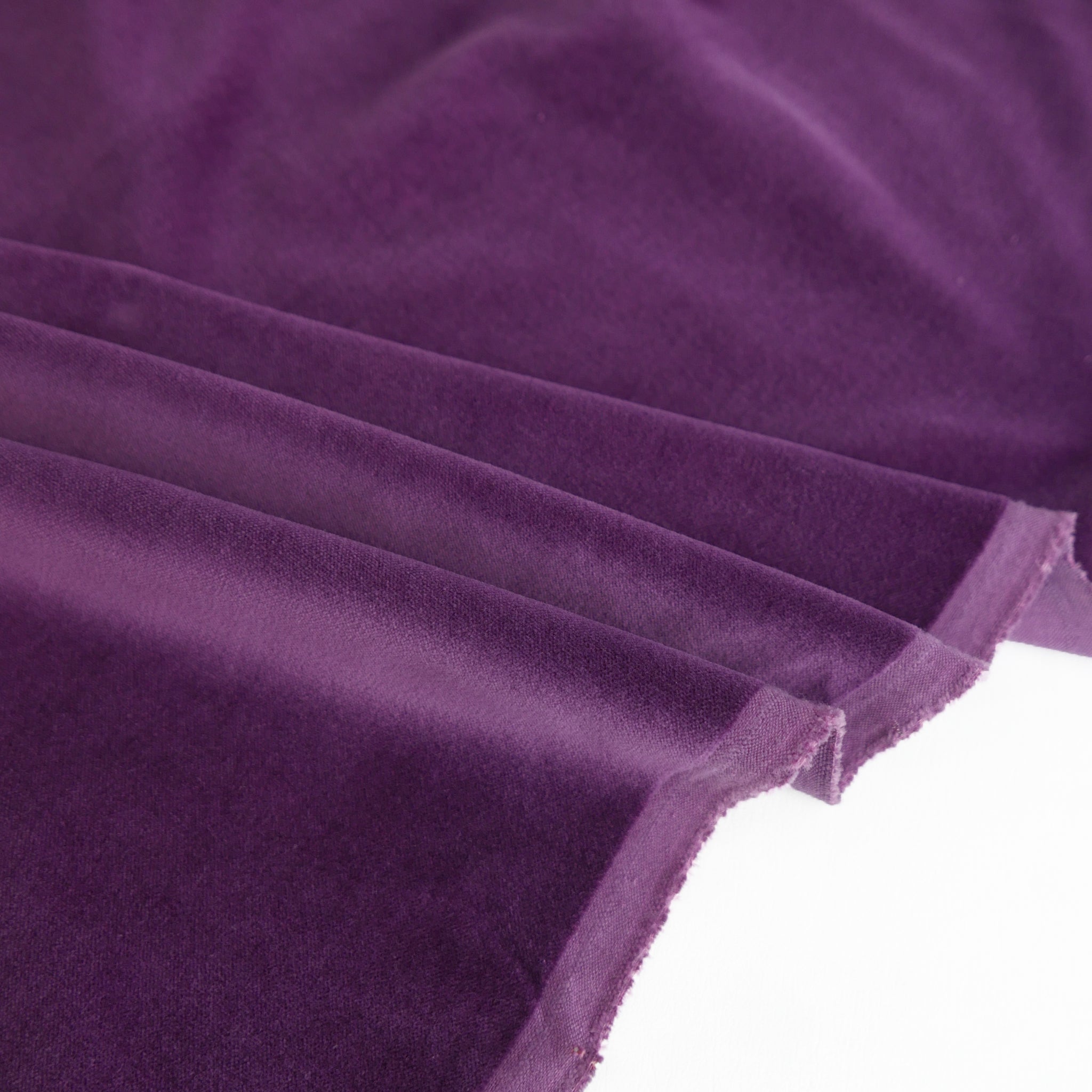This is a premium pure cotton velvet in a lush grape colourway. Incredibly soft and tactile, it holds structure beautifully. It's perfect for garments such as dresses, tops, luxurious pants, or jackets. It has a short yet noticeable pile and is woven on a matte base.