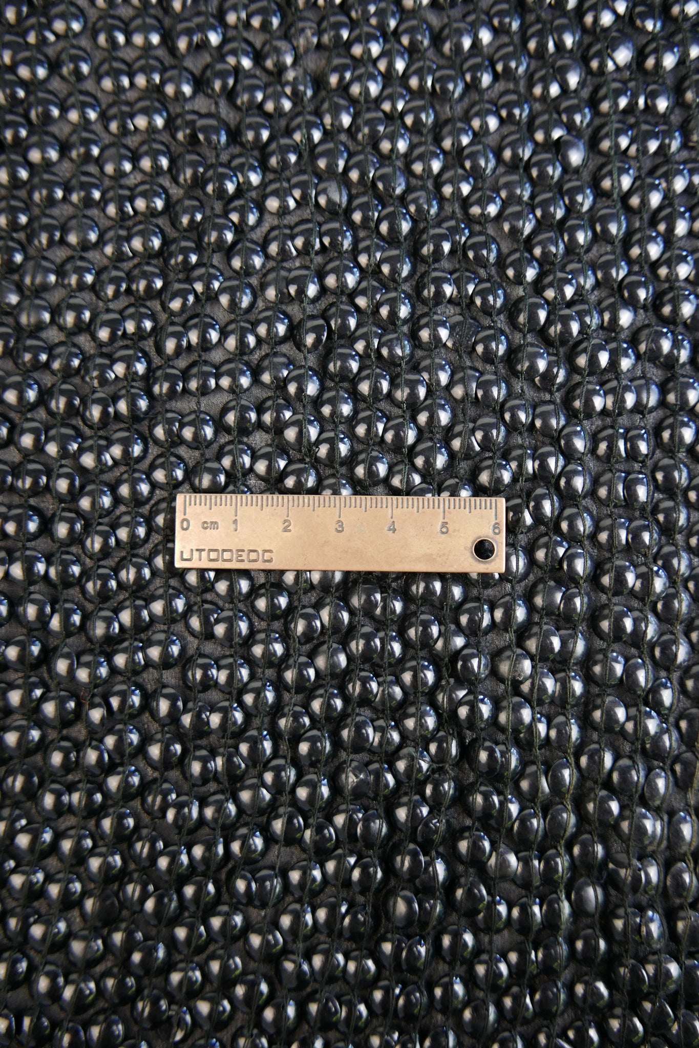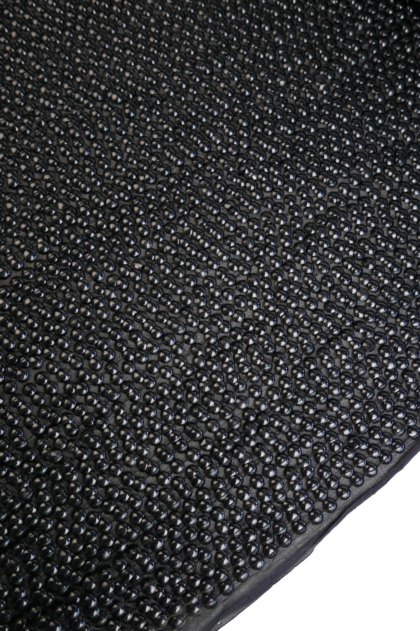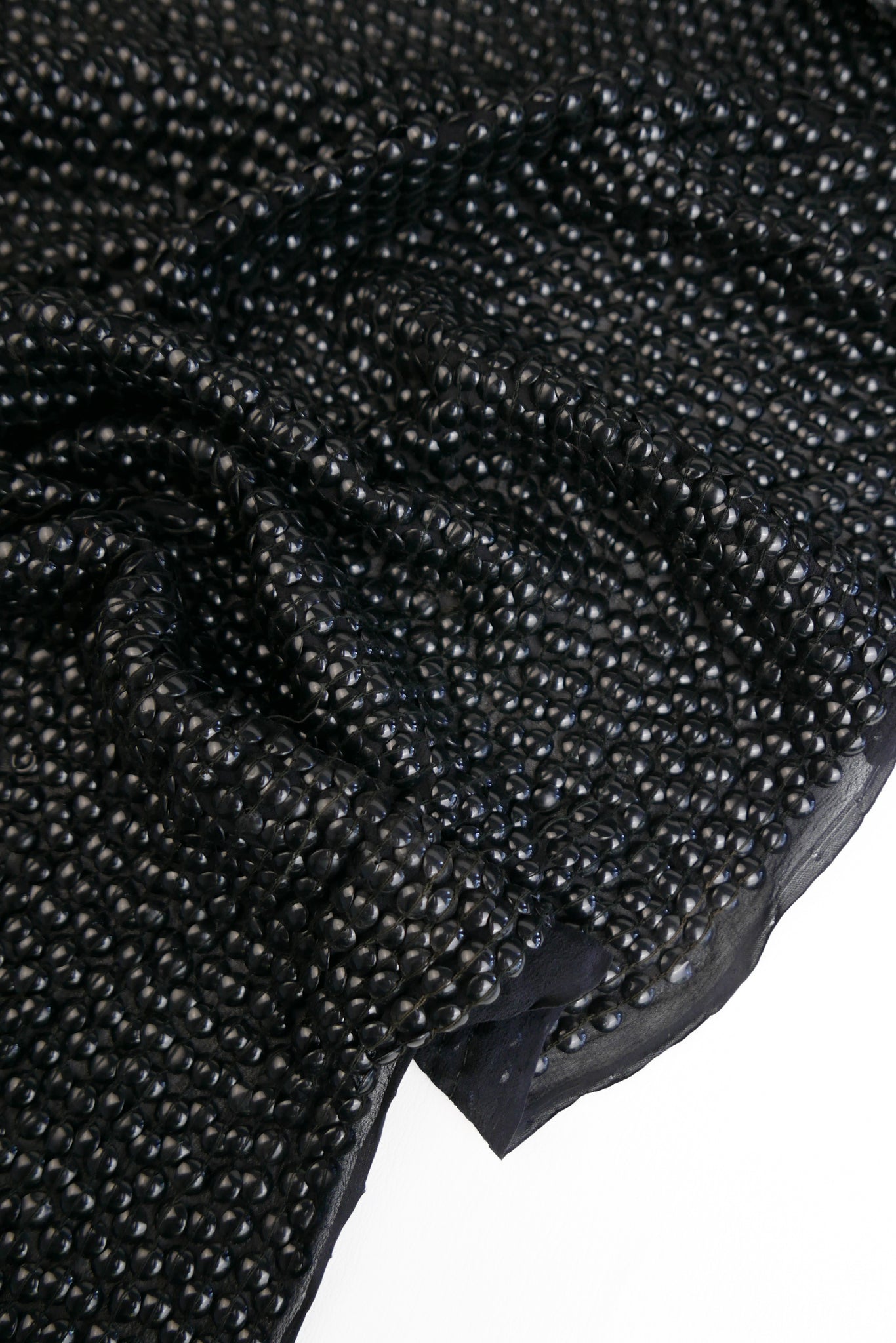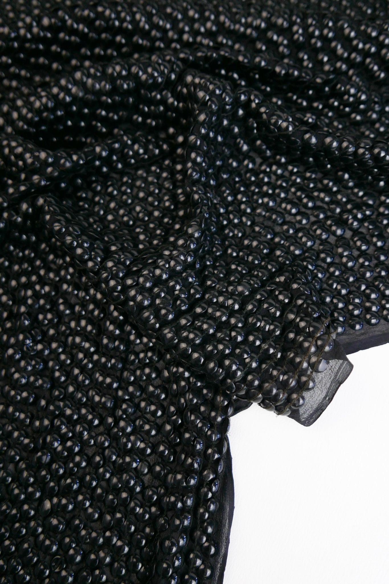 An extraordinary showpiece, this luxurious fabric is one-of-a-kind. Hand-embroidered in India, it features a rich black silk georgette base, lavishly adorned with rows upon rows of black dome-shaped sequins. The intricate embellishment gives the fabric a striking, high-shine finish while maintaining the fluid drape of georgette. Mostly opaque, it’s ideal for crafting unforgettable dresses, statement tops, and glamorous event wear.