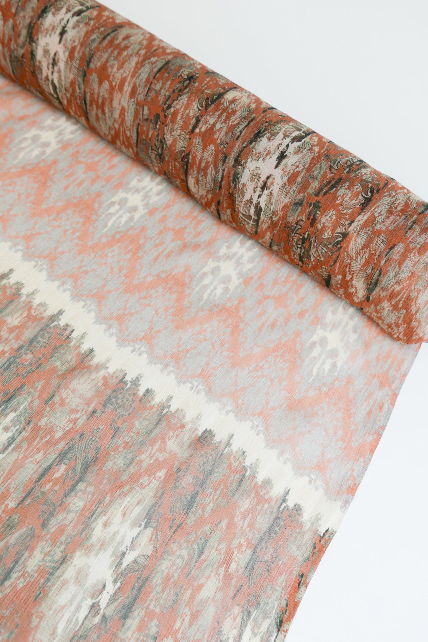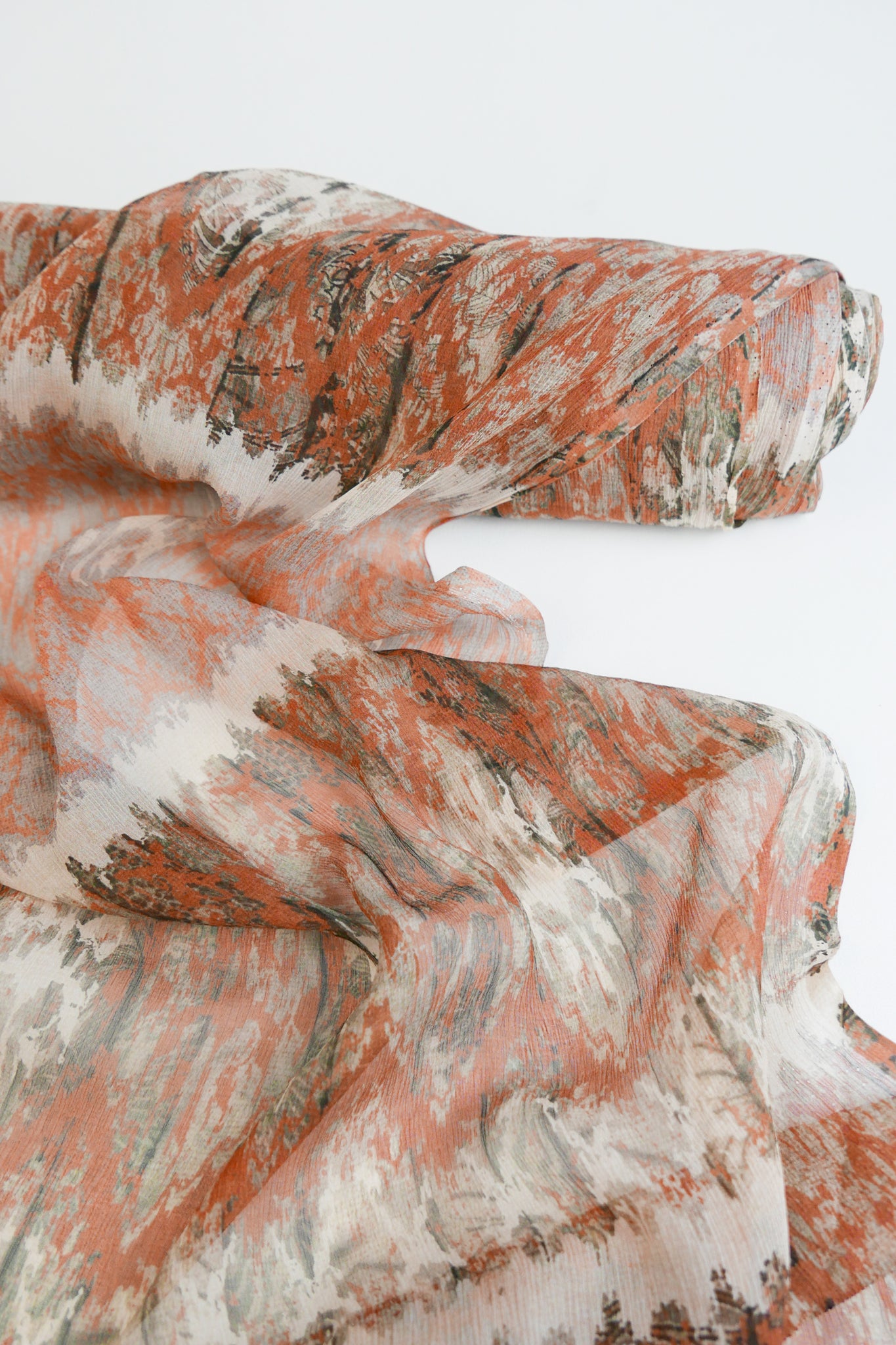 This beautiful silk georgette is super fine and delicate, and features a bohemian print in shades of terracotta, charcoal and cream with a tactile crinkle texture. Lightweight, super floaty and sheer, it's the perfect blouse weight, or line your summer skirts and dresses for a super luxe feel.