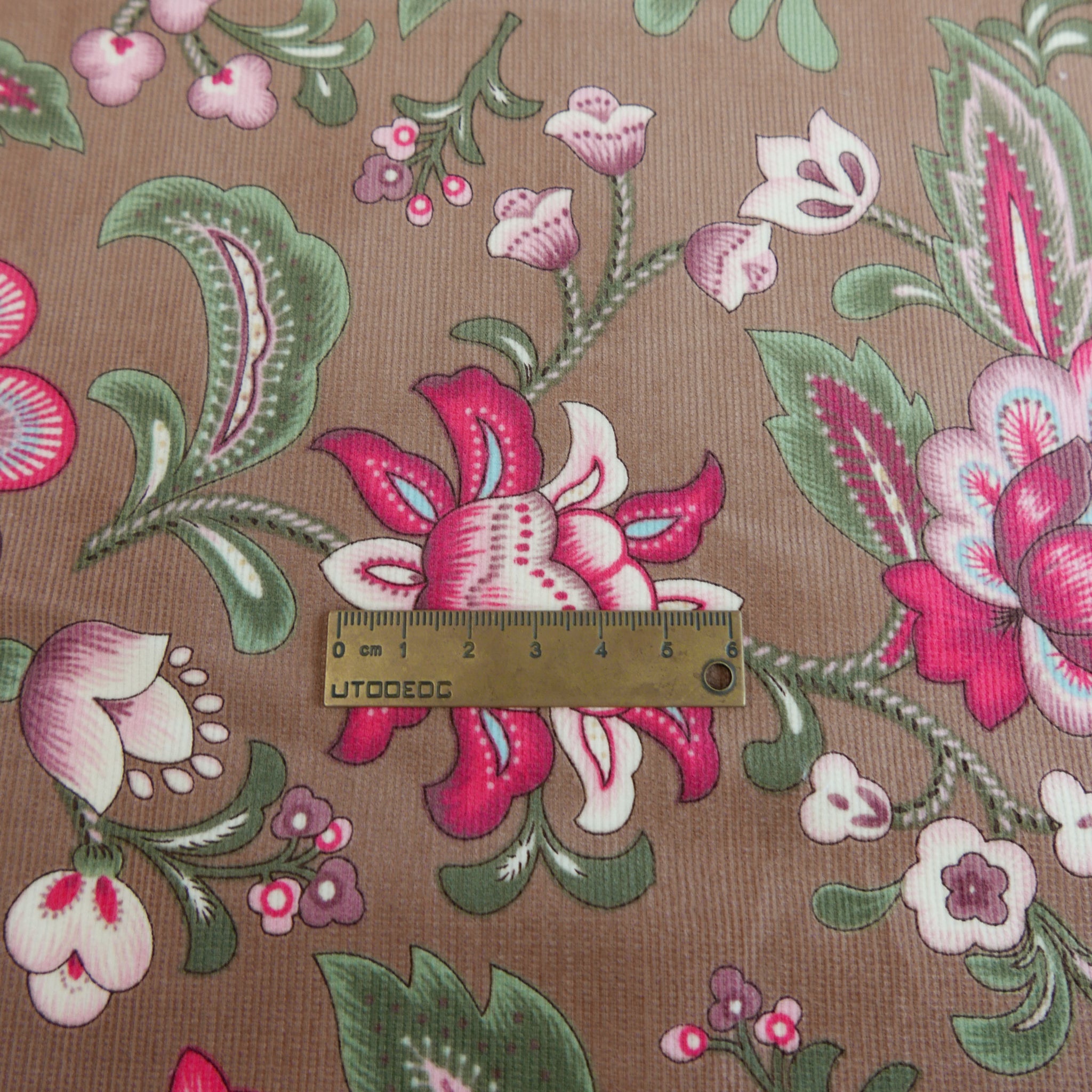 Agatha is a fine 21-wale cotton corduroy coming in mocha with a vibrant floral print. It's midweight and has a soft short pile. Being wide width and durable, it's an extremely versatile fabric, great for trousers, jackets, dresses, shorts, or skirts.