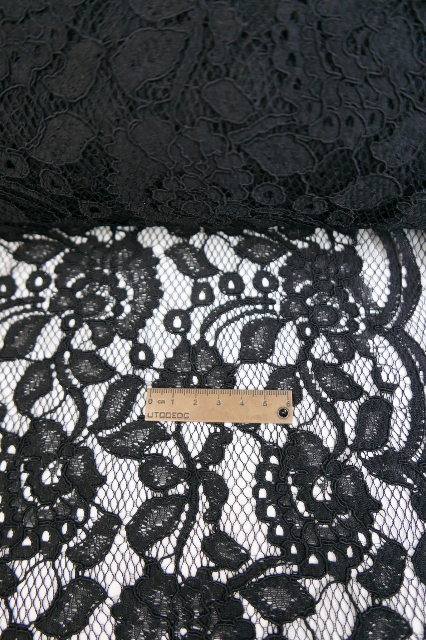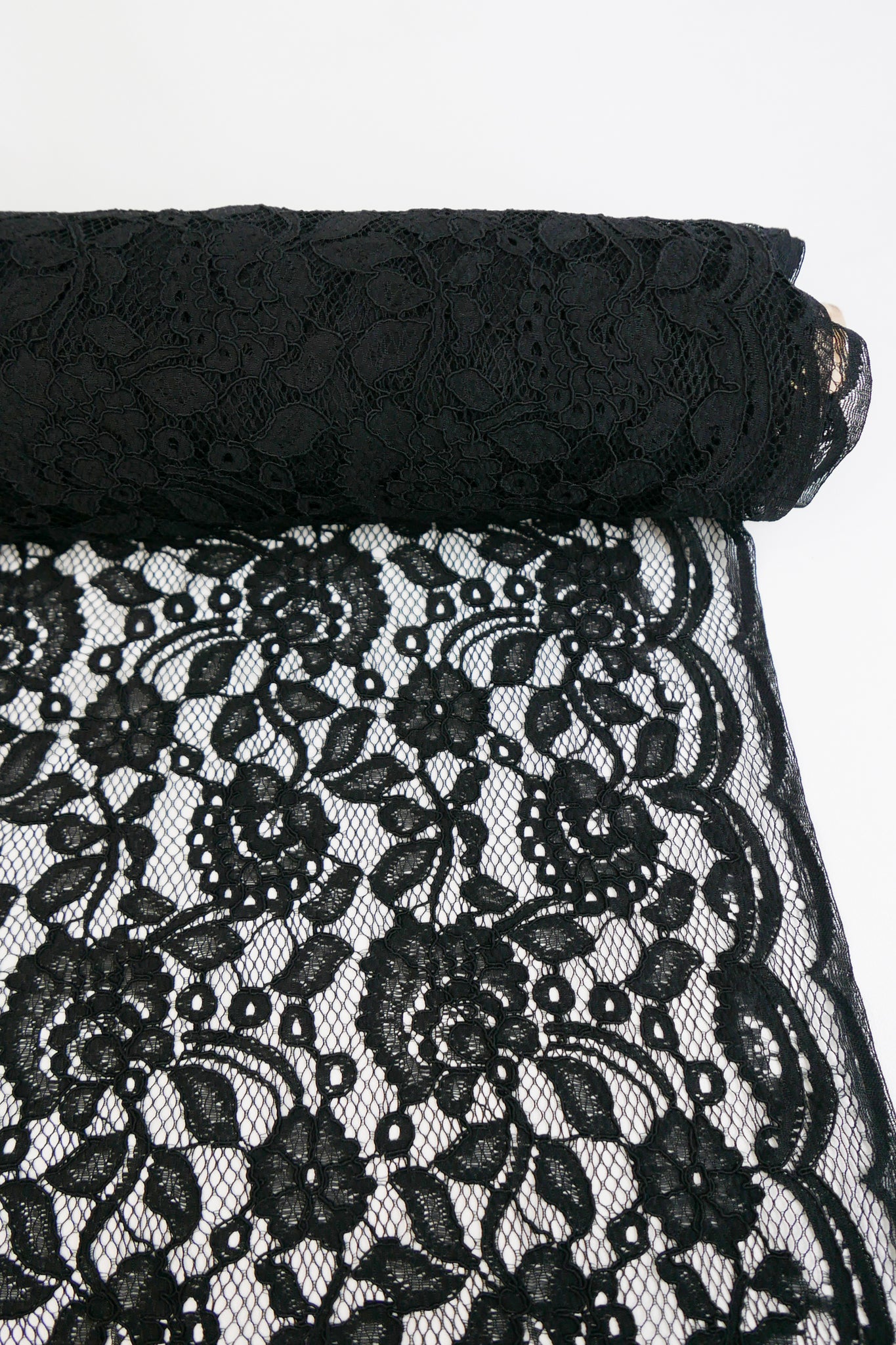 Also called "the Queen of lace", Alençon lace is known for its intricate design with a corded outline set on a netted base. Our Dita lace features a delicate floral design in a black colourway. Beautifully tactile, it has mechanical stretch and scalloped edging along one selvedge. Dita would make a stunning layering piece, bridal wear or even a lace slip.