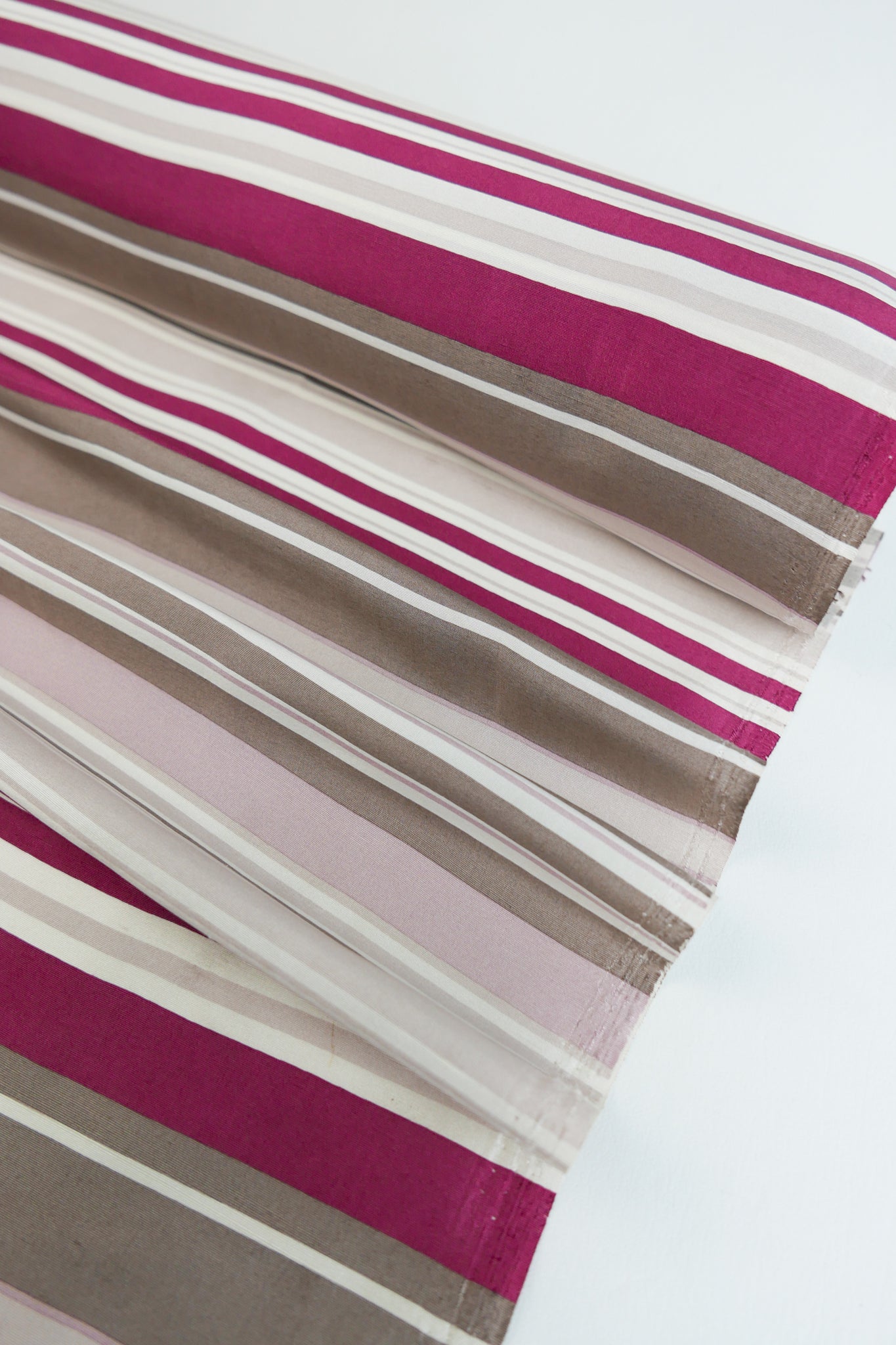 An indulgent silk shirting, coming in a striking stripe design in deep raspberry, soft mauve, brown-grey and off-white. Supremely soft and with a subtle sheen, it is completely opaque and tightly woven. It has beautifully structured drape and is perfect for shirts, dresses, skirts or summer-weight trousers.