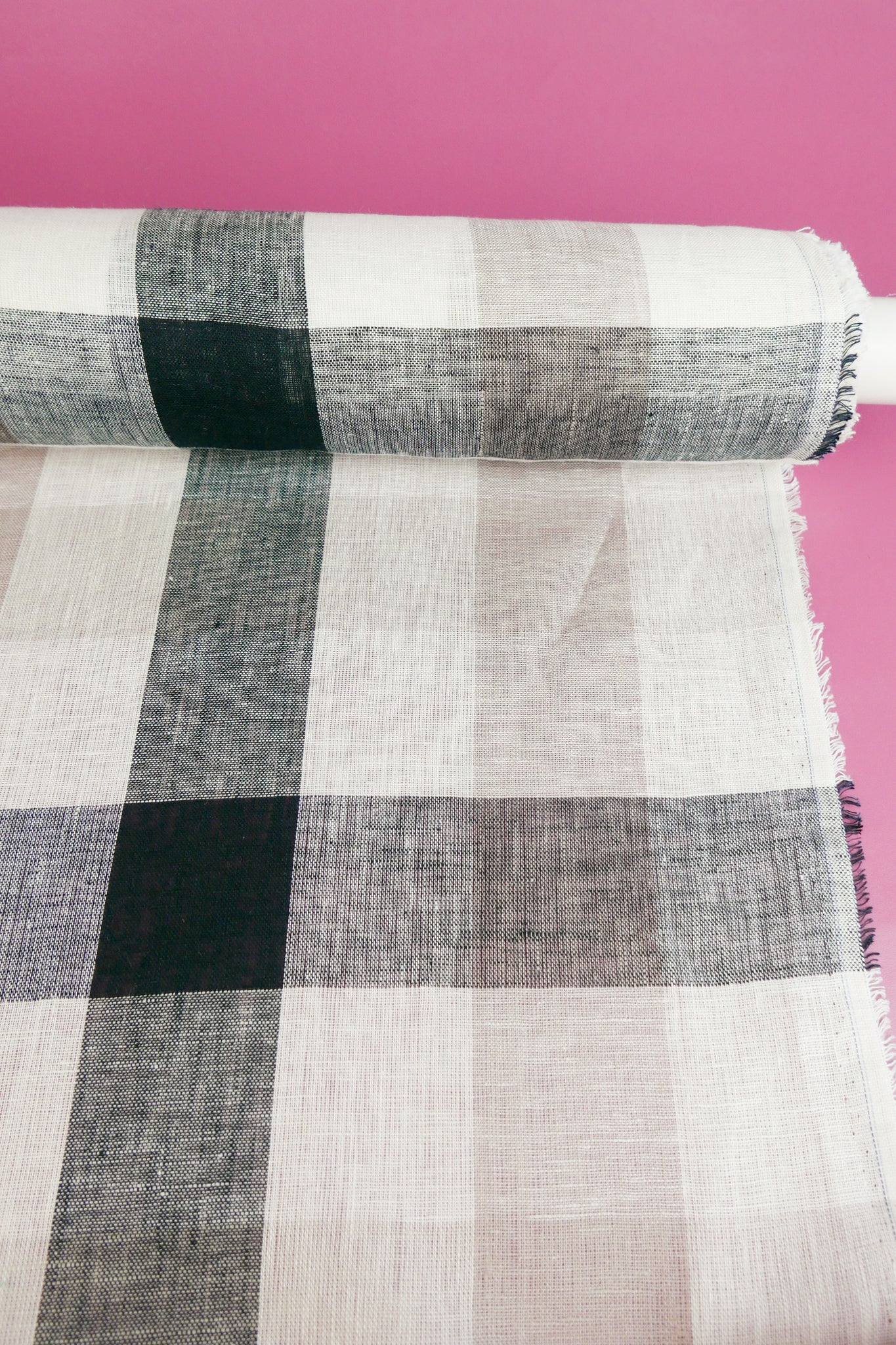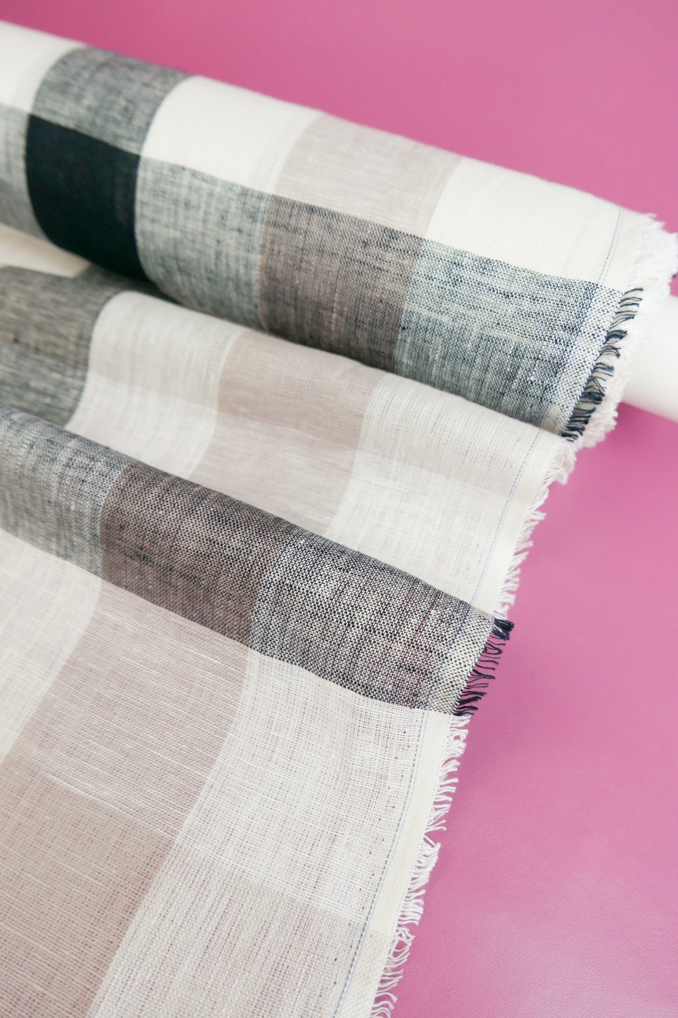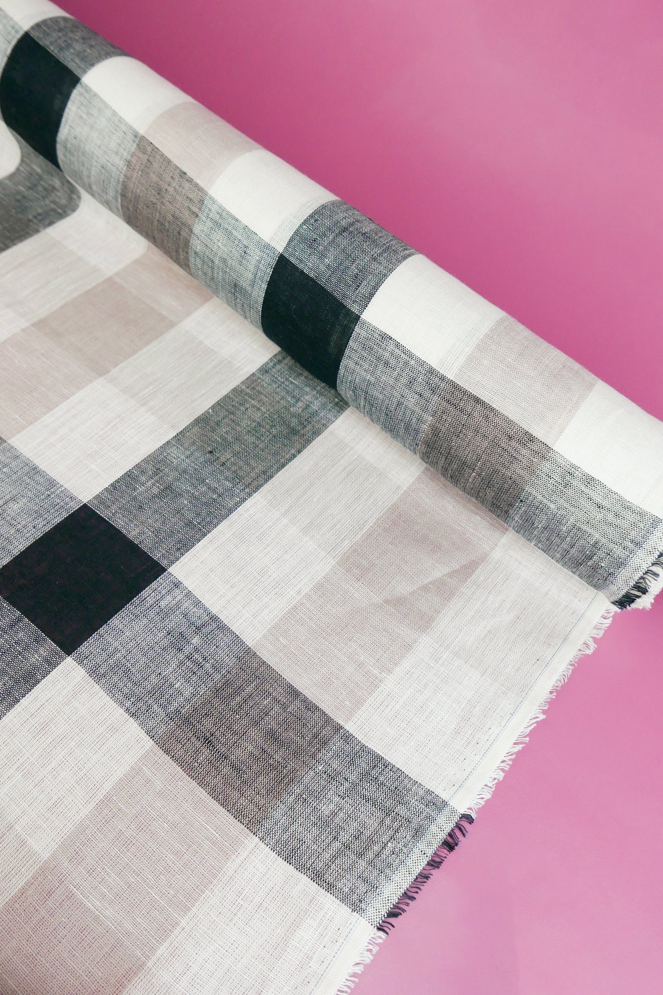 Barbara is a beautiful lightweight linen gauze with slubs throughout, coming in a large yarn-dyed check in soft rose and black on an off-white cloth. Loosely woven and semi-opaque, it has a summery, everyday quality to it with good structured drape. Perfect for summer-weight dresses, blouses and skirts.