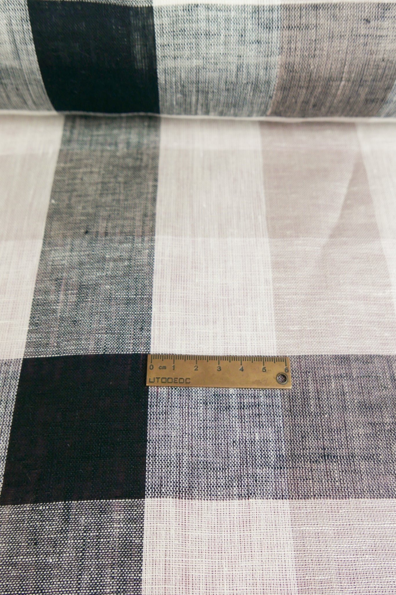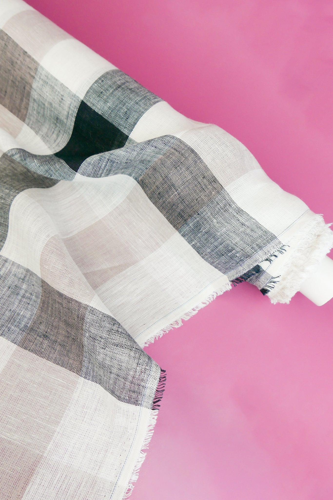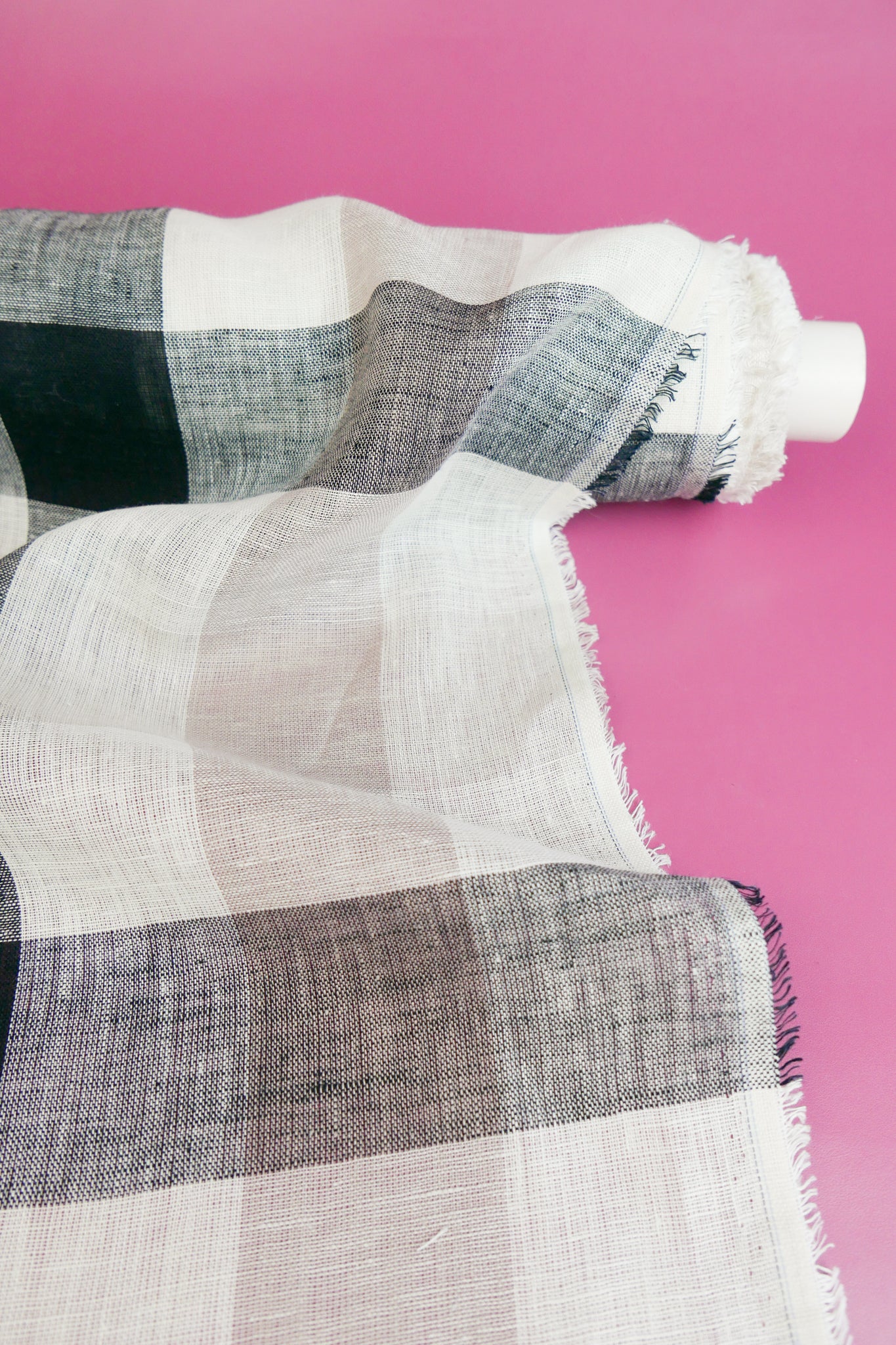 Barbara is a beautiful lightweight linen gauze with slubs throughout, coming in a large yarn-dyed check in soft rose and black on an off-white cloth. Loosely woven and semi-opaque, it has a summery, everyday quality to it with good structured drape. Perfect for summer-weight dresses, blouses and skirts.