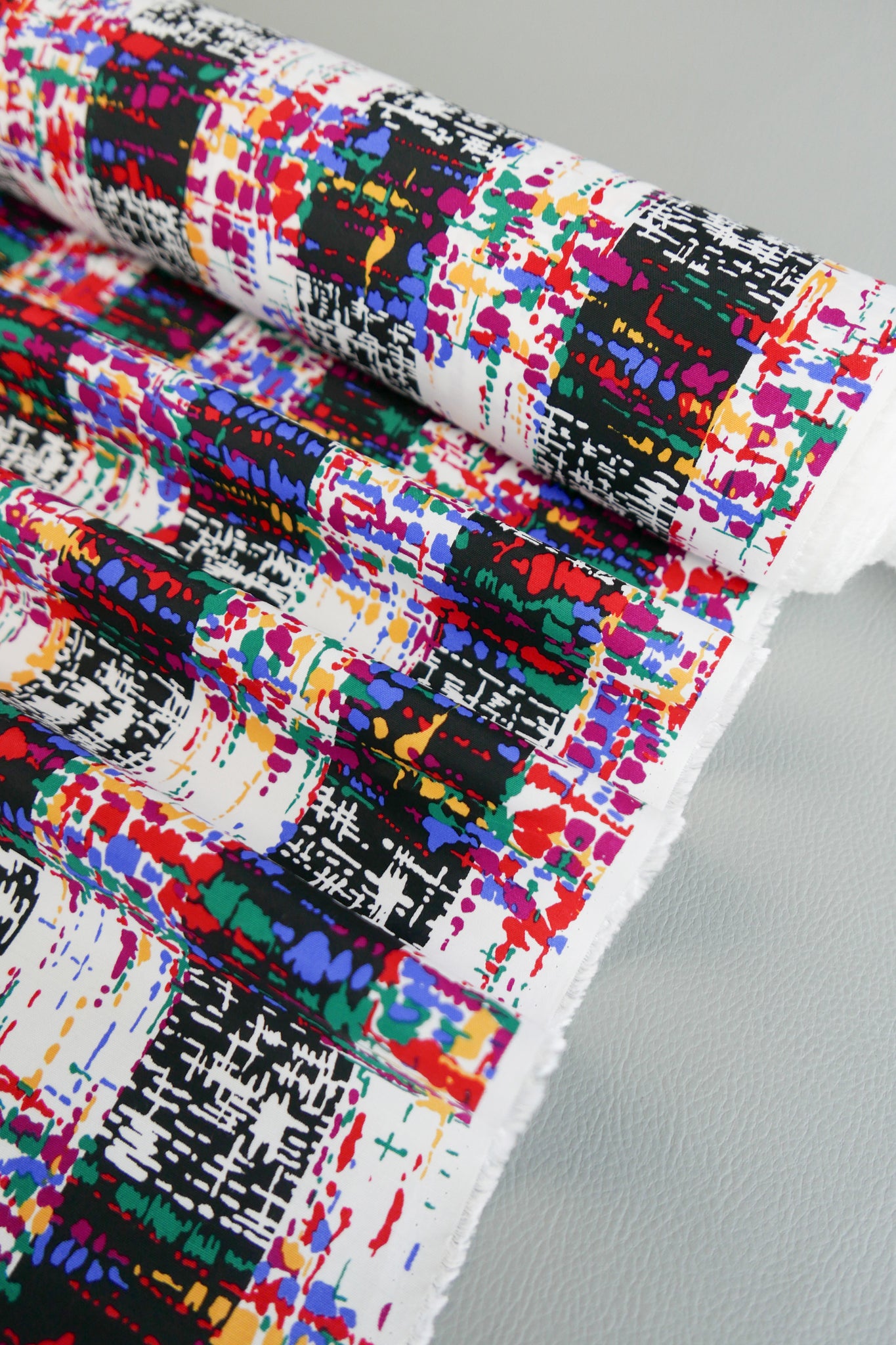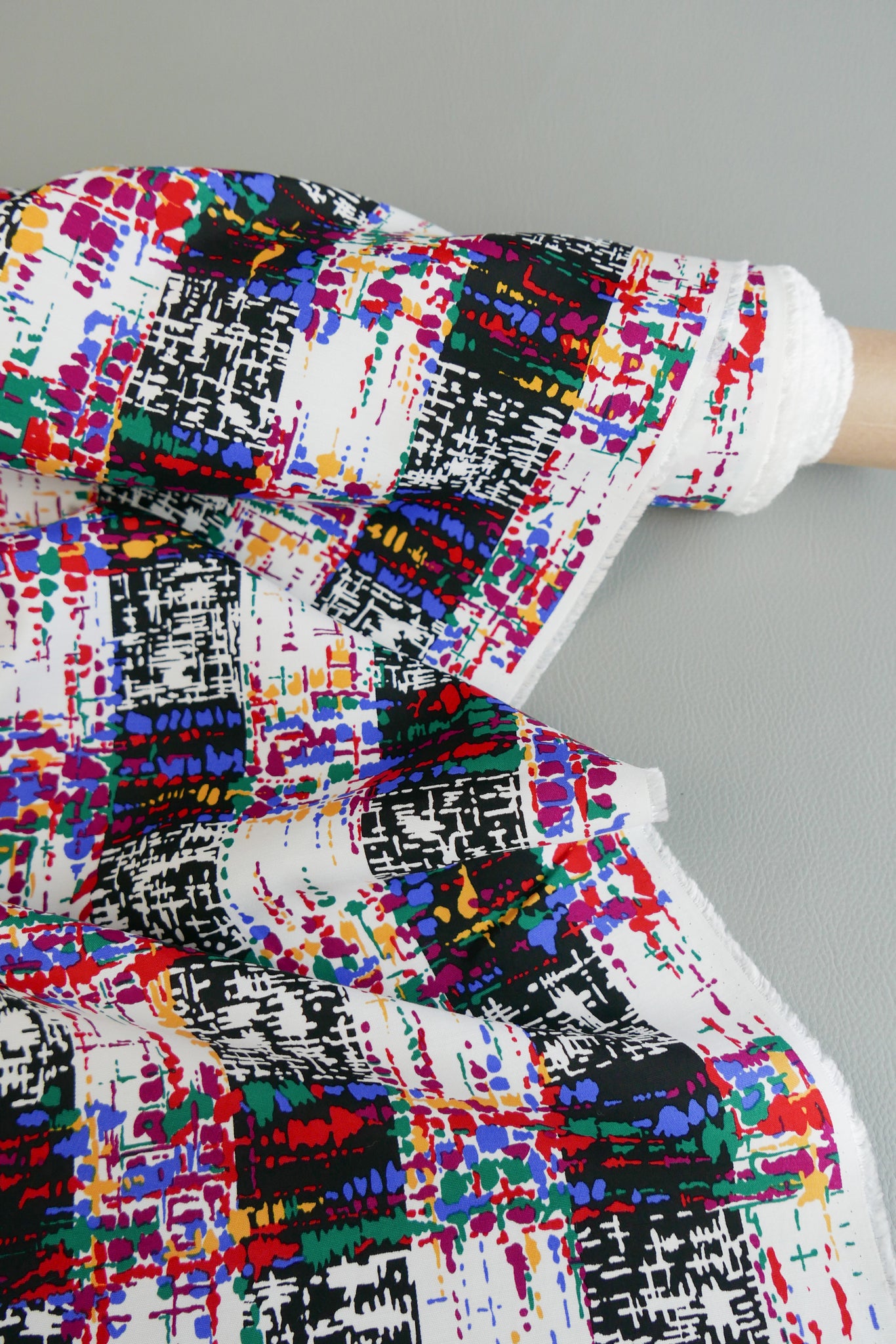 Multi Coda is a striking printed viscose with a nostalgic check print in black and off-white with bright burgundy, green, yellow and blue throughout. Fully opaque and with a soft handle it requires no lining, making for perfect trans-seasonal pieces. Lightweight and with beautiful drape, it is perfect for pleats or gathers and would make into a divine dress, blouse, skirt or sarong.