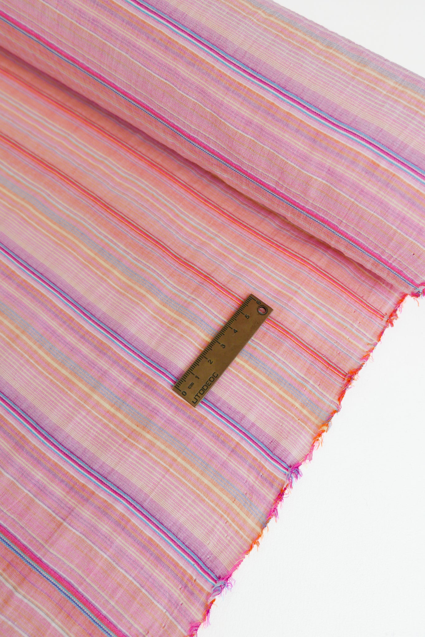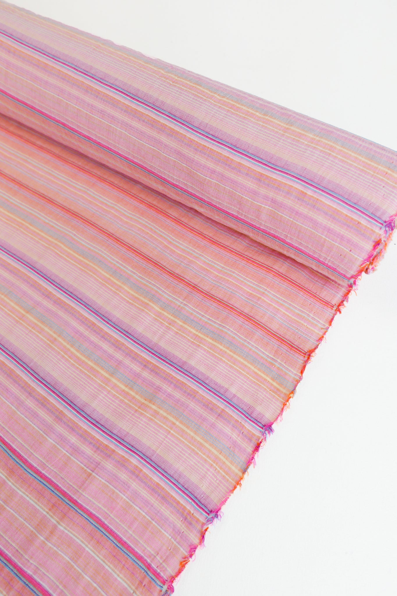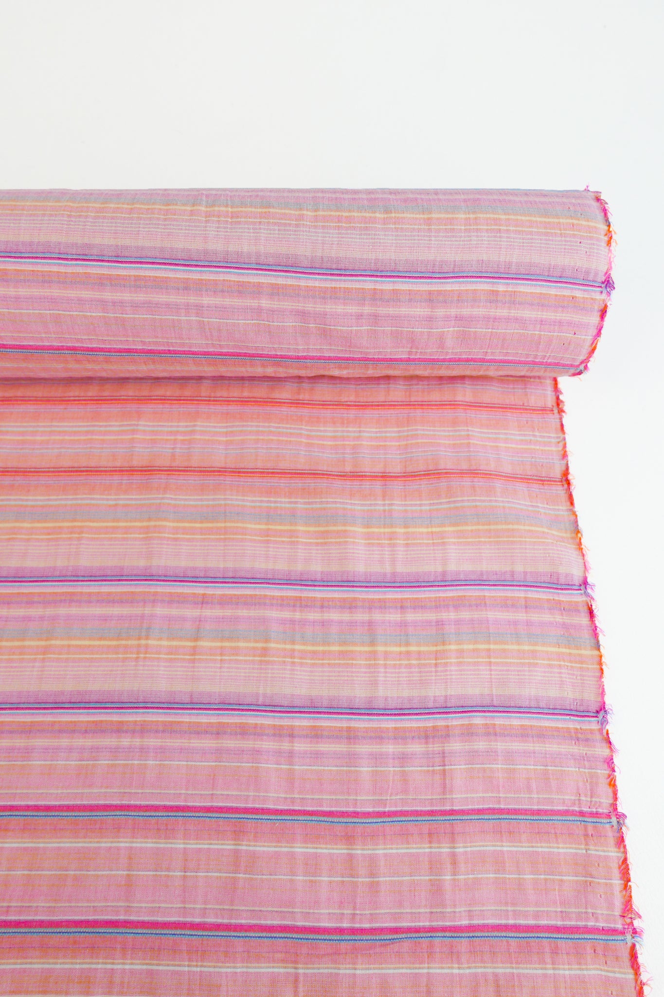 Senorita is a wide-width, textured cotton rayon blend with a crisp finish, giving it added body. It features a yarn-dyed stripe design in blue, purple, orange and different shades of pink with embroidered stripes at irregular intervals. lightweight, it holds structure beautifully. It's completely opaque, and with the longevity that yarn-dyed fabric provides. Senorita will make into standout shirts, dresses, summer pants and skirts.