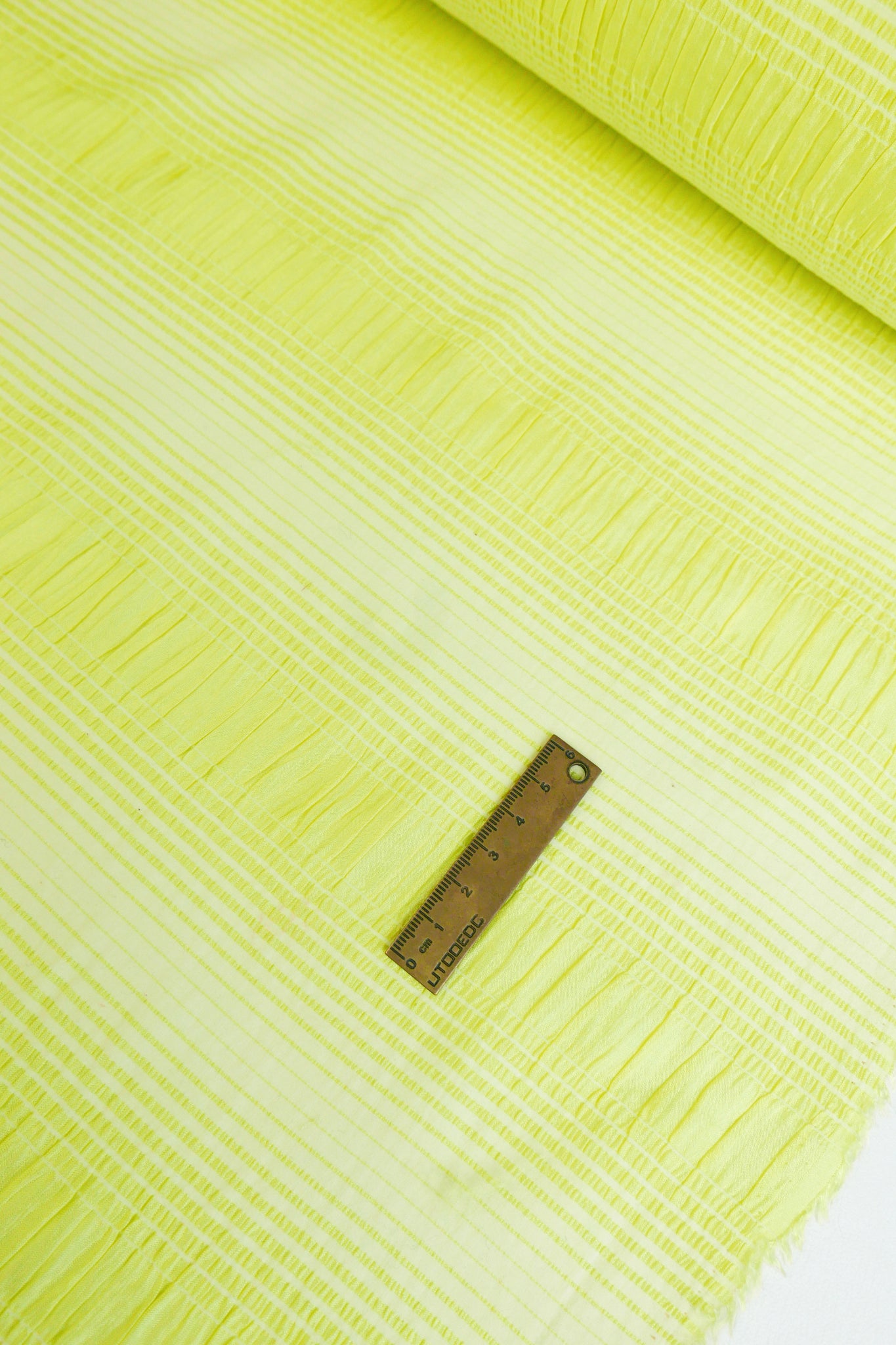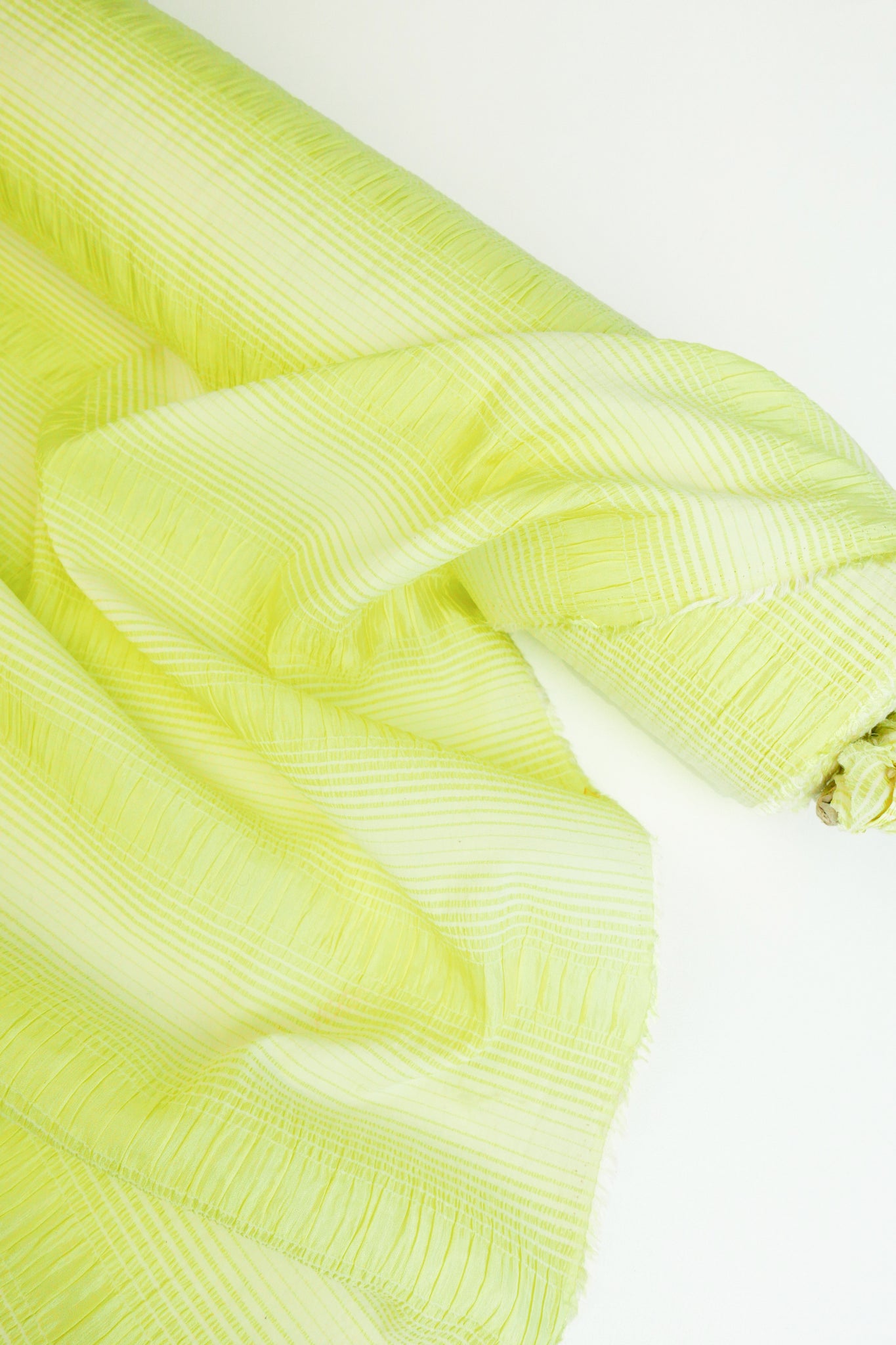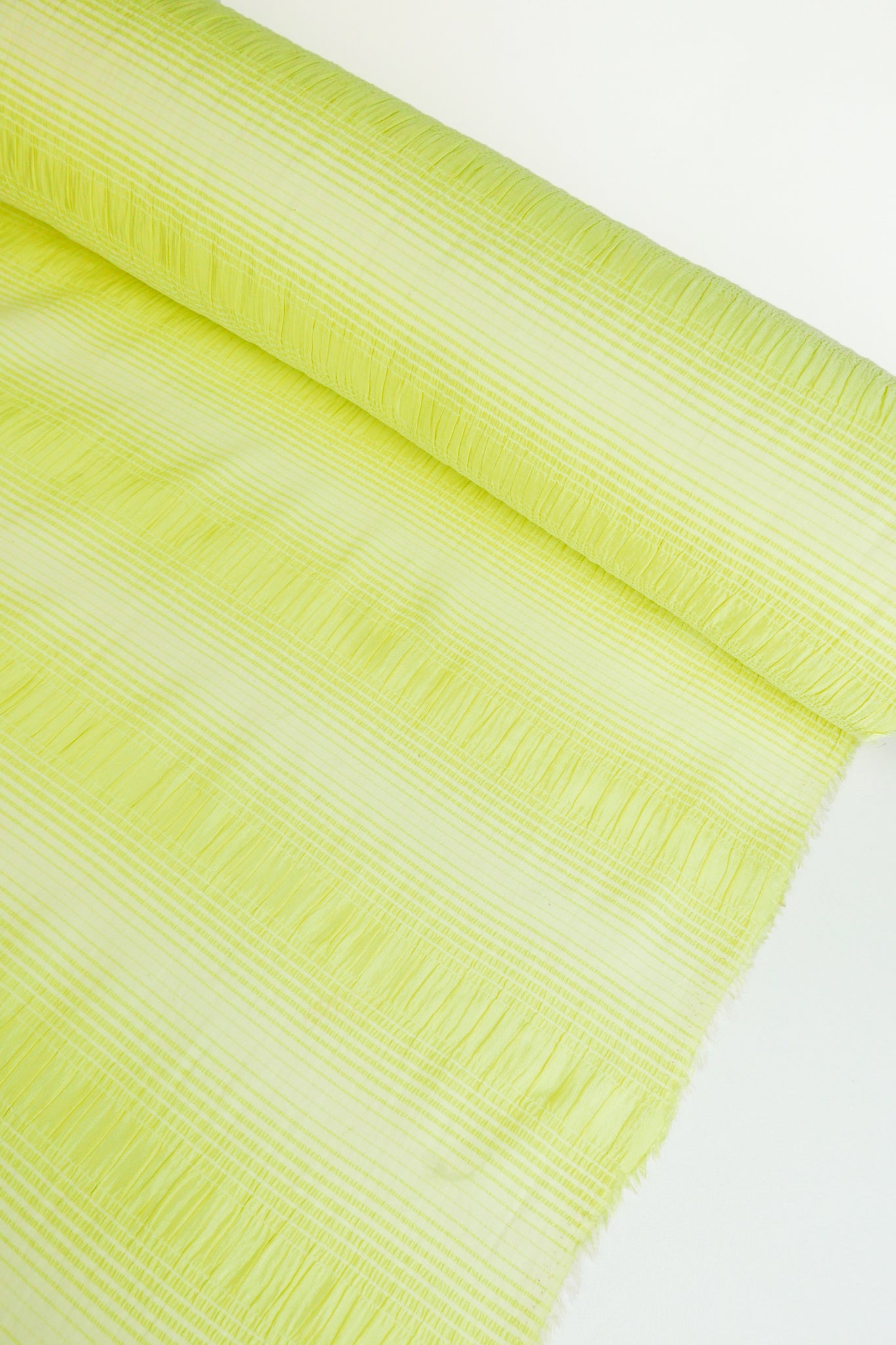 This is a unique pure silk shirred stripes, giving it a tactile, seersucker-like texture. Coming in a delicious lime zest colourway, it is super fine and delicate. Lightweight, with beautiful drape and mostly opaque, it will make into incredible dresses, blouses and more.