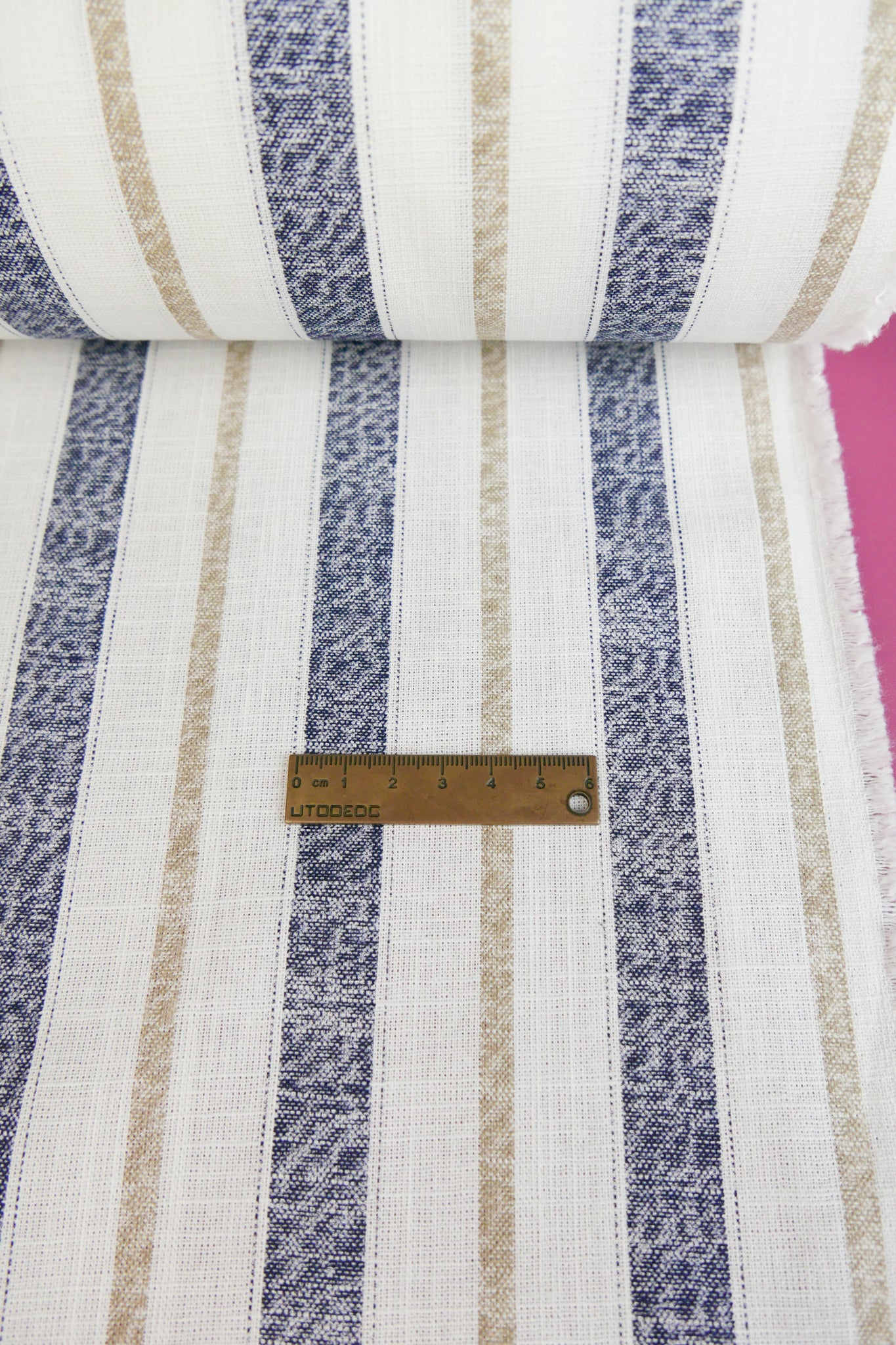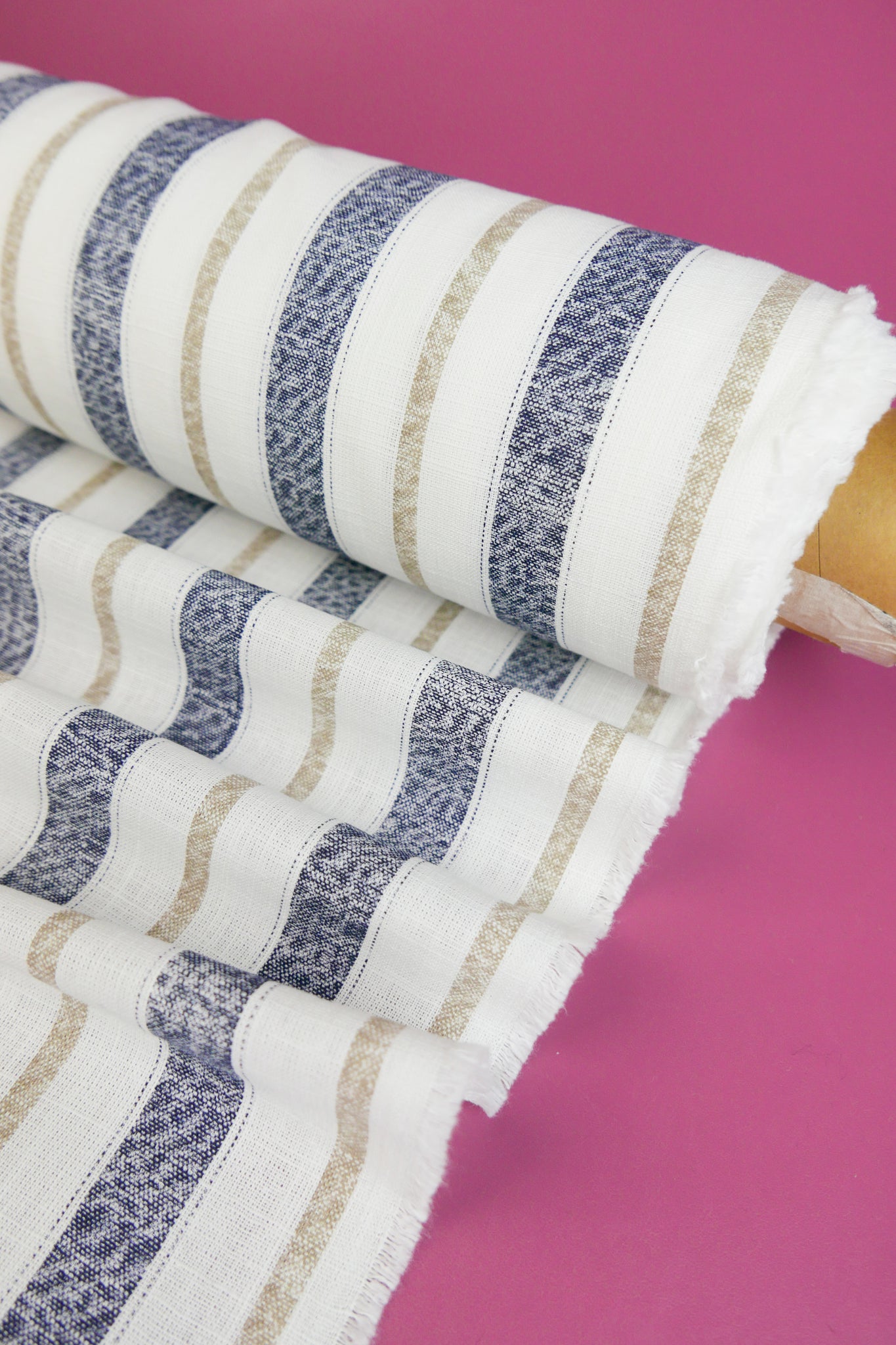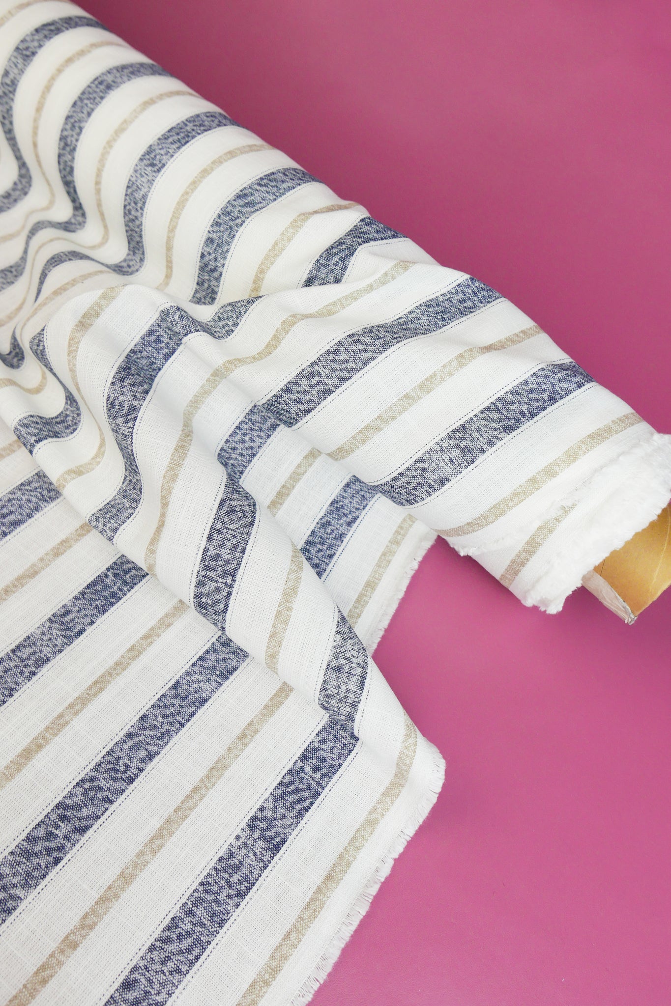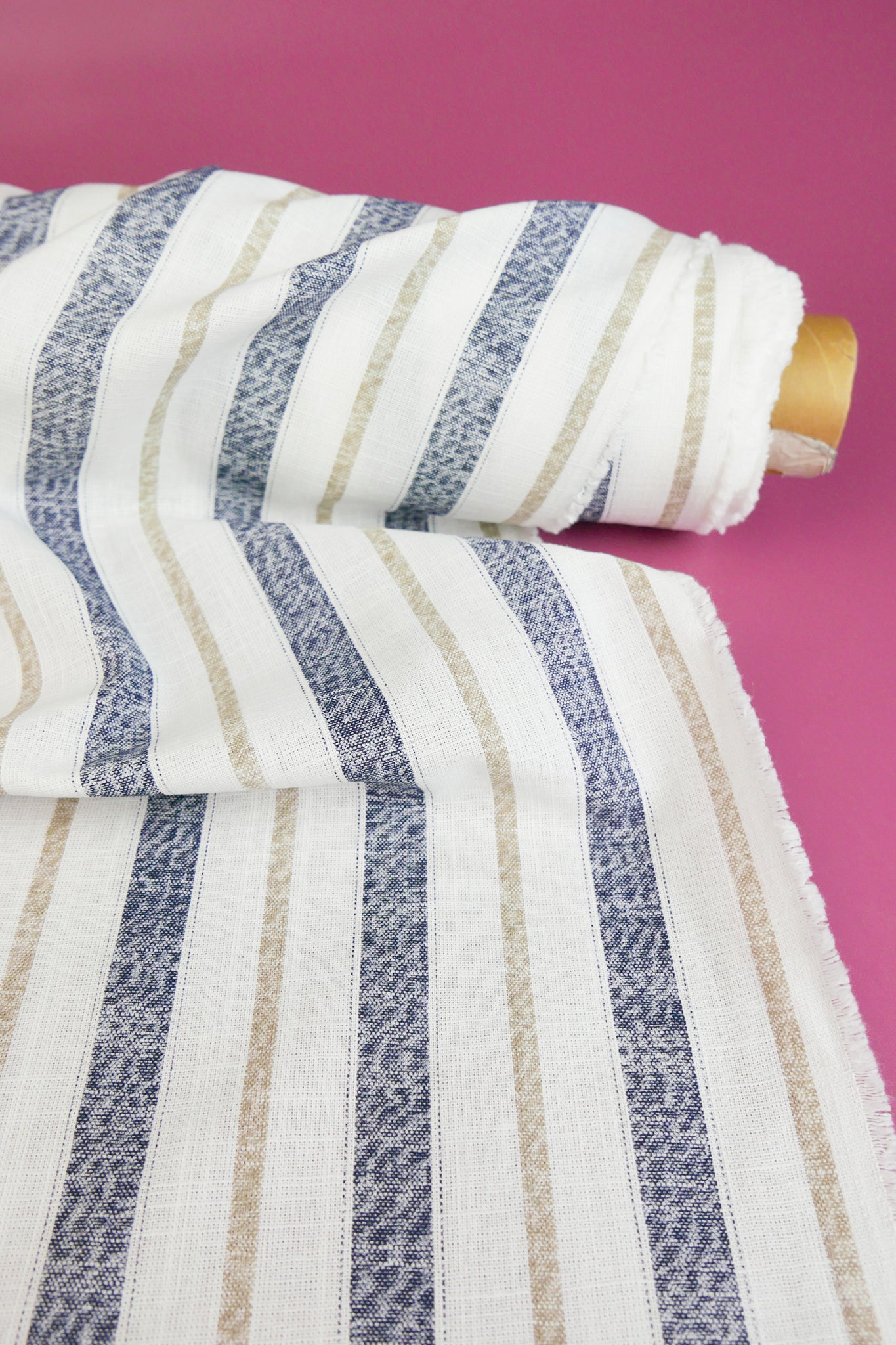 Simon is a classic midweight linen with slubs throughout, with a printed stripe design in navy and beige on an off-white cloth. Mostly opaque, it has a summery, everyday quality to it with good structure. Perfect for summer-weight dresses, blouses and skirts.