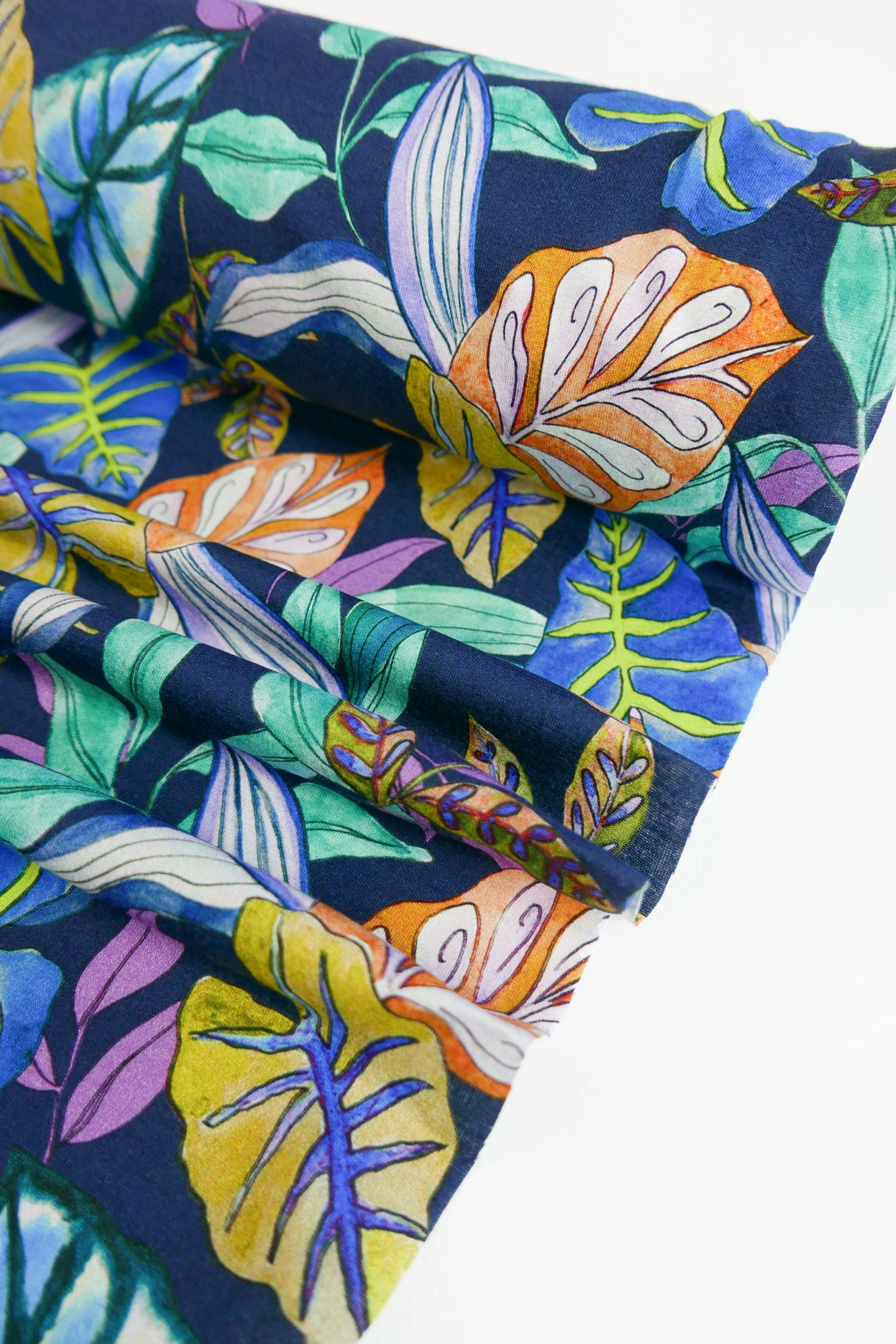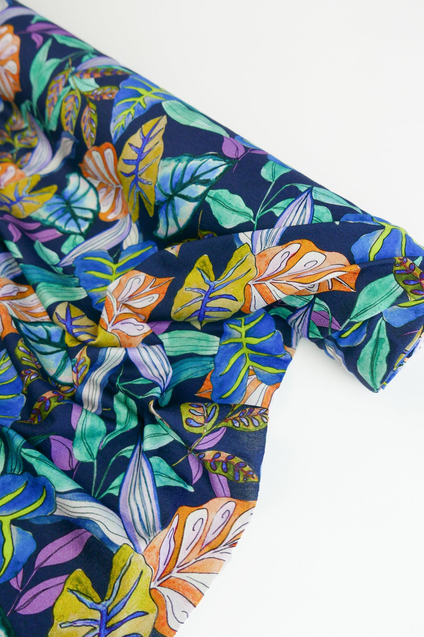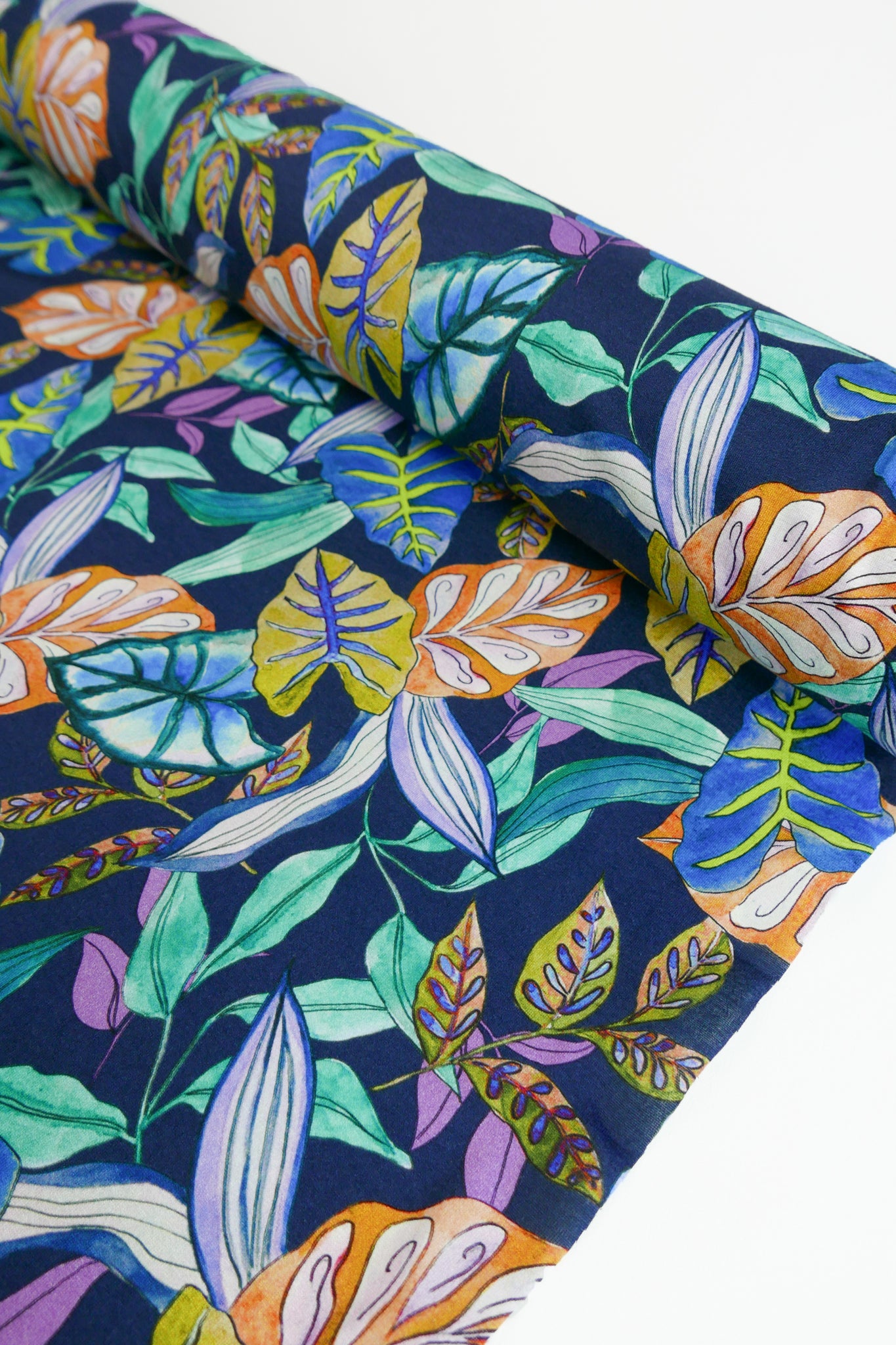 Wonderwall is an extravagant printed viscose knit in a midnight colourway. Lightweight and full of drape, it's perfect to recreate those vintage DVF pieces. It features a vibrant leaf print in blue, green, orange, and more on a midnight blue base cloth. Anti-pill and anti-curl, Wonderwall is completely opaque with four-way stretch. It would make the perfect form-fitting dress, a colourful turtleneck layering piece, a show-stopping bias-cut piece or the cutest lounge set.