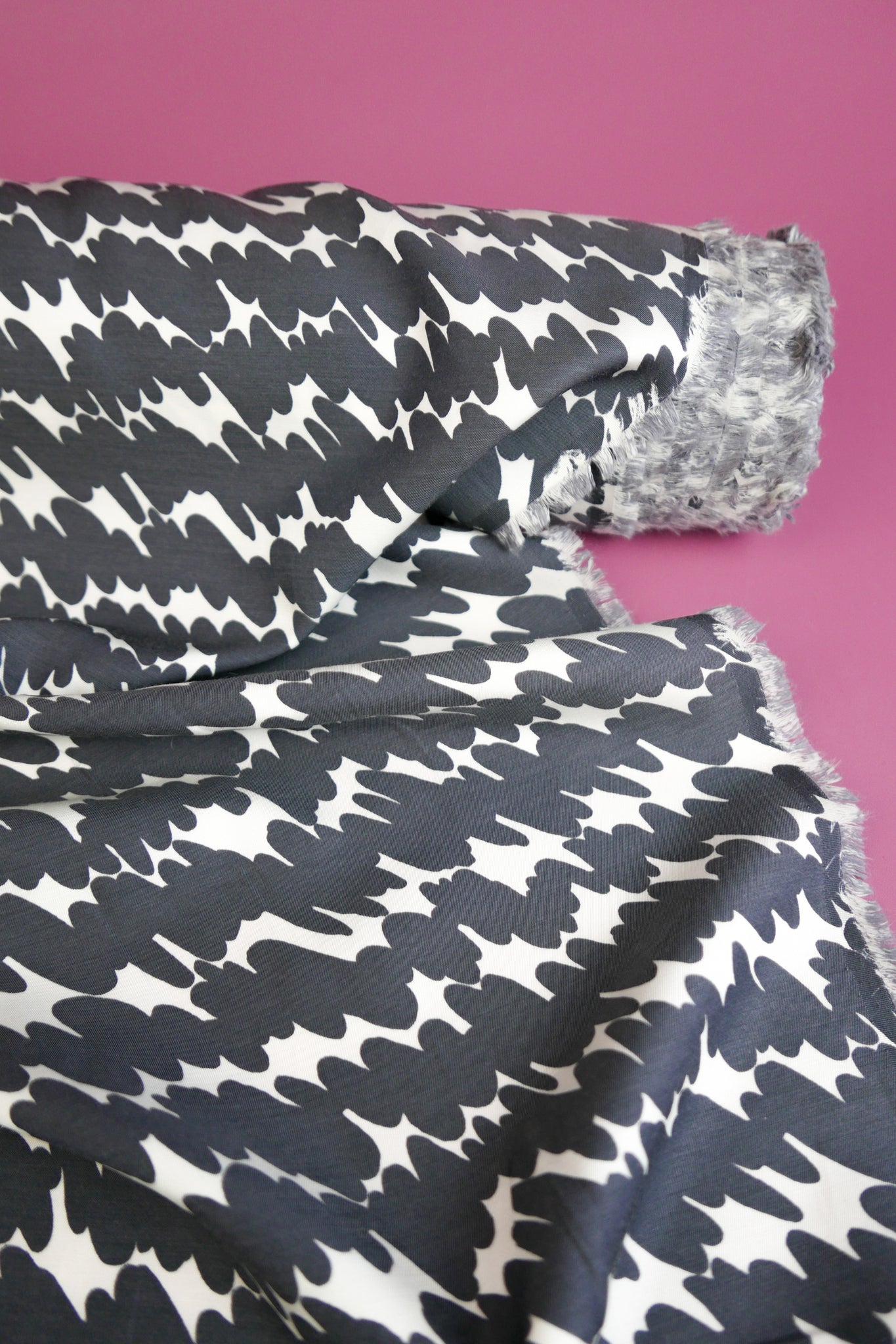 This is a beautiful, lightweight silk with a printed scribble design in charcoal on an off-white base cloth and a fine twill. Completely opaque, it would be the perfect fabric for luxe silk blouses, shirts, skirts or dresses.