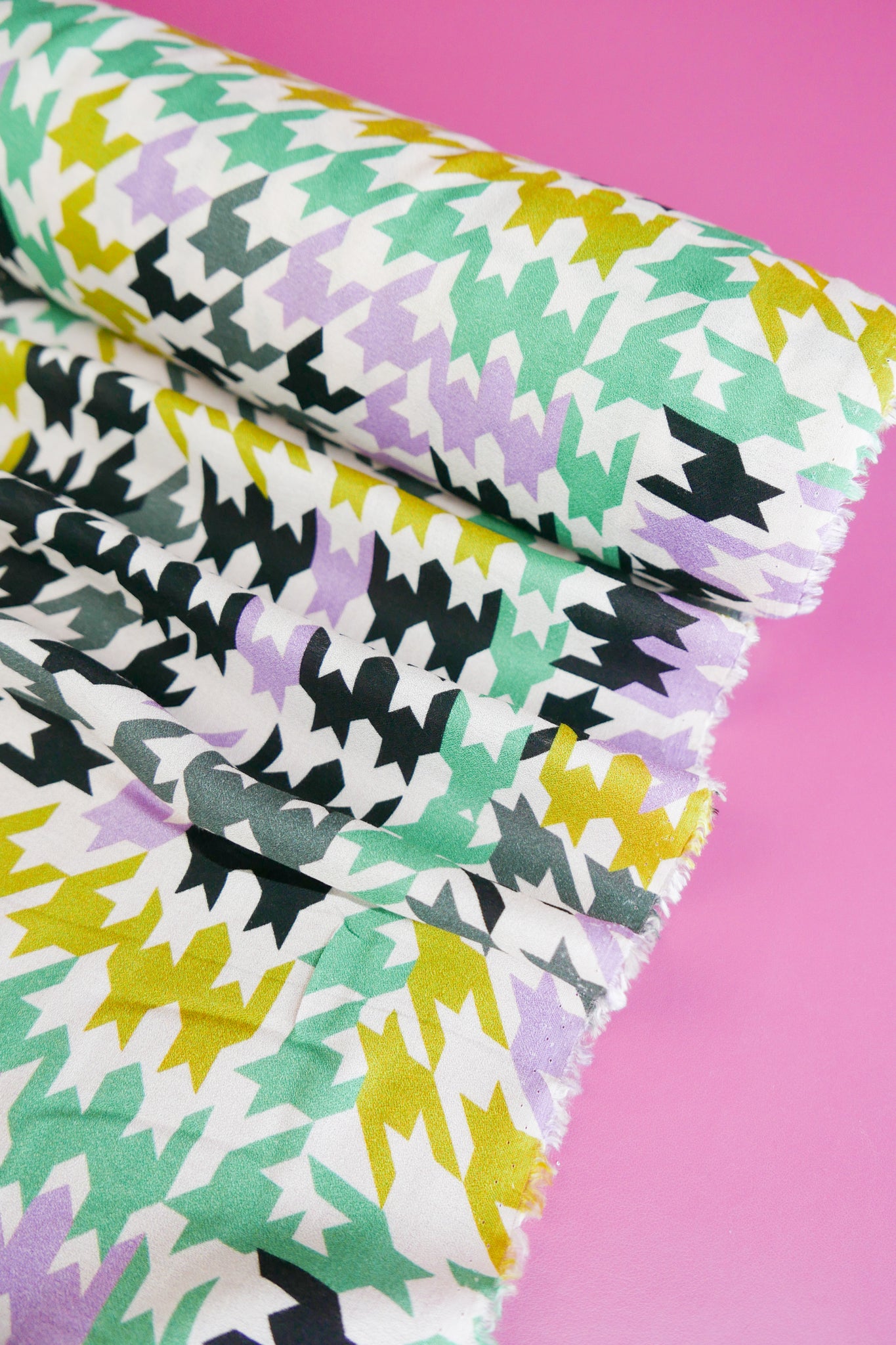 Nadira is a pretty viscose crepe featuring a houndstooth print in lavender. Lightweight and mostly opaque, it has a beautiful, soft, textured handfeel and won't crease easily. Nadira will hold detailed frills well, making for perfect statement tops, dresses, flowy pants or skirts.