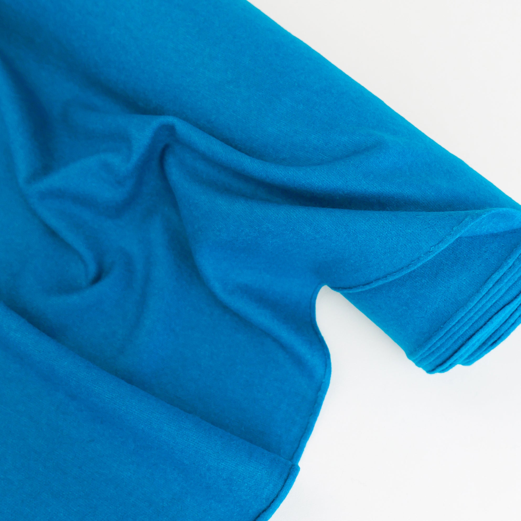 Bethany is a lovely midweight boiled wool coming in azure blue. It has a tight-knit weave and mechanical stretch, giving it plenty of body and a beautiful, structured drape. It has a fine finish, and being boiled is also moisture-wicking and odour-free. Bethany is ideal for unlined draped jackets, cardigans, wrap coats, trans-seasonal layering pieces, or babywear.