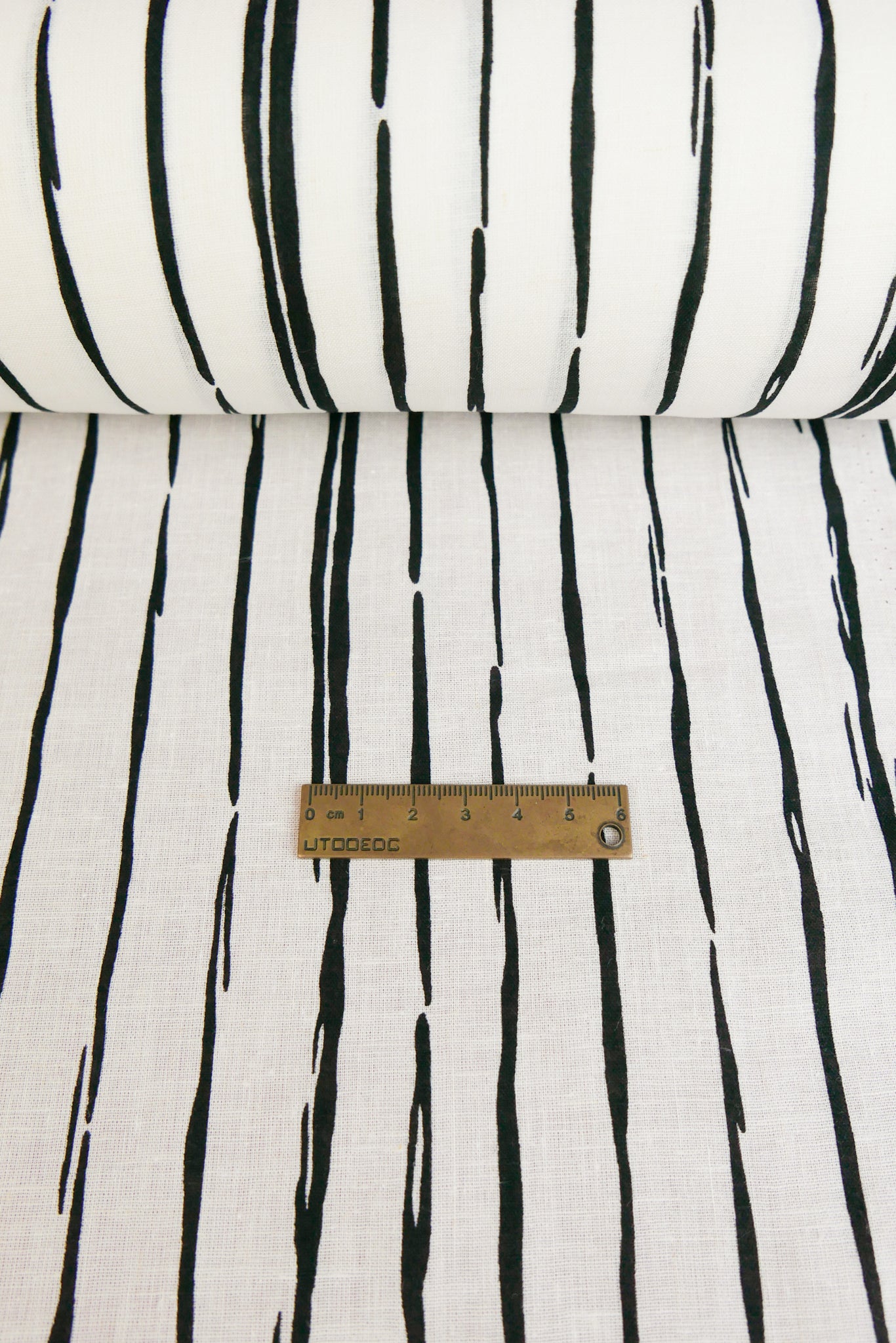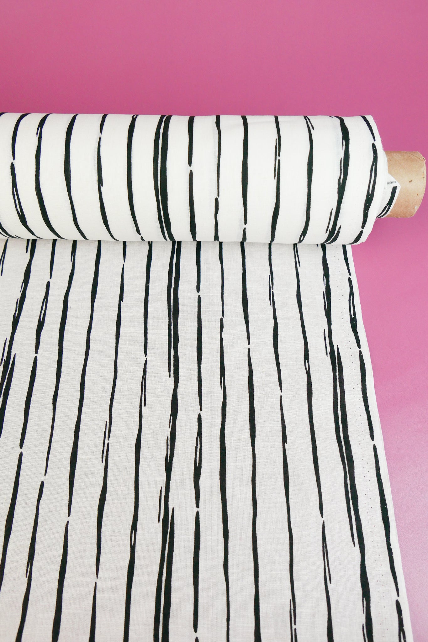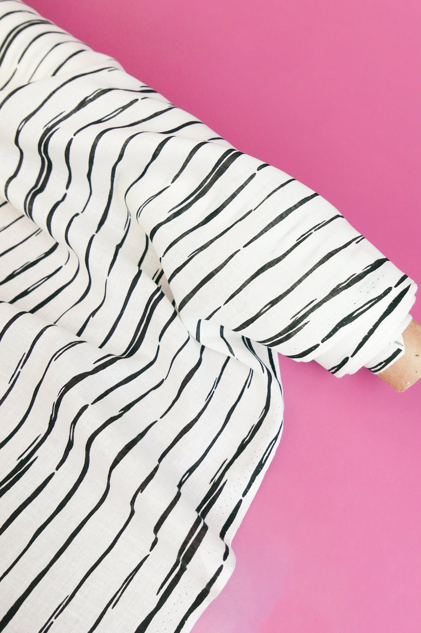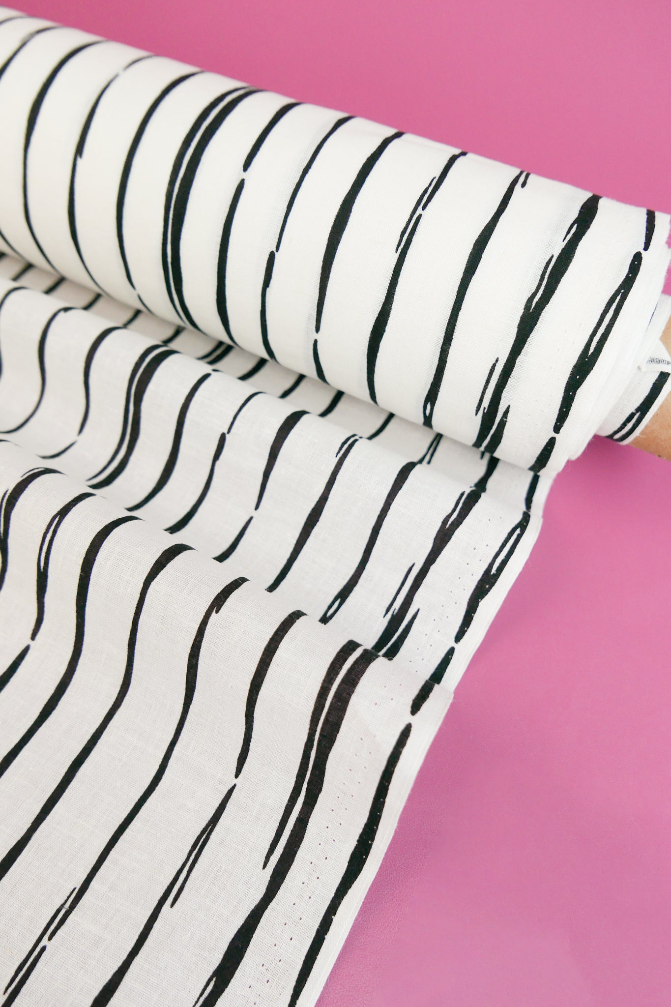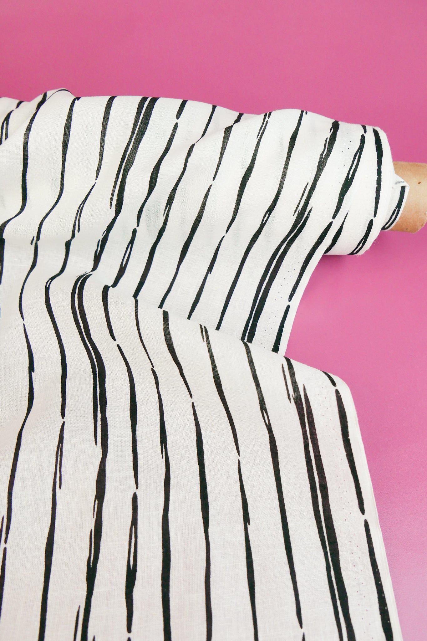 Christopher is a fun, printed linen cotton featuring a brushstroke stripe design in black against an off-white cloth. Lightweight, it has a soft, smooth finish and holds structure beautifully, and being a blend, it doesn't crease as easily as pure linen. Completely opaque, it's the perfect weight for shirts, dresses, summer pants and skirts that you won't want to take off.