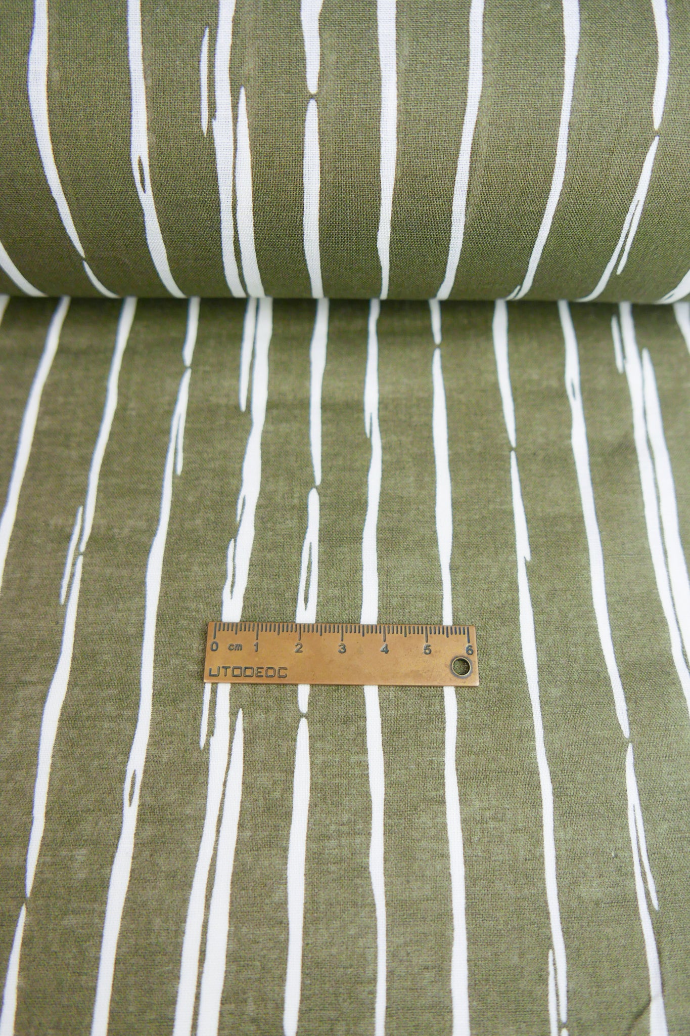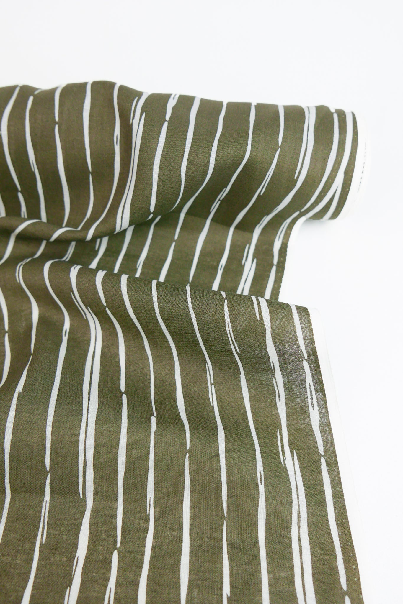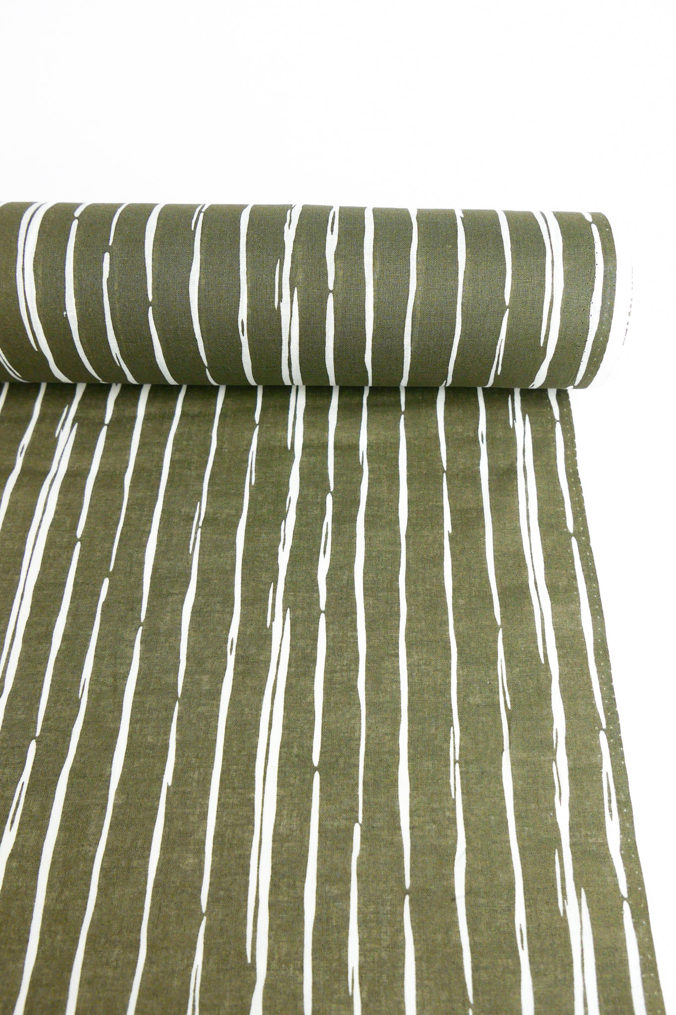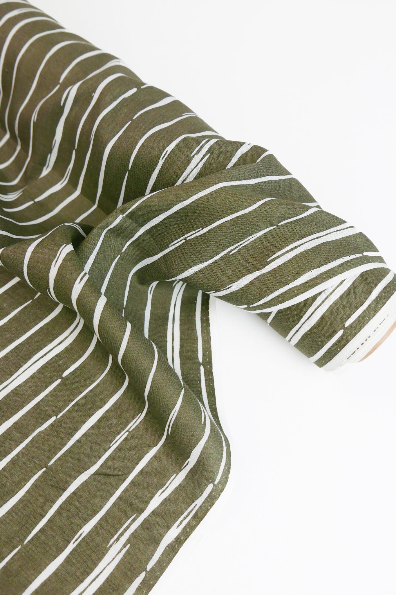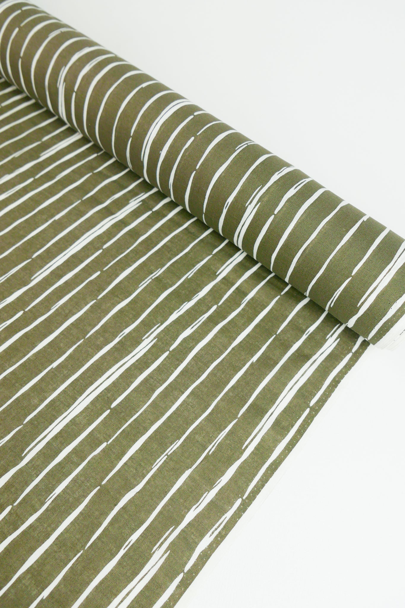Christopher is a fun, printed linen cotton featuring a brushstroke stripe design in off-white against an olive cloth. Lightweight, it has a soft, smooth finish and holds structure beautifully, and being a blend, it doesn't crease as easily as pure linen. Completely opaque, it's the perfect weight for shirts, dresses, summer pants and skirts that you won't want to take off.