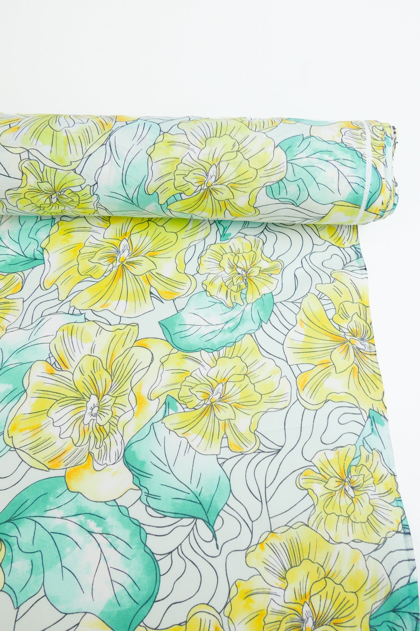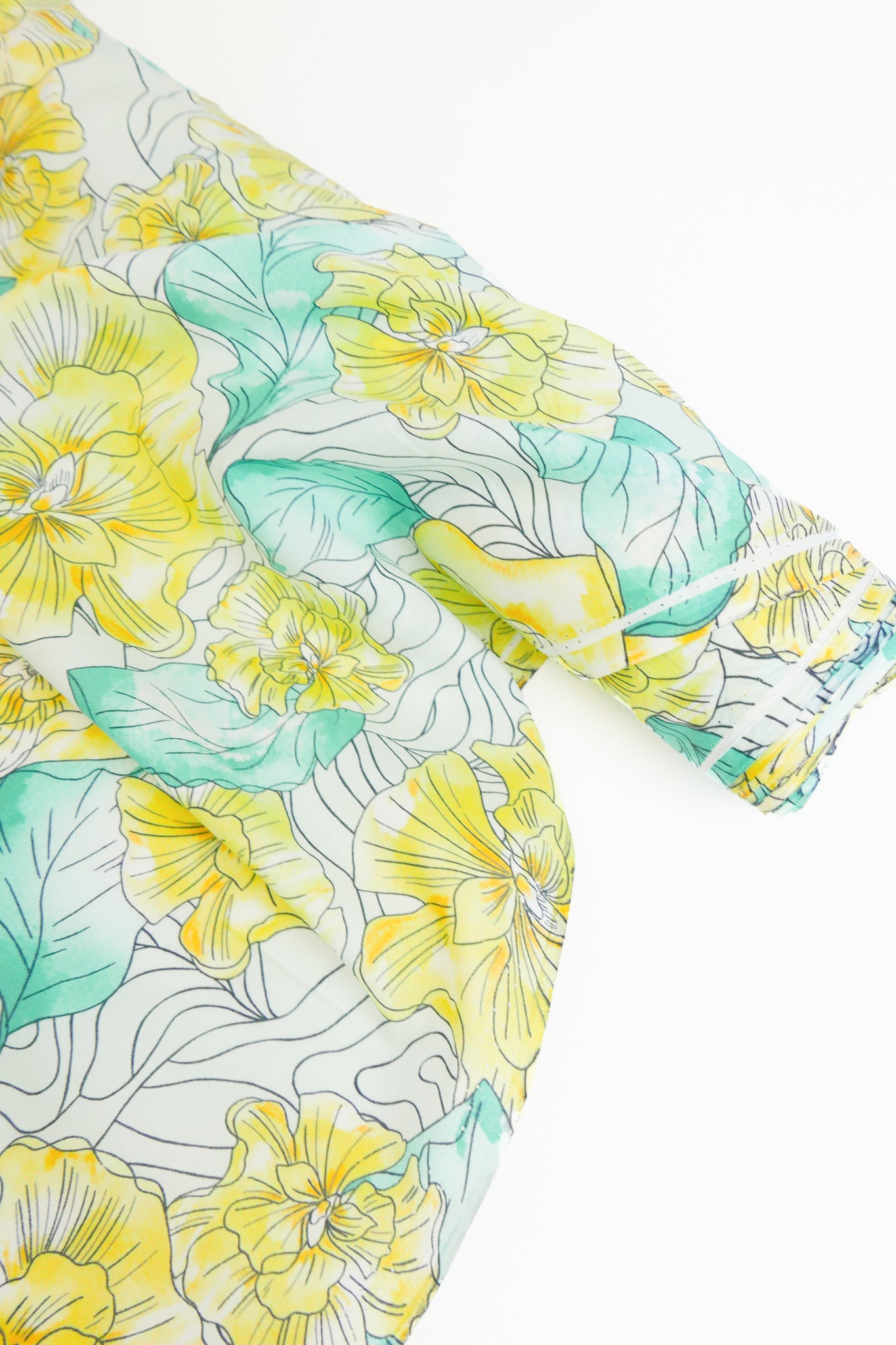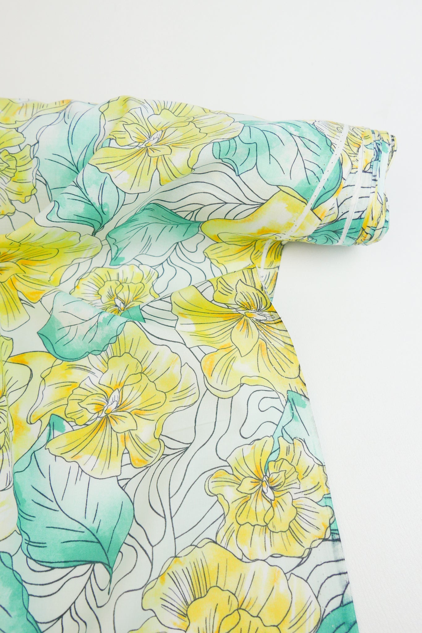 A luxurious essential to any wardrobe, this cotton voile features a beautiful floral print in soft yellow and green on an off-white cloth. 100% cotton, it is lightweight and has a supremely soft hand feel. Mostly-opaque and holding soft structure, it would make into the perfect dress, shirt, skirt, or luxurious lining.