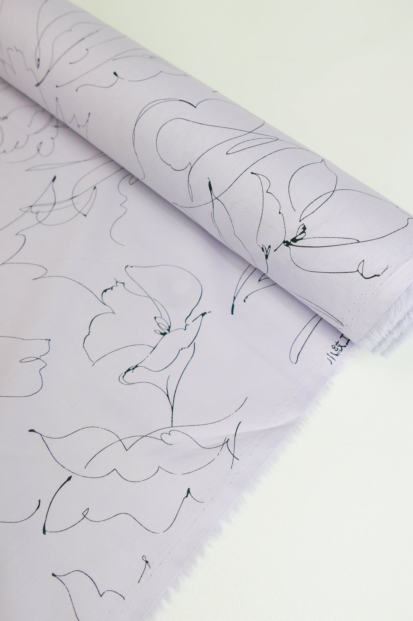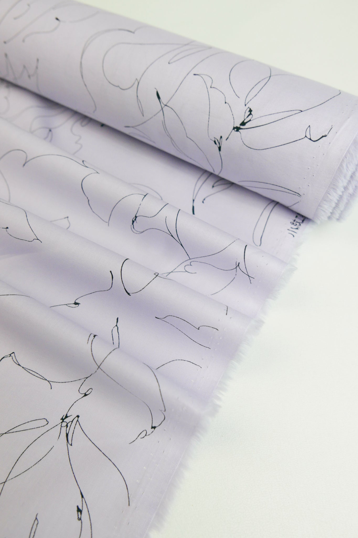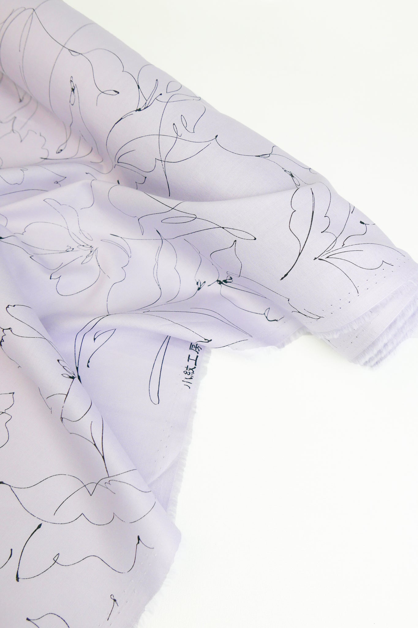 A luxurious essential to any wardrobe, this silky soft Japanese cotton lawn features a beautiful hand-drawn-style floral print in black on a light lavender base. 100% cotton, it is lightweight and has a supremely soft hand feel. Semi-opaque and holding soft structure, it would make into the perfect dress, shirt, skirt, or luxurious lining.