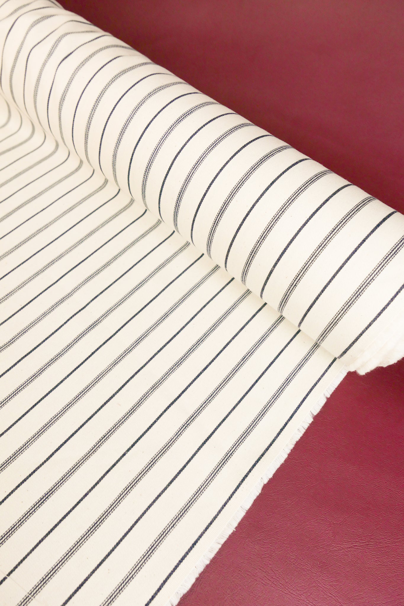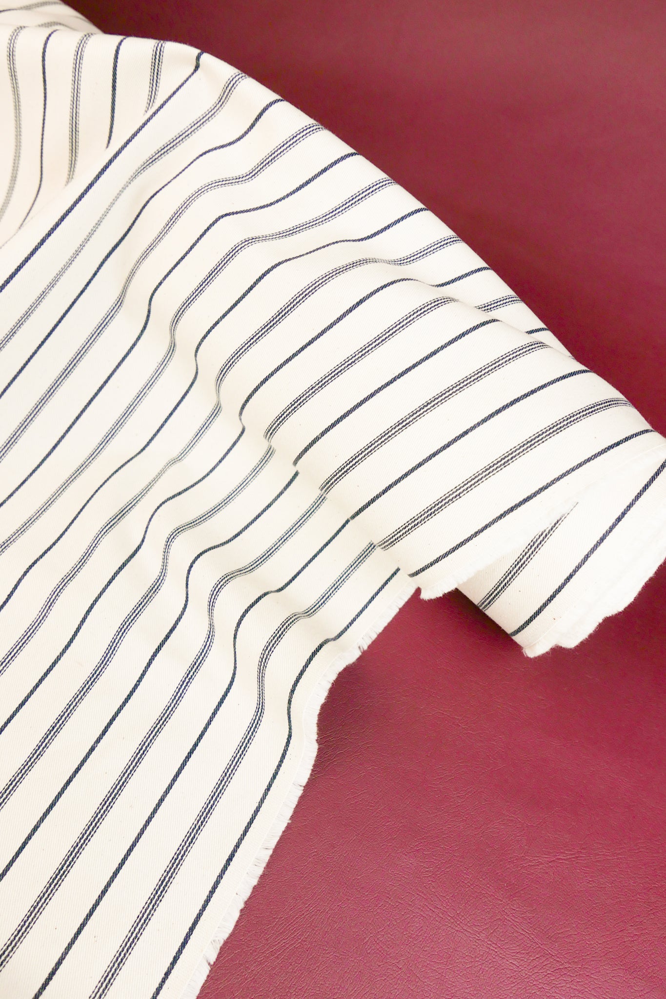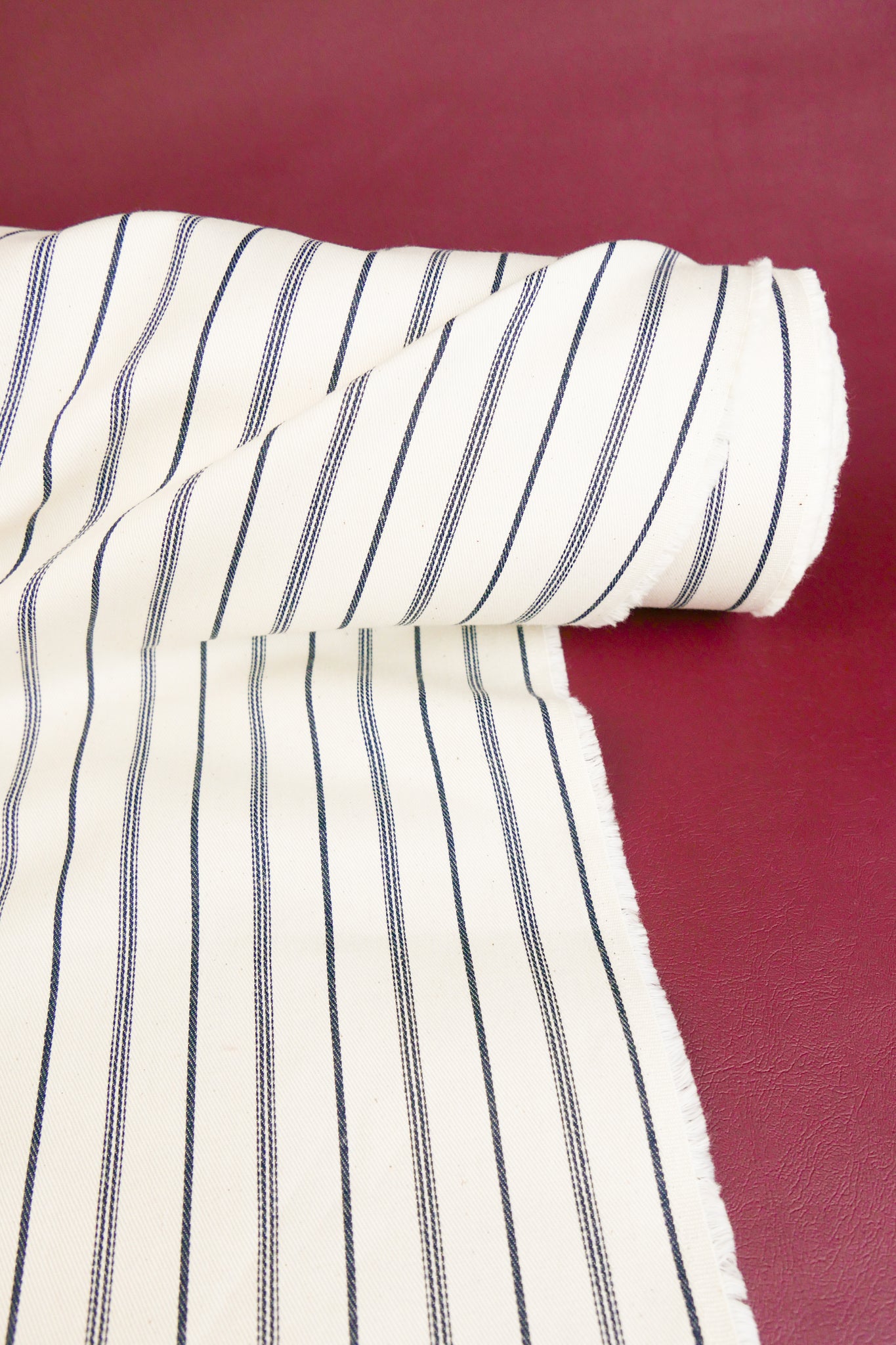 Asahi is a super delicious cotton shirting in a light bone colourway with a yarn-dyed stripe in navy. It has a tightly woven twill, giving it an interesting midweight that holds structure well and a lovely, smooth handfeel. Fully opaque, Asahi is ideal for shirts, dresses and summer-weight trousers.