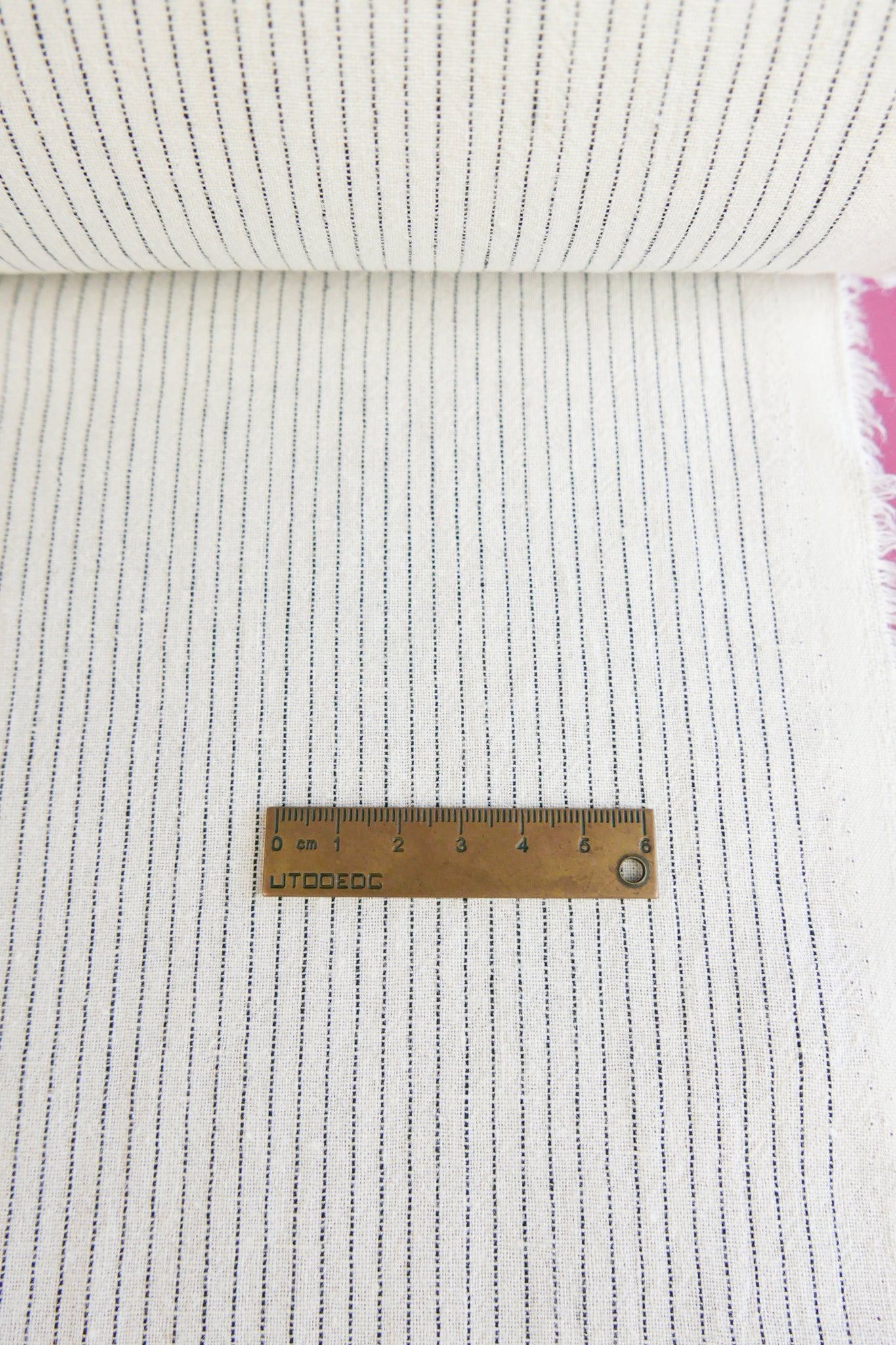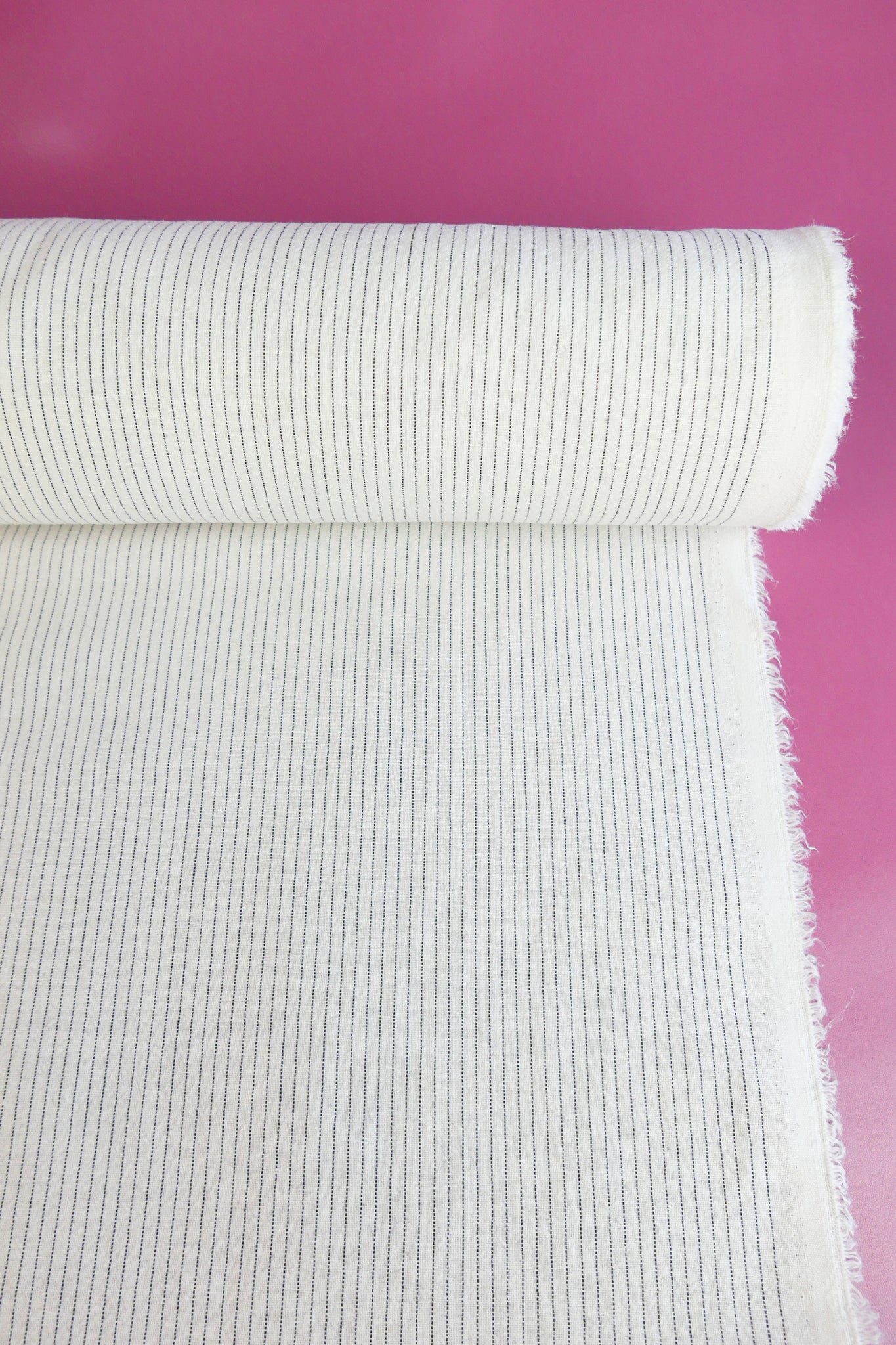 This is a beautiful classic linen with a yarn-dyed navy pinstripe on an off white cloth. With its slubbed texture, it is deliciously tactile and completely opaque. It has an everyday quality to it with good, structured drape, and would be perfect for dresses, blouses, skirts and homeware.