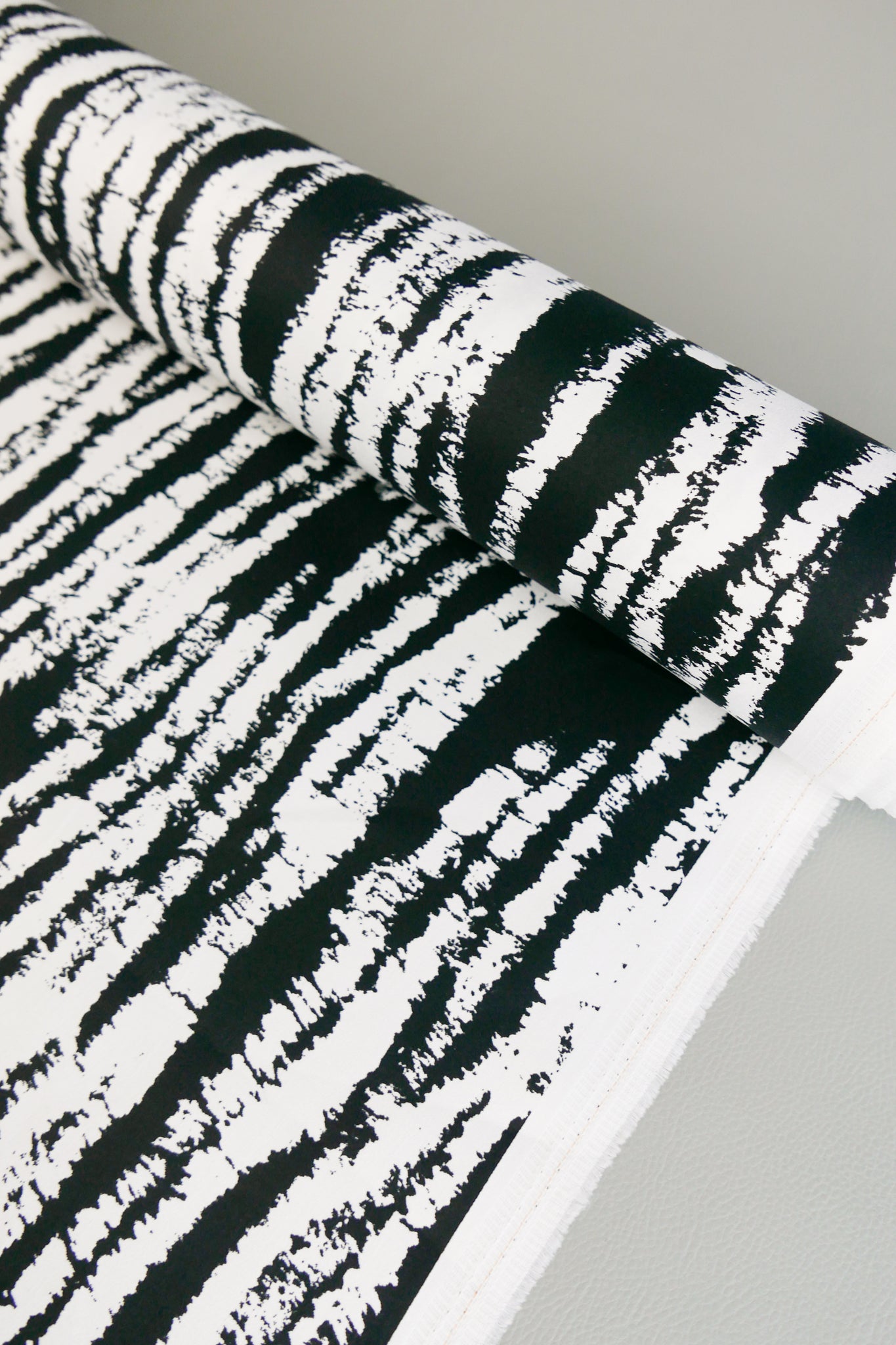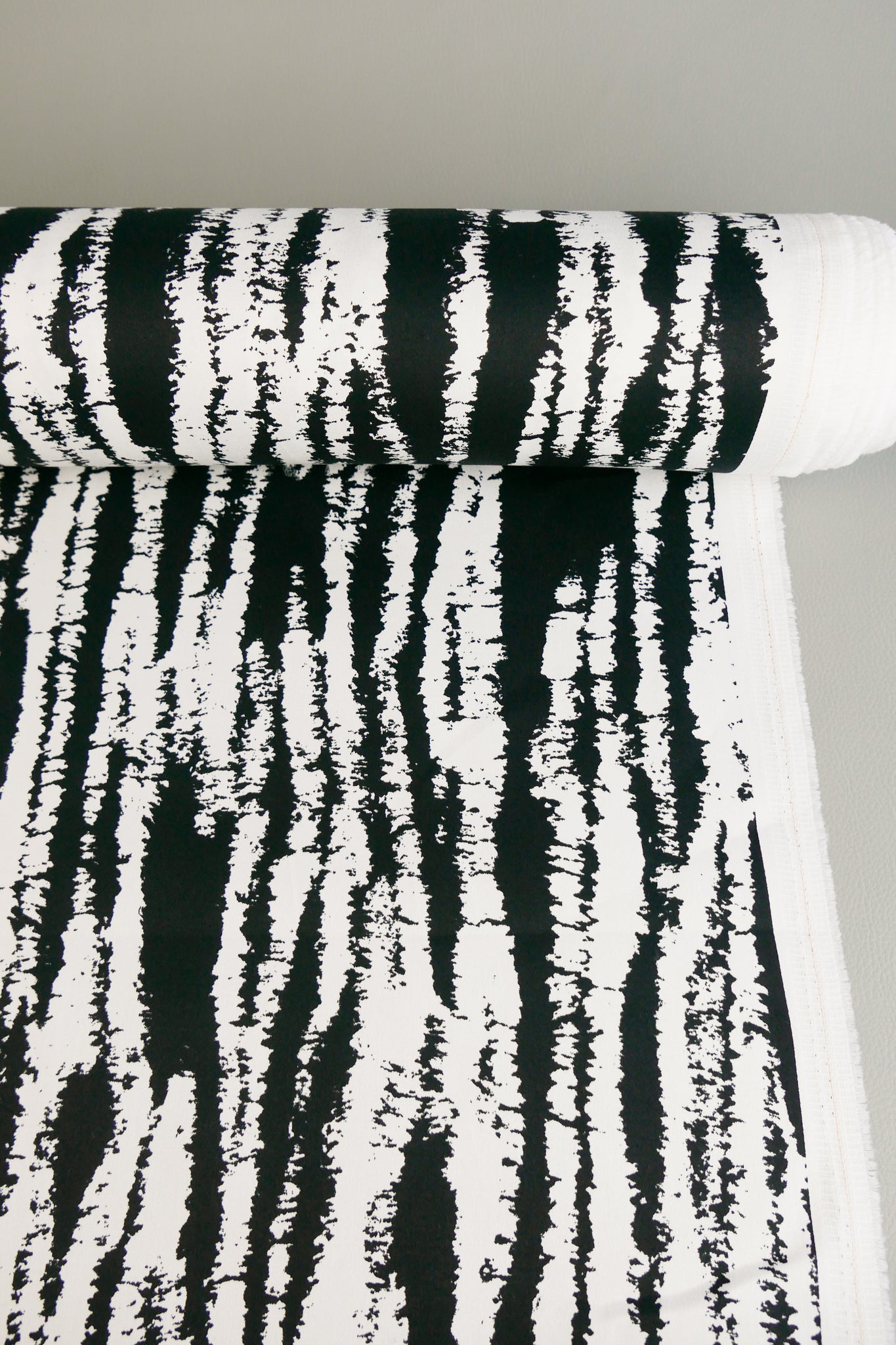 Yvonne is a striking cotton sateen with an abstract printed zebra design in black and off-white. Being a sateen, it has a muted sheen and beautiful structured drape. Mostly opaque, it would make a stunning dress, blouse or skirt and is perfect for bias-cut garments.