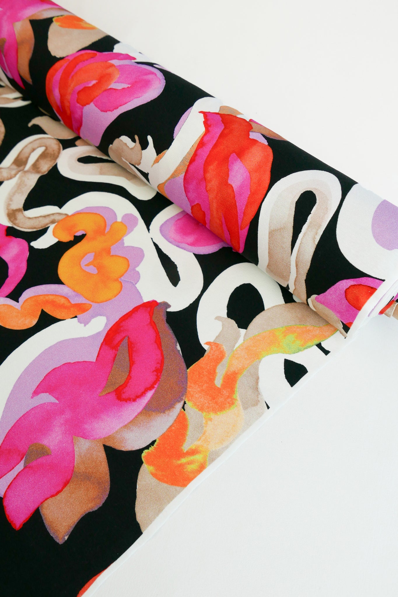 Jimi is an extravagant printed viscose knit in an arancia colourway. Lightweight and full of drape, it's perfect to recreate those vintage DVF pieces. It features a vibrant print in pink, orange, soft brown and black on an off-white base cloth. Anti-pill and anti-curl, Jimi is completely opaque with four-way stretch. It would make the perfect form-fitting dress, a colourful turtleneck layering piece, a show-stopping bias-cut piece or the cutest lounge set.