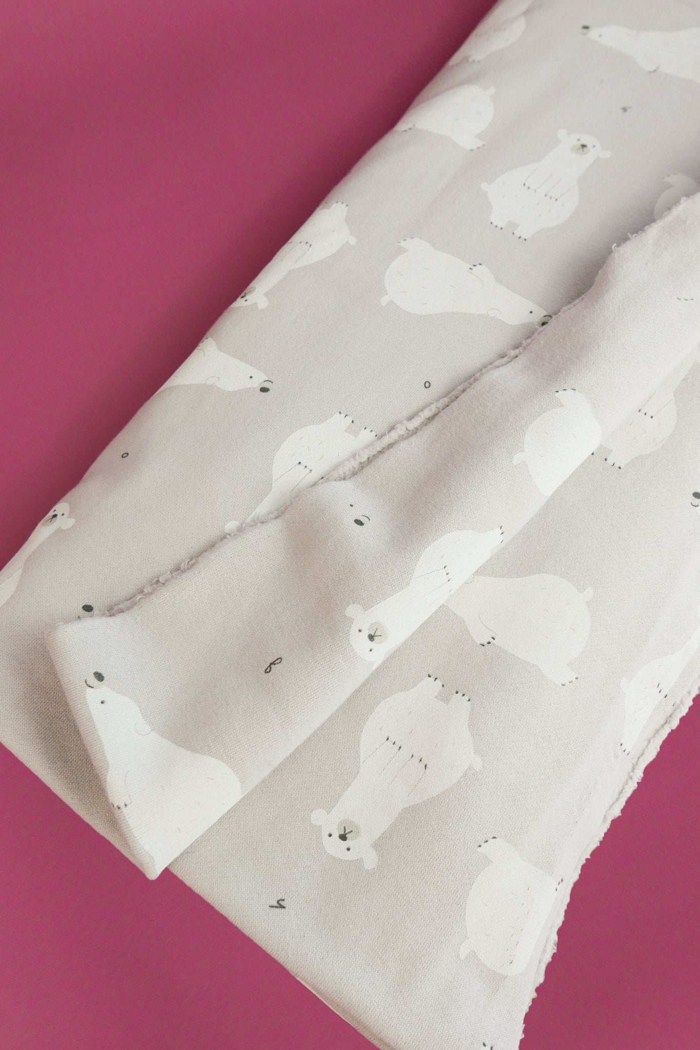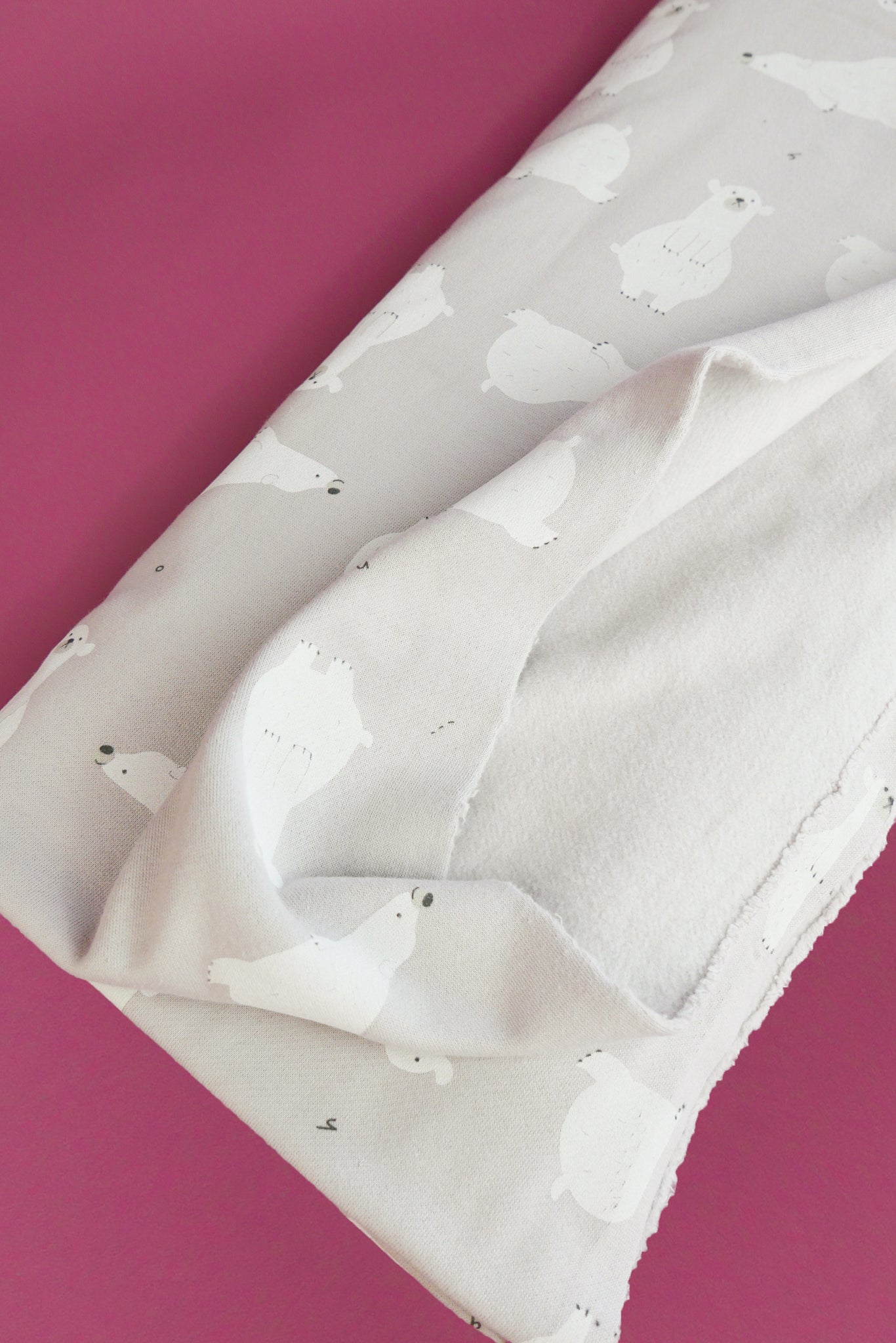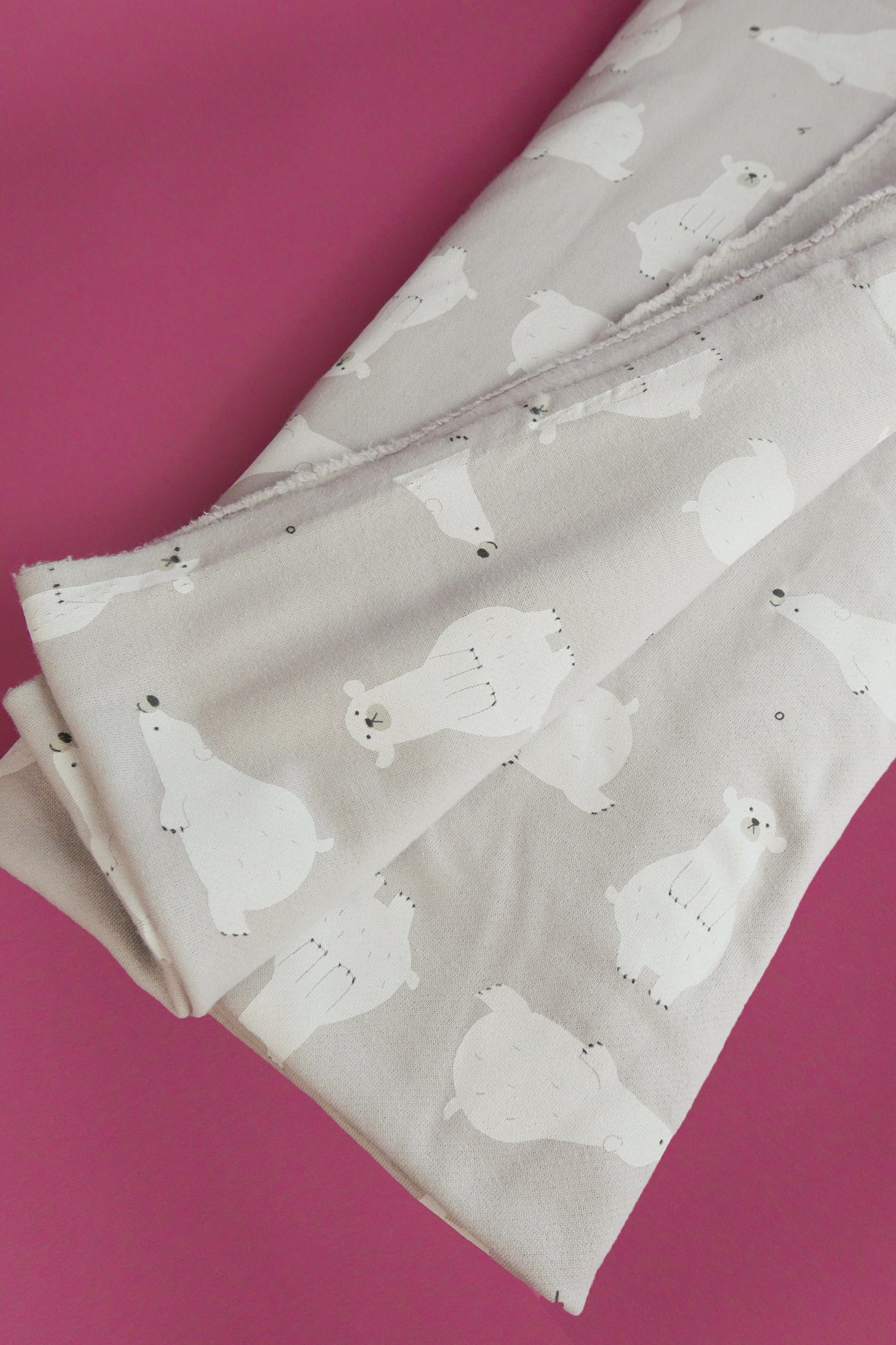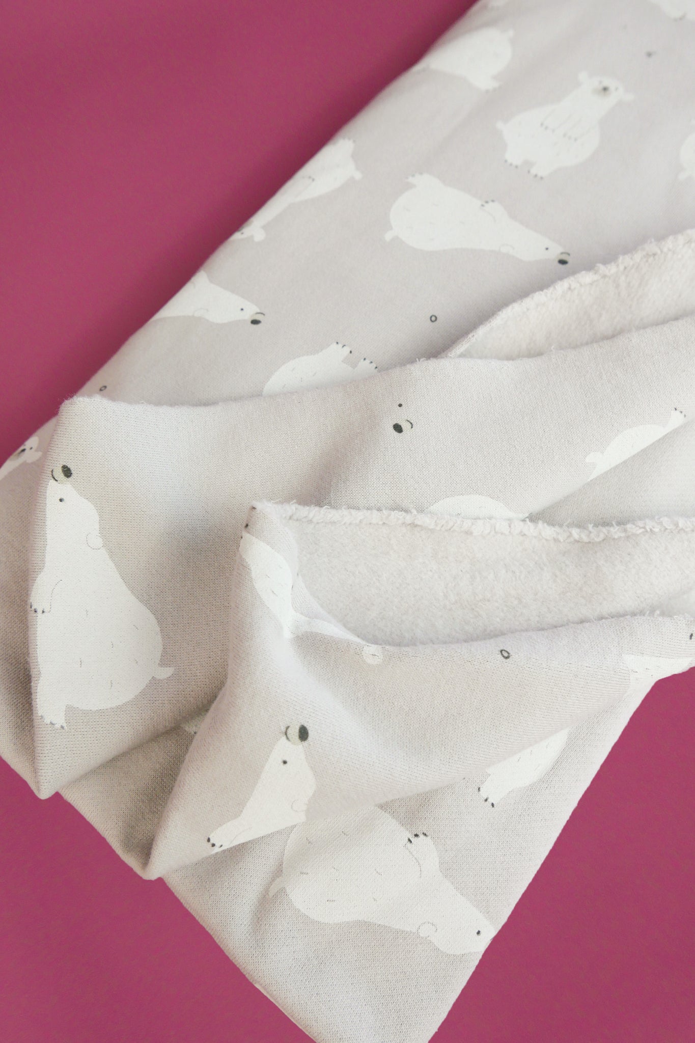 Toblerone is an adorable printed sweatshirting with a polar bear print on a cloud grey cloth. It features a cozy brushed finish on the reverse, giving it a supremely soft feeling on skin, and a superior ribbed texture on the right side. To top it off, this knit's generous width makes it a no-brainer for any project.